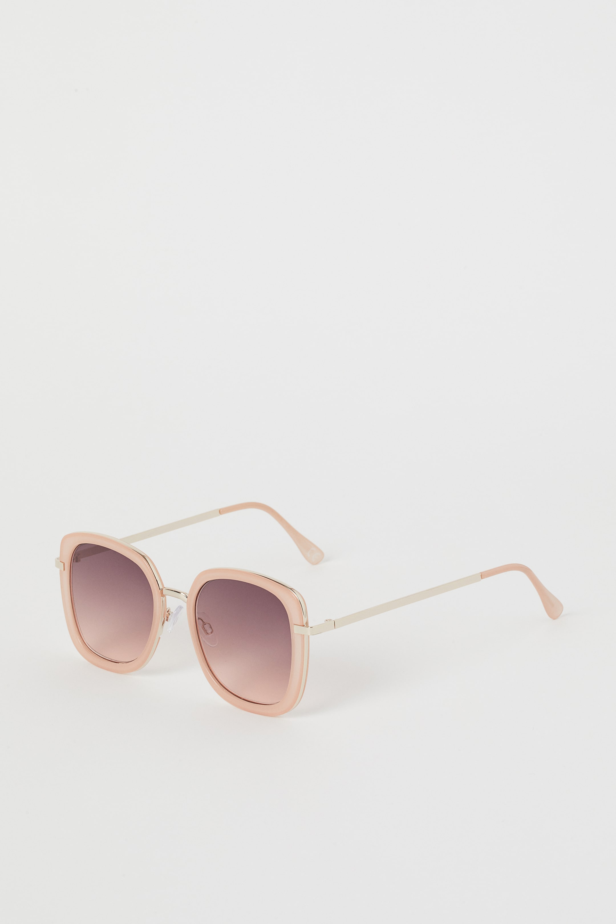Правоъгълни слънчеви очила с рамка от пластмаса и метал. С тесни странични елементи, регулиращи се наносници и цветни стъкла с UV защита.