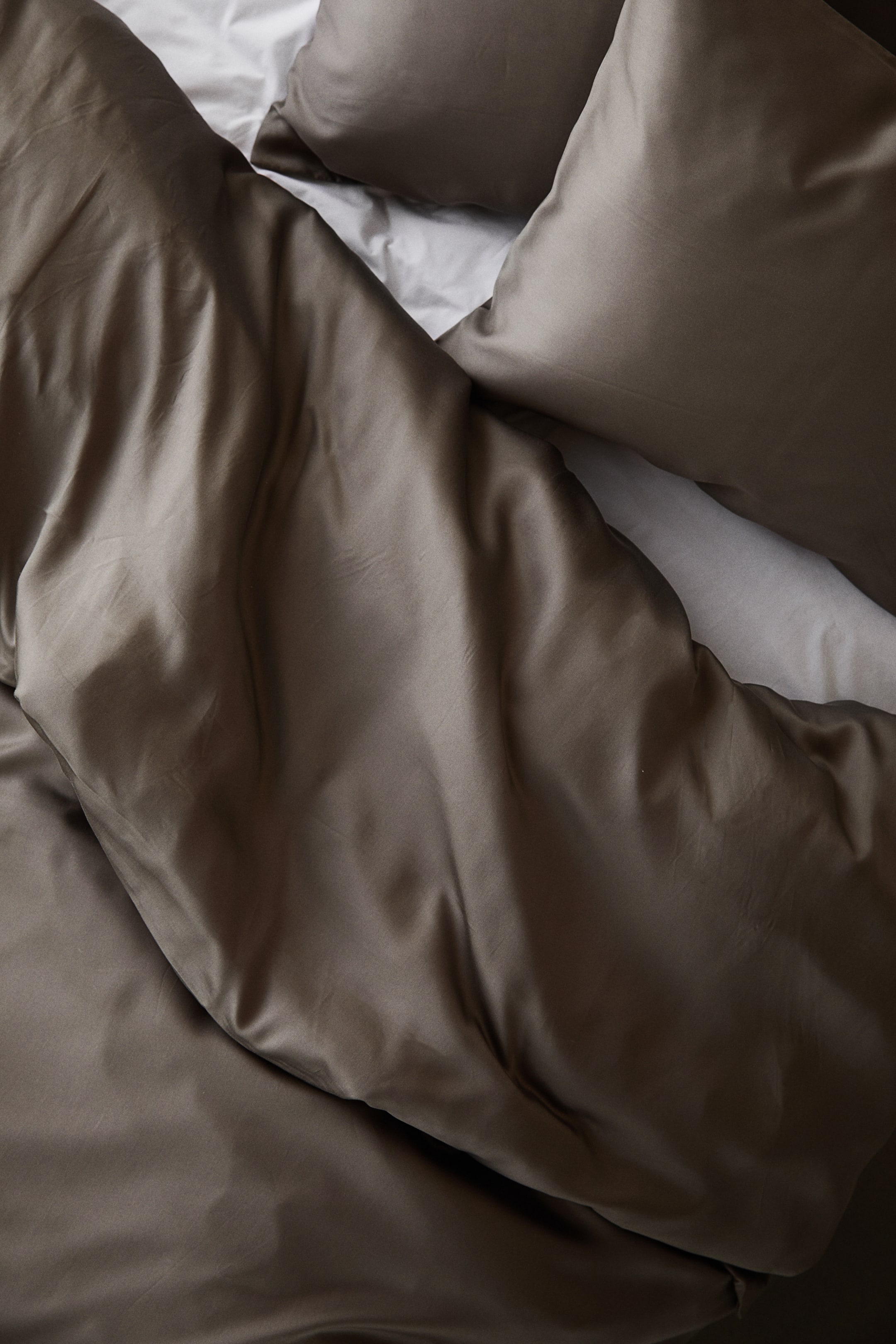 Двоен комплект спално бельо от изключително мек тъкан сатен с копринена и лъскава повърхност. Материята е дишаща и регулира температурата, което допринася за по-приятен сън. Комплектът съдържа един плик за завивка и две съответстващи калъфки за възглавници. Пликът се закопчава в долната част с дискретни копчета. Калъфките за възглавници са със затваряне тип плик.