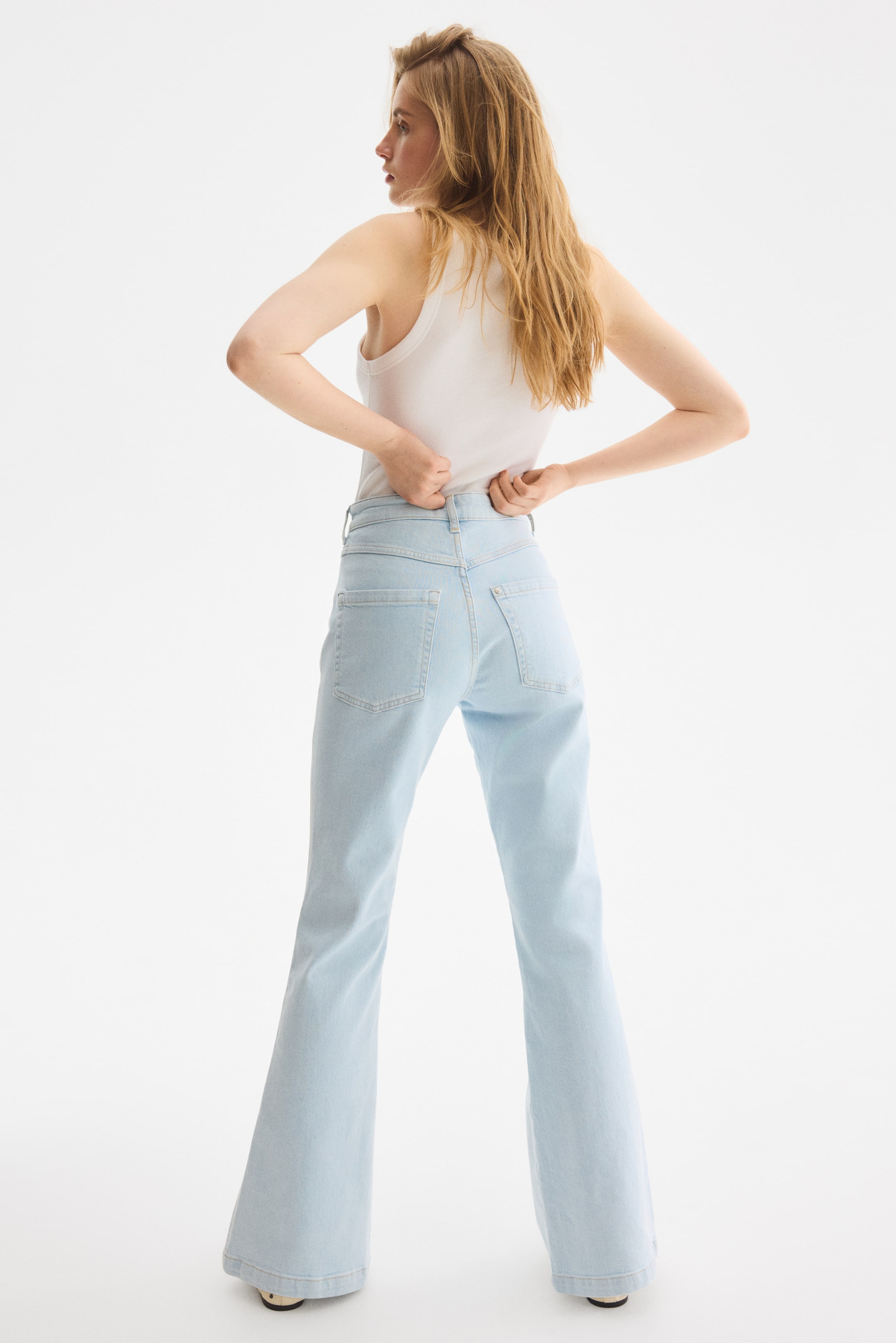 Джинси от твърд памучен деним, който е доста твърд в началото, но с носенето омеква и се отпуска. С клоширани крачоли със стандартна кройка от талията до бедрата, които се разширяват от коленете към краищата. С много висока талия с шлиц с цип и копче. С външни предни джобове и задни джобове. С крачоли с нормална дължина, които стигат до горната част на стъпалата, без да се набират. Актуален силует сезон след сезон.