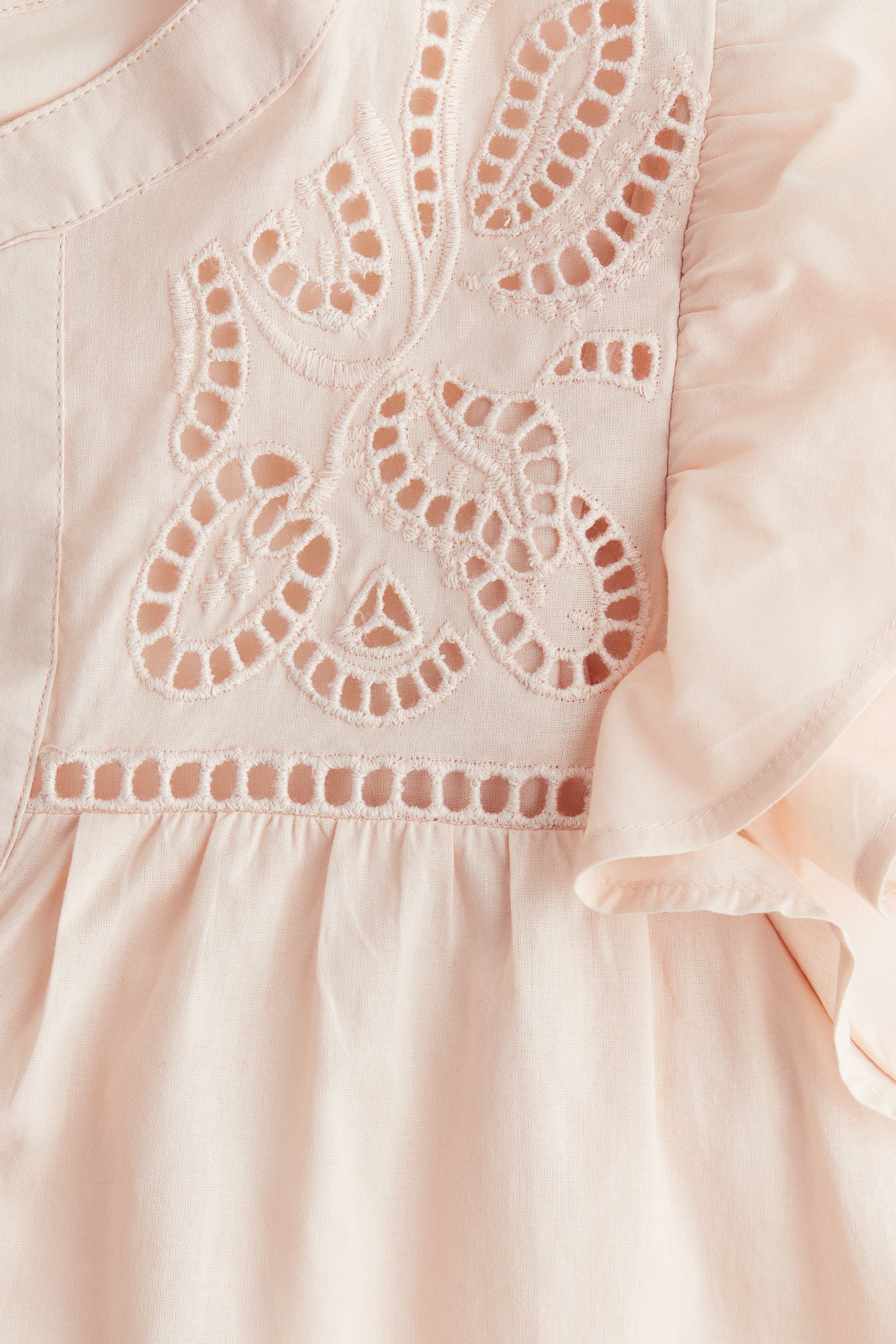 Блуза от ефирен тъкан памук със свободна кройка. С платка с английска бродерия и набори отпред и изчистена платка с набори отзад.
