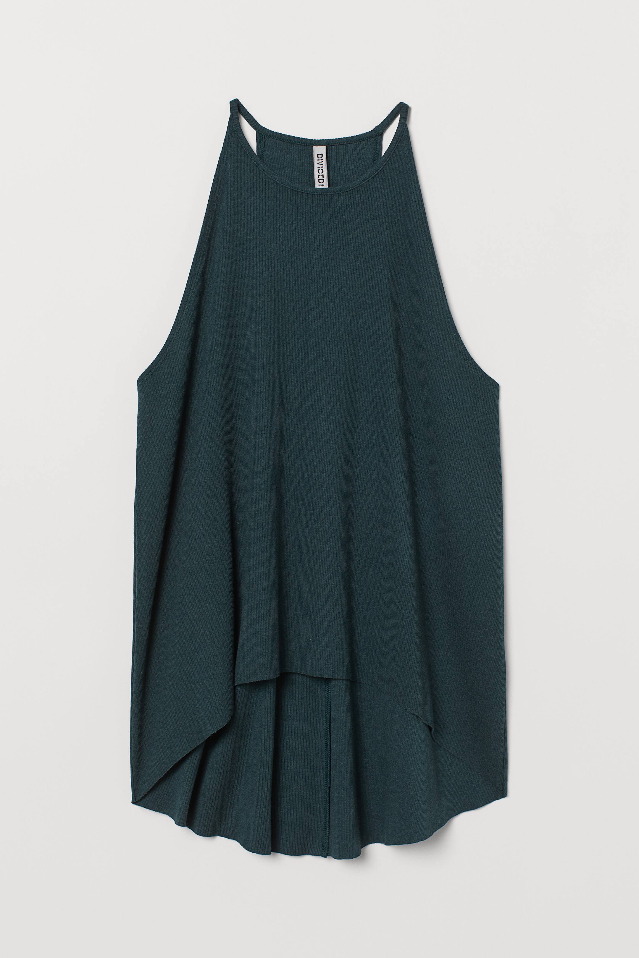 Tílko ze sepraného žerzeje. Má úzká ramínka a hluboké průramky. Má široký střih s ozdobným švem vzadu. Nezačištěný, kulatý dolní lem je vpředu krátký a vzadu delší.