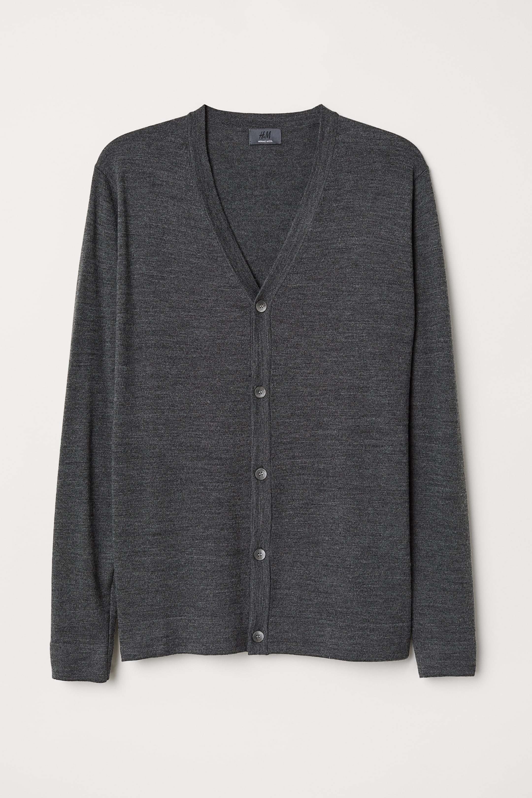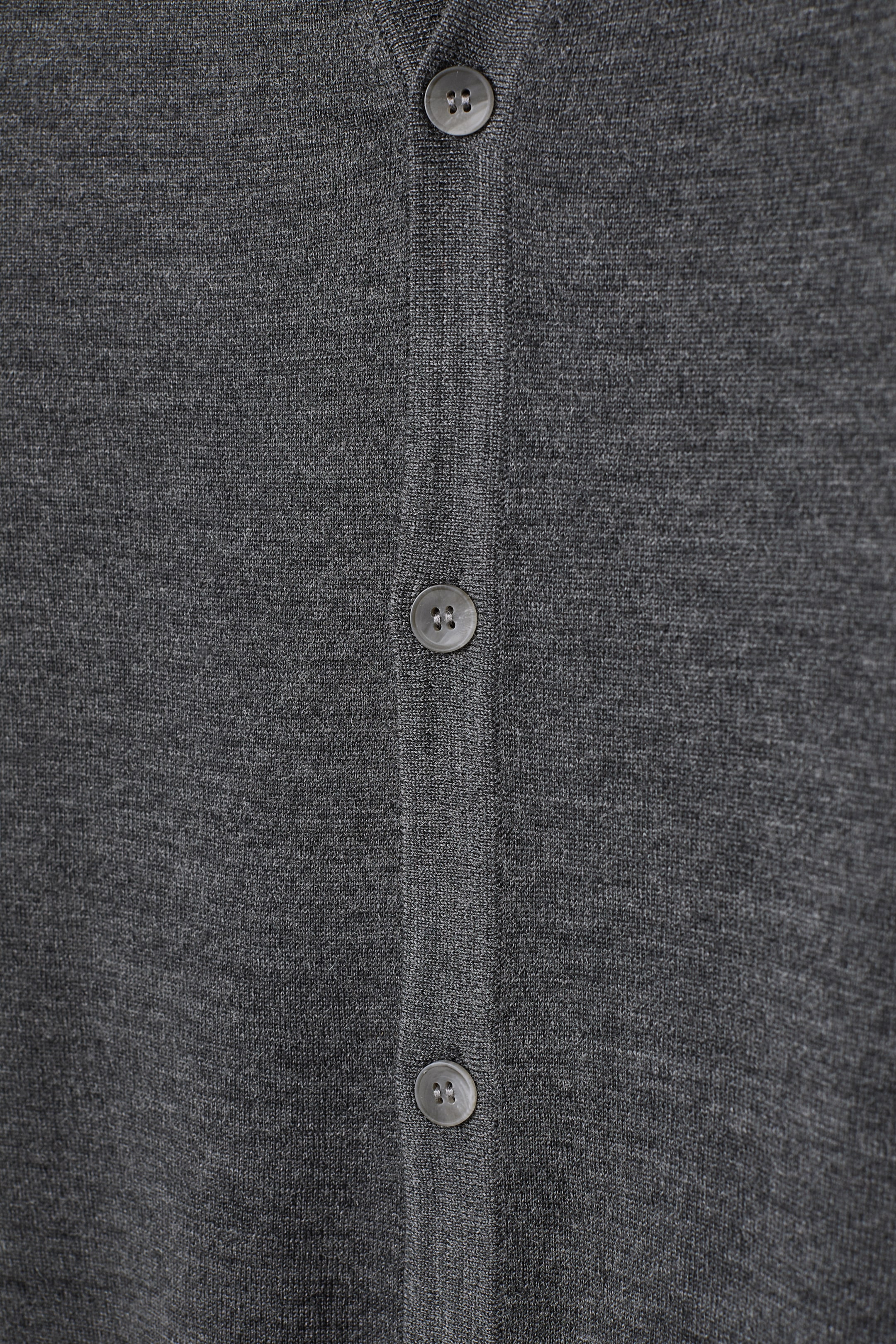 Jemně pletený svetr z měkké merinovlny. Má výstřih do véčka a přední zapínání na knoflíky. Dlouhý rukáv. Žebrovaný náplet na rukávech a dolním lemu.