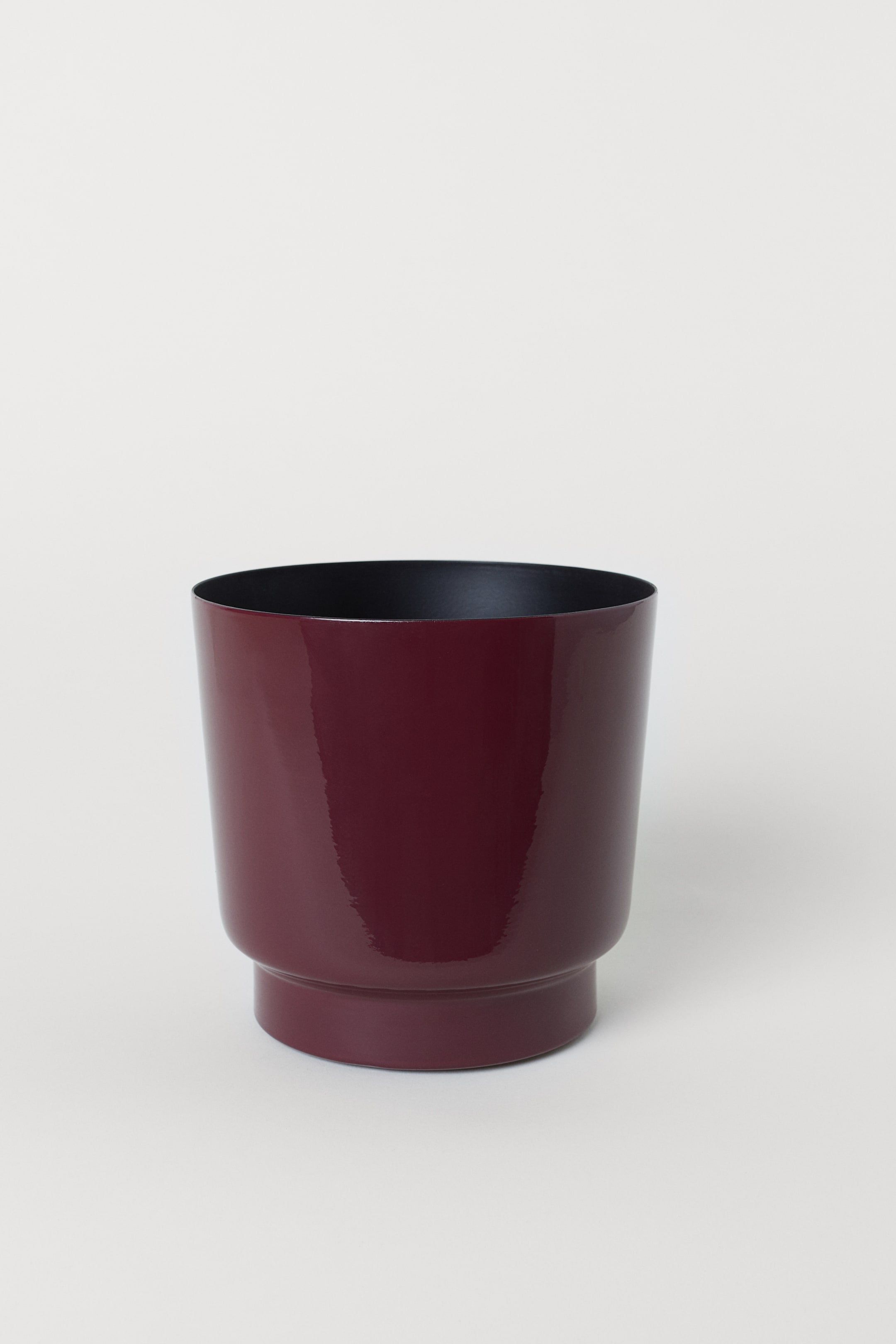 Květináč z lakovaného kovu. Dolní průměr 13 cm, horní průměr 17 cm. Výška 16,5 cm.