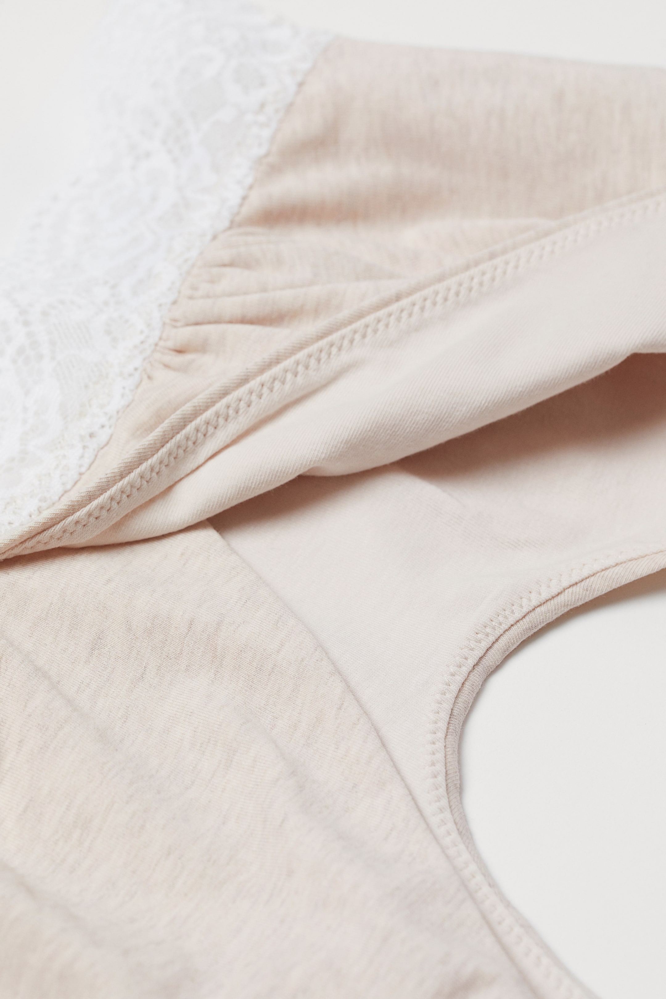 Měkké podprsenky na kojení z biobavlny. Bez kostic. Mají křížení vpředu a pružný dolní lem s krajkou. S podšívkou.
