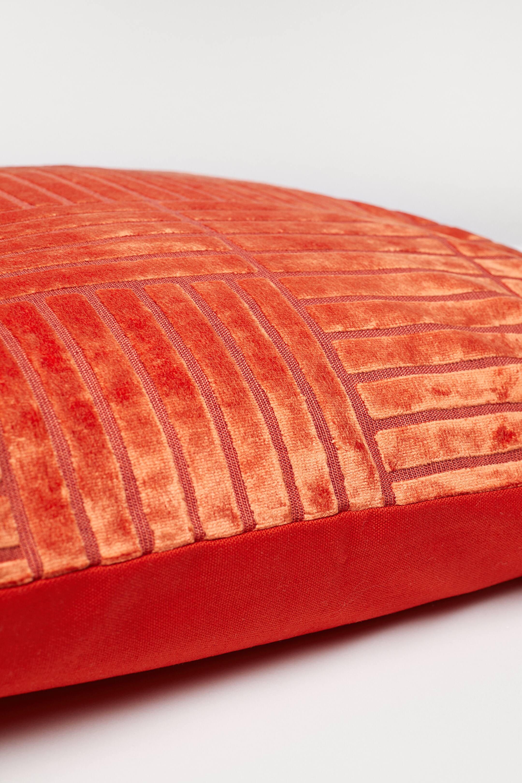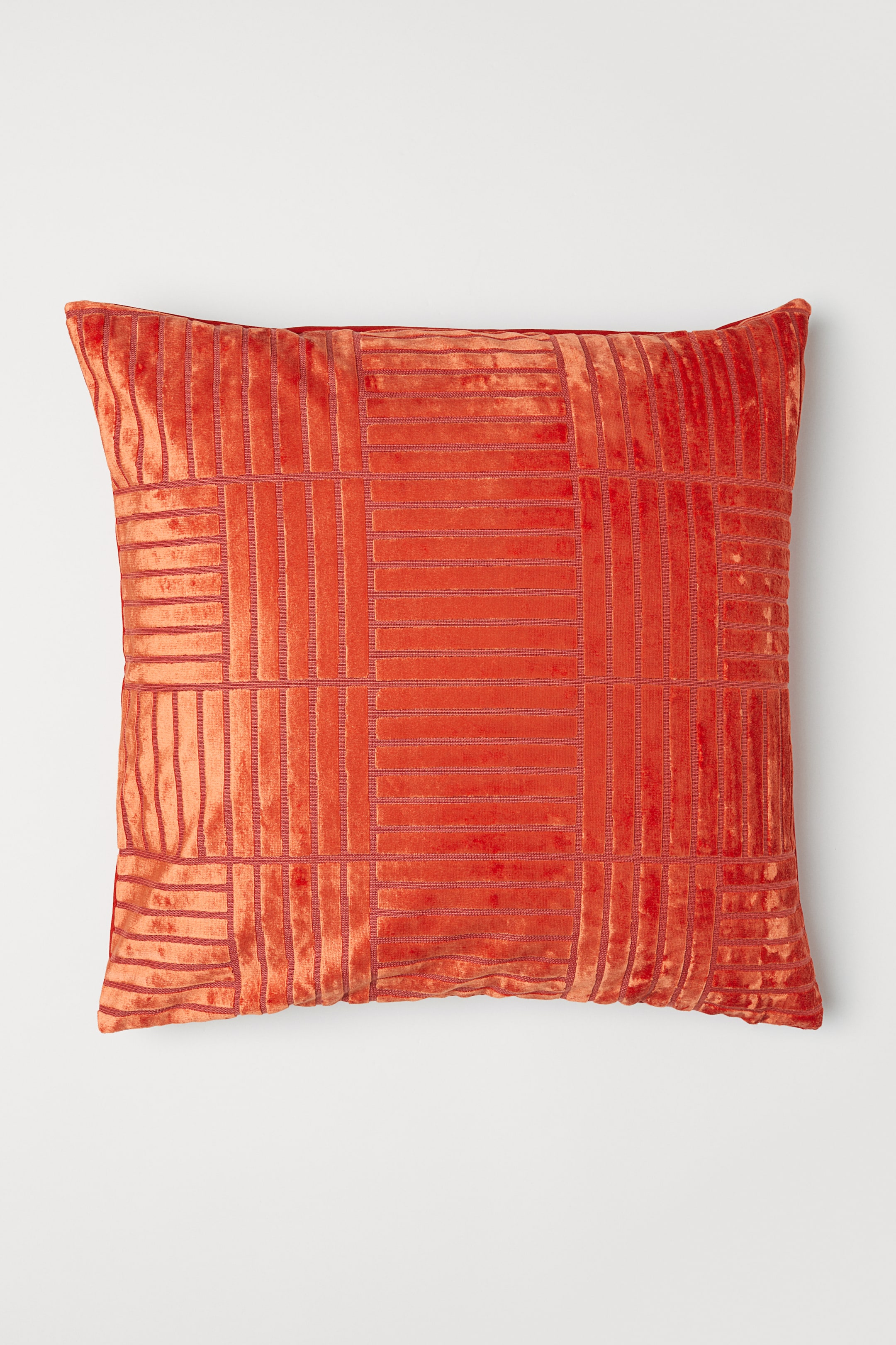 Povlak na polštářek z plátna a sametu. Má vzorovanou přední stranu a skrytý zip.