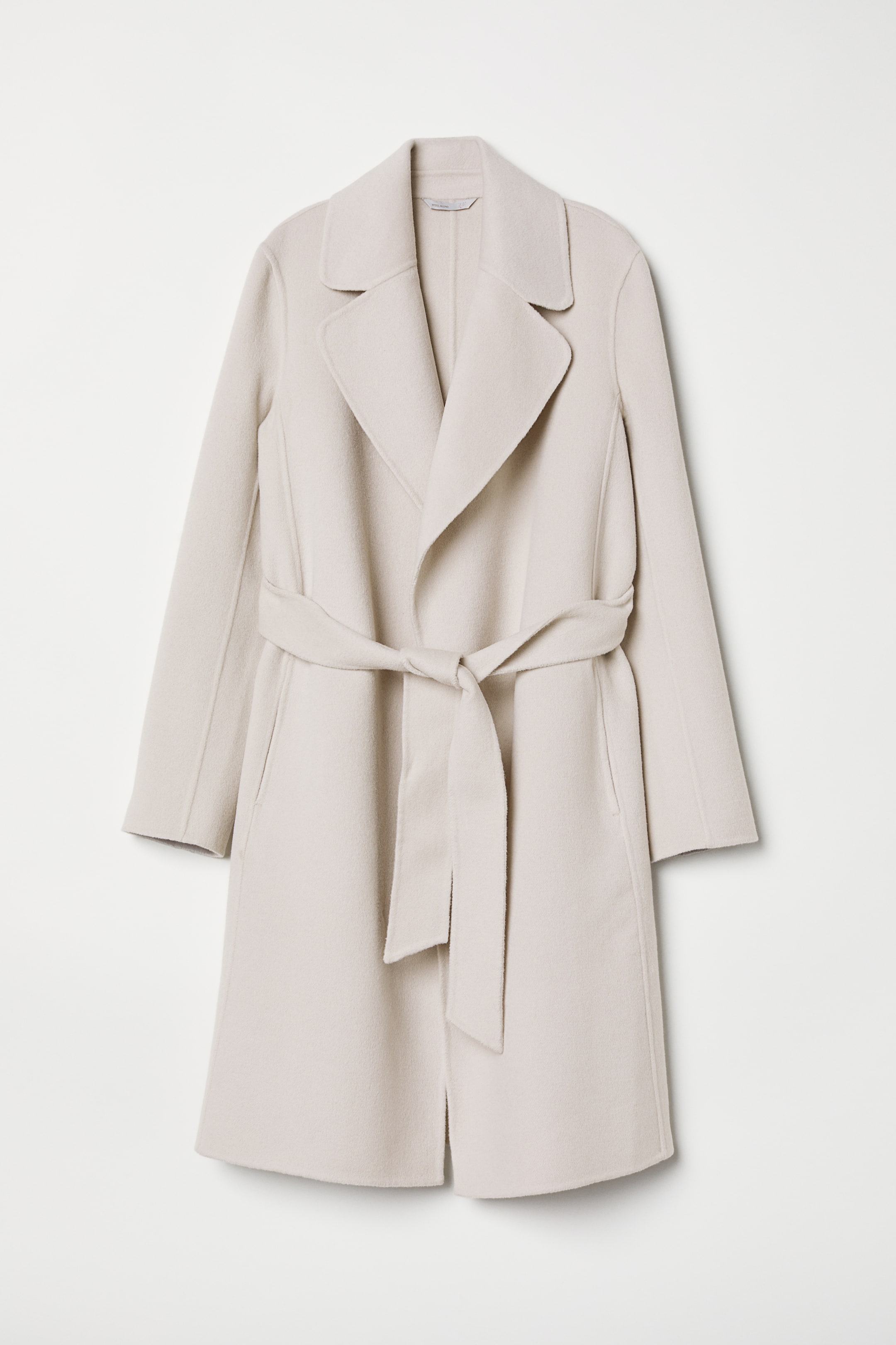 Kabát z vlněné směsi. Má fazonový límec, zavazovací pásek a kapsy zasazené do bočních švů. Bez knoflíků a bez podšívky.