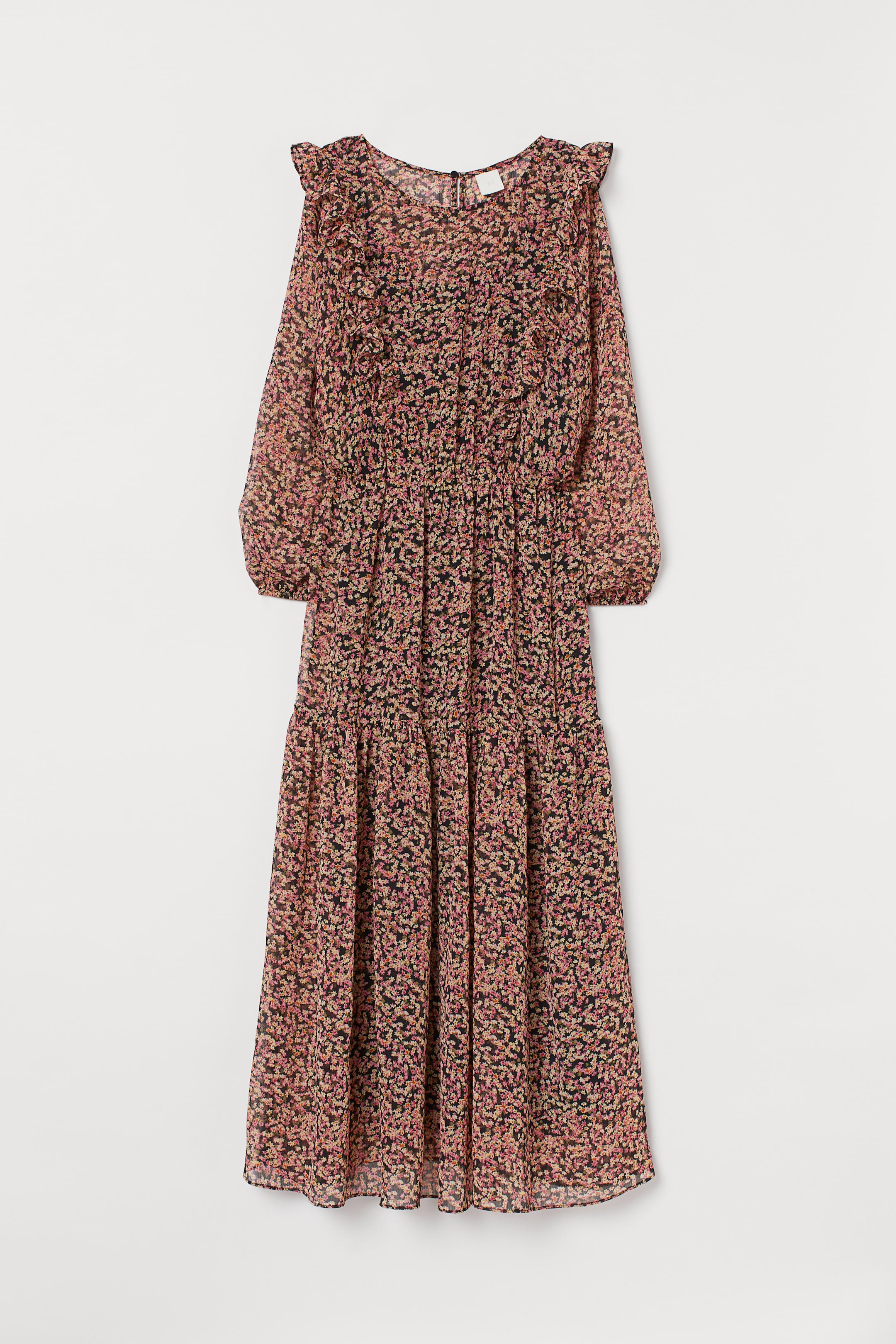 Dlouhé šaty ze vzdušné tkaniny. Mají kulatý výstřih a průstřih se skrytým knoflíkem vzadu u krku. Volánky podél předního dílu pokračují podél zad. Dlouhý netopýří rukáv je zakončený úzkou gumičkou. Úzký, pružný šev v pase. Žerzejové spodní šaty.