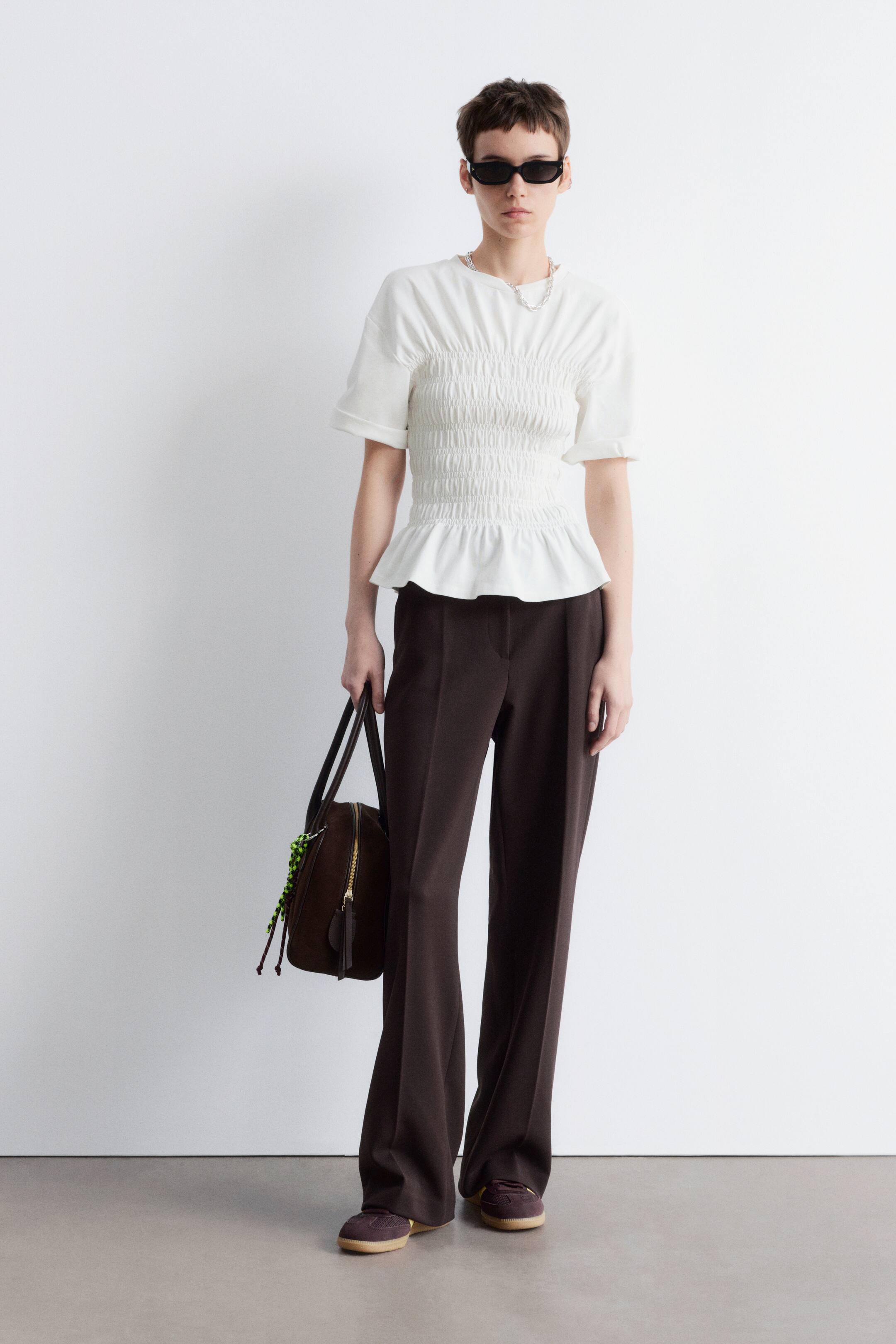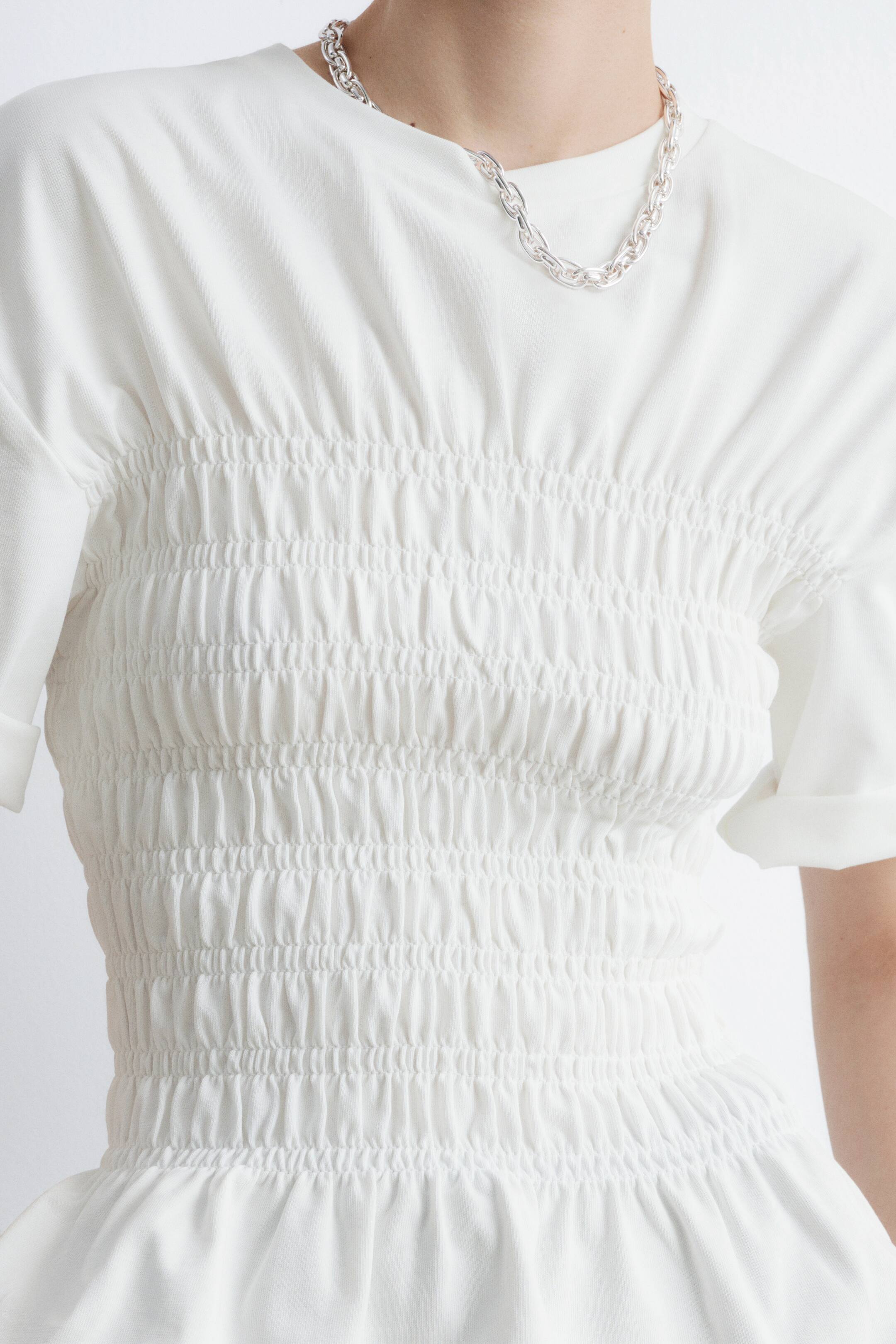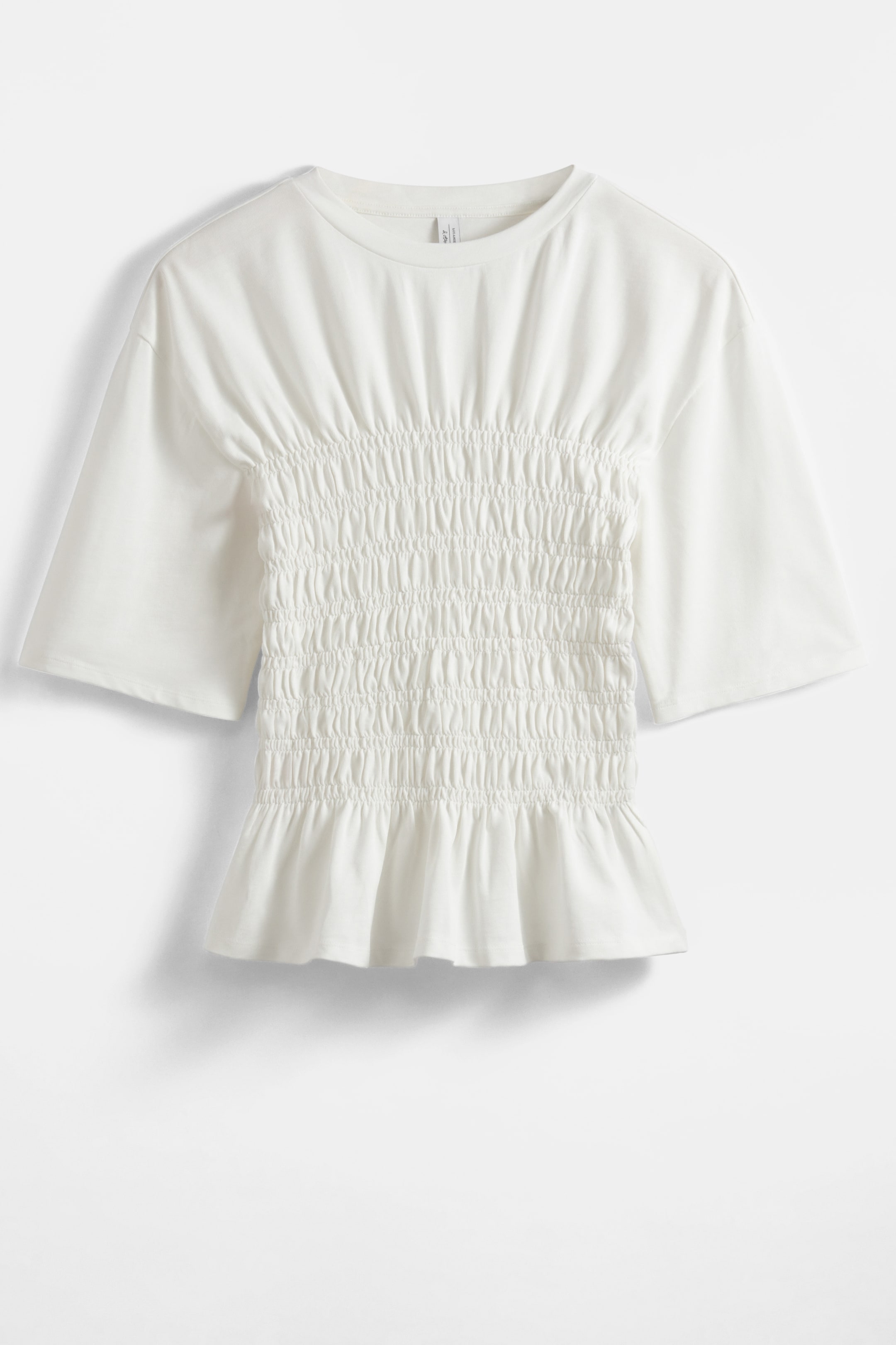 Tričko s krátkým rukávem s kulatým výstřihem a žabičkovaným tělem, které se rozšiřuje do peplum lemu. • Kulatý výstřih • Délka trička:54 cm (Velikost S)