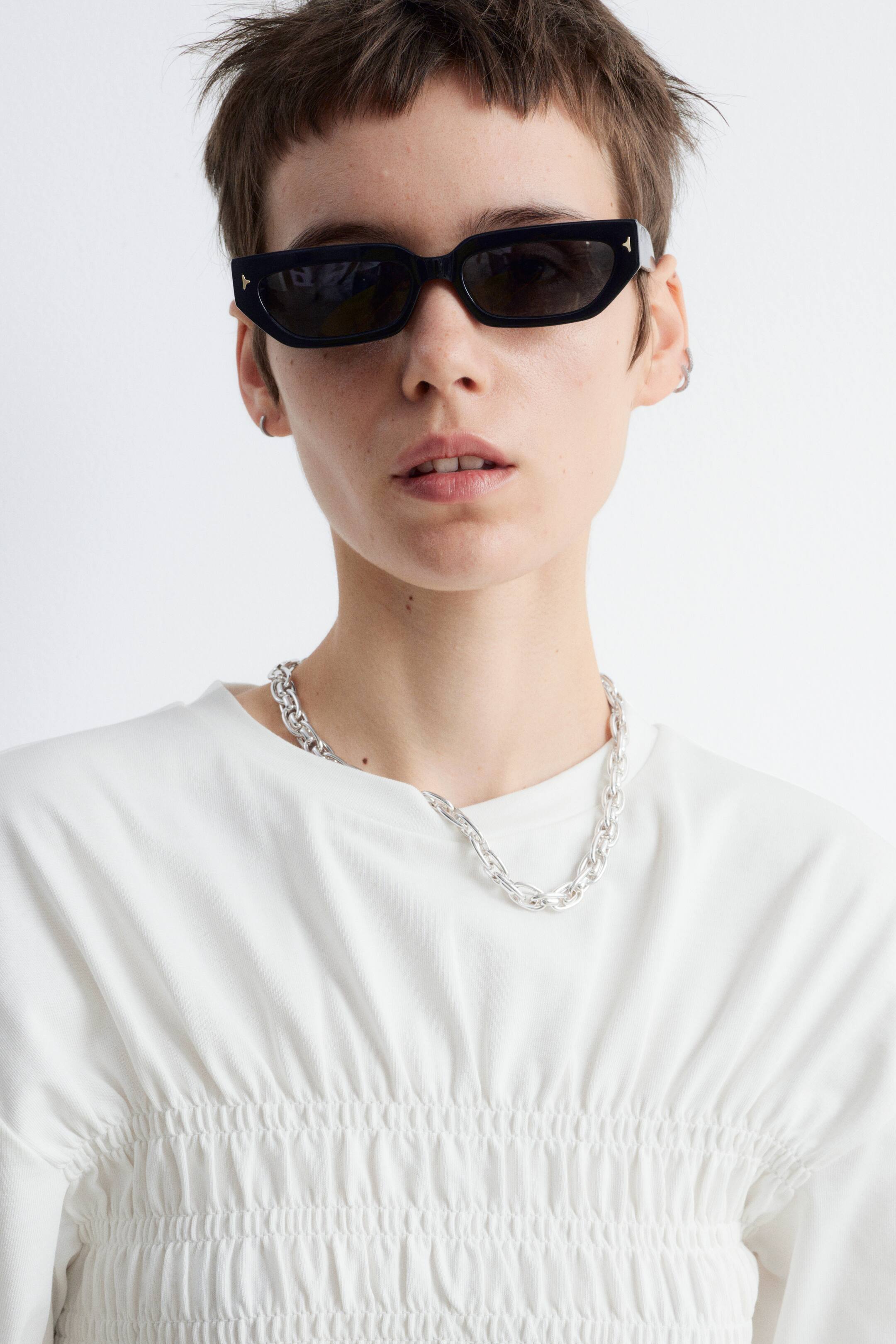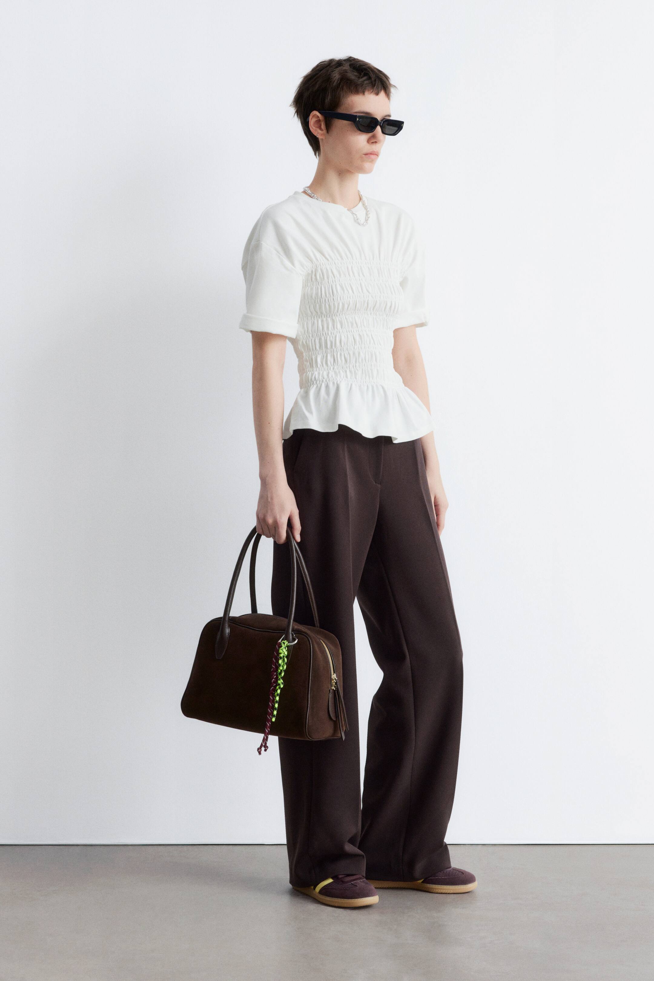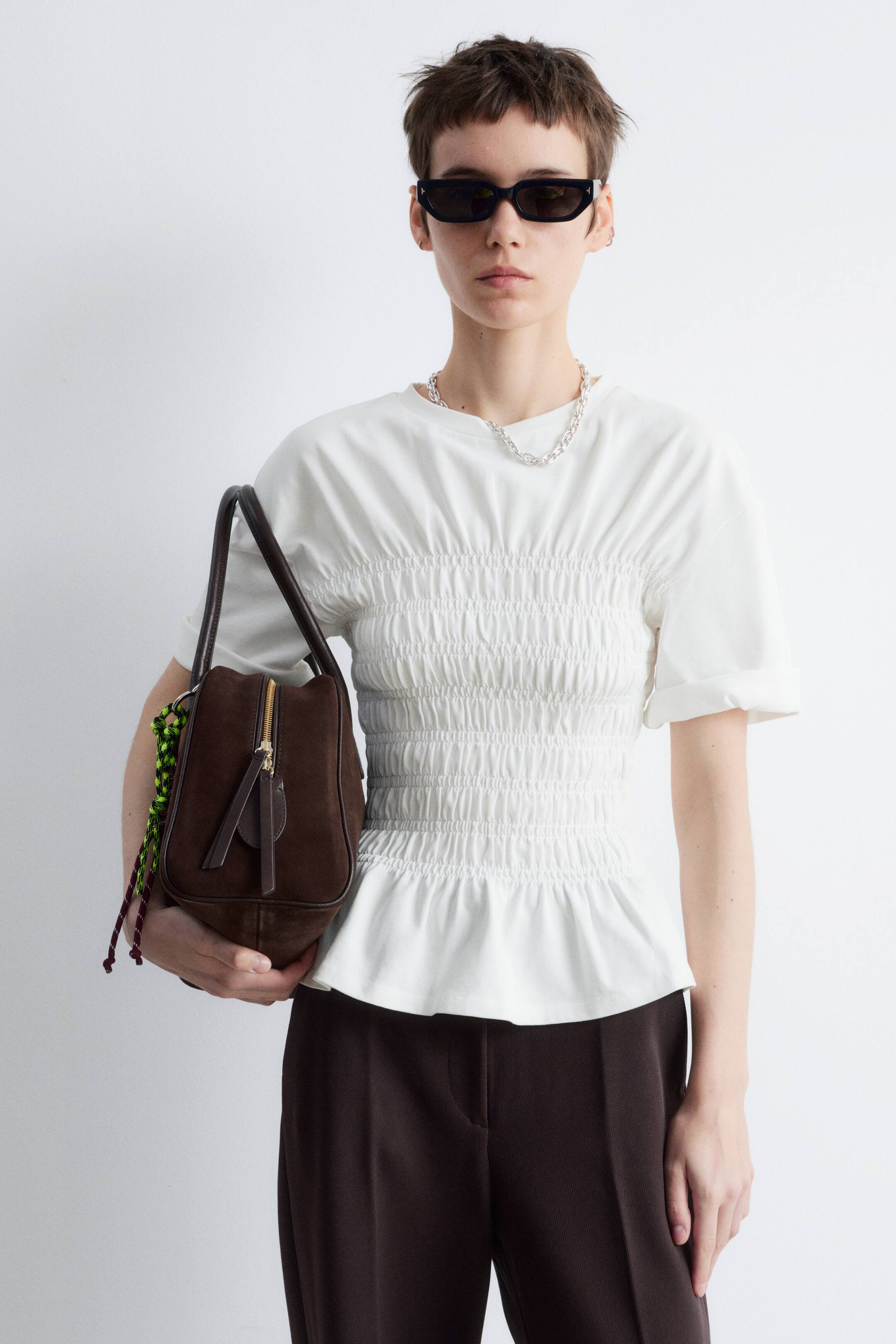 Tričko s krátkým rukávem s kulatým výstřihem a žabičkovaným tělem, které se rozšiřuje do peplum lemu. • Kulatý výstřih • Délka trička:54 cm (Velikost S)
