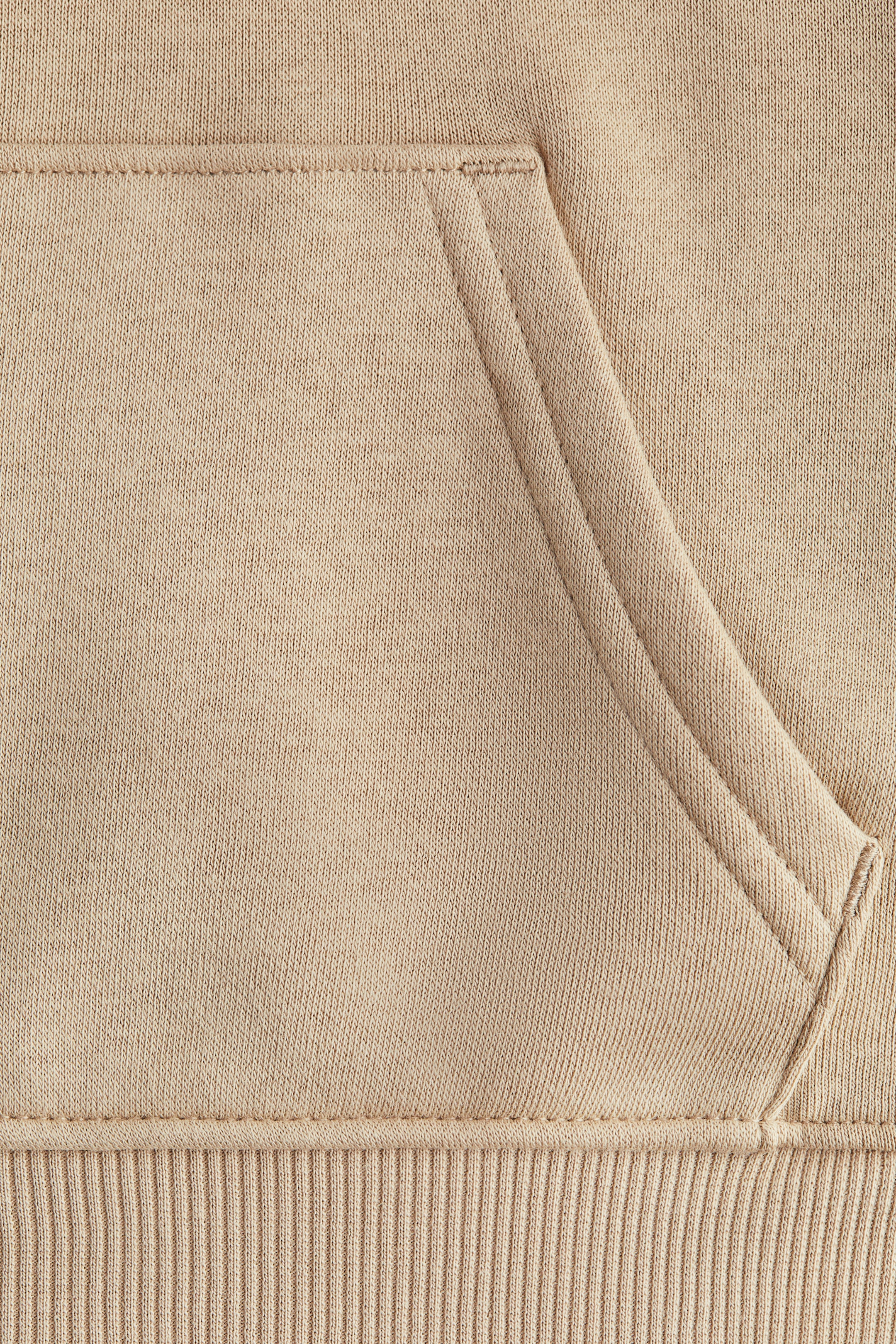 Mikina z lehké bavlněné teplákoviny s potiskem. Má podšitou kapuci s křížením a spuštěná ramena. Klokaní kapsa. Dolní okraj a rukávy mají žebrovaný lem.