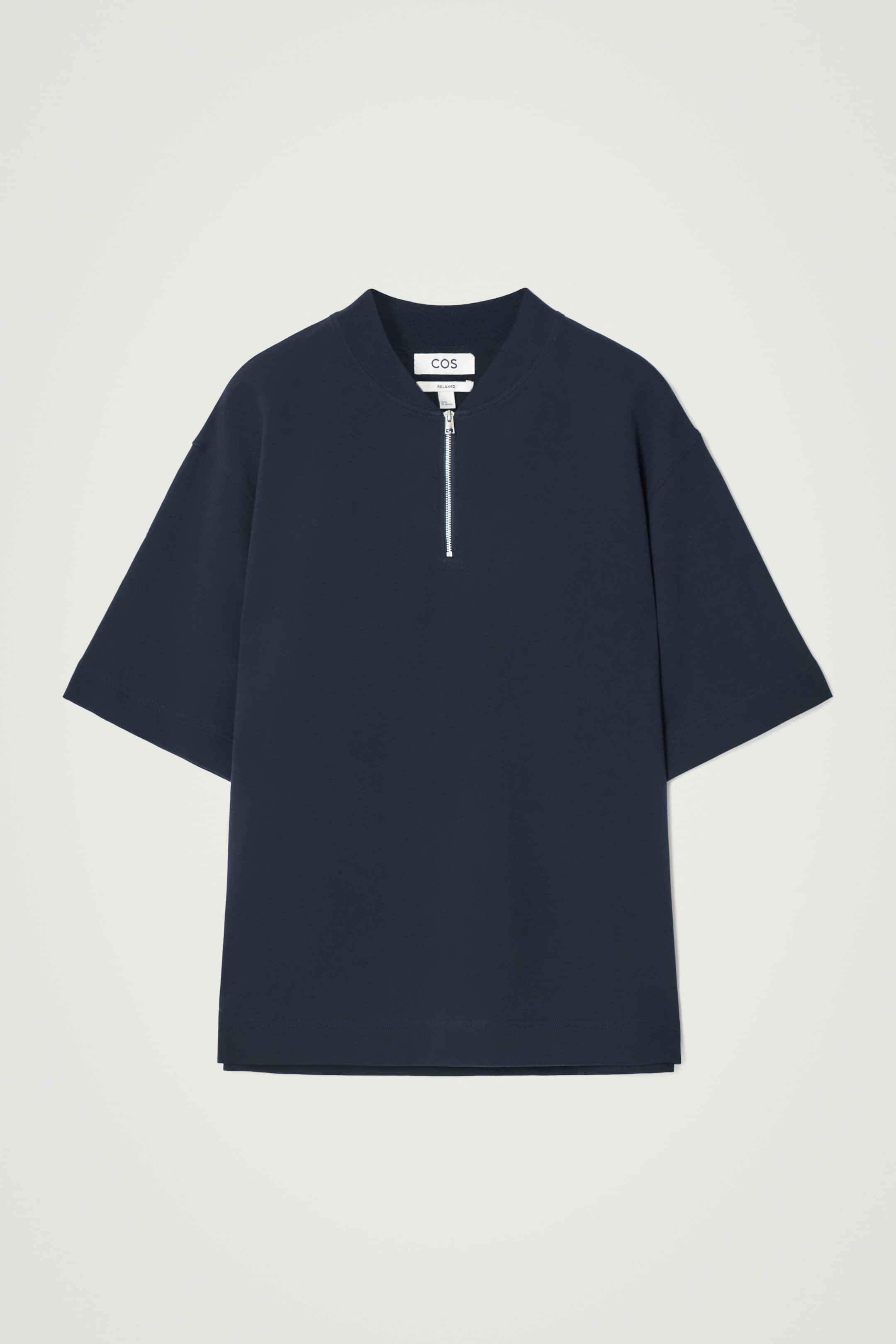 Toto uvolněné tričko si vypůjčuje z klasického sportovního oblečení. Střižené v volném tvaru, je vyrobeno z měkkého bavlněného žerzeje a má žebrovaný kulatý výstřih, stříbrný poloviční zip a boční rozparky. Volný střih, 265gsm Zapínání na zip Svrchní materiál: 97% bavlna, 3% elastan. Bez ozdobných prvků / Lze prát v pračce Délka zad ve velikosti M je 70,6 cm / Model má na sobě velikost M