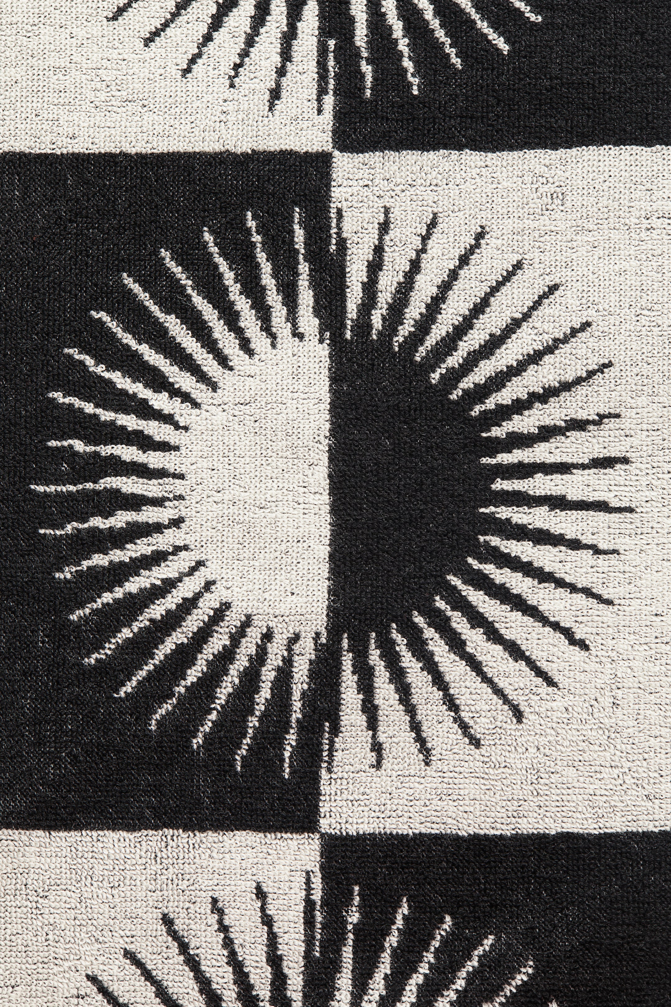 Plážová osuška z měkkého bavlněného froté s dvoubarevným vzorem inspirovaným západem slunce nad oceánem. Na jedné z delších stran má poutko.