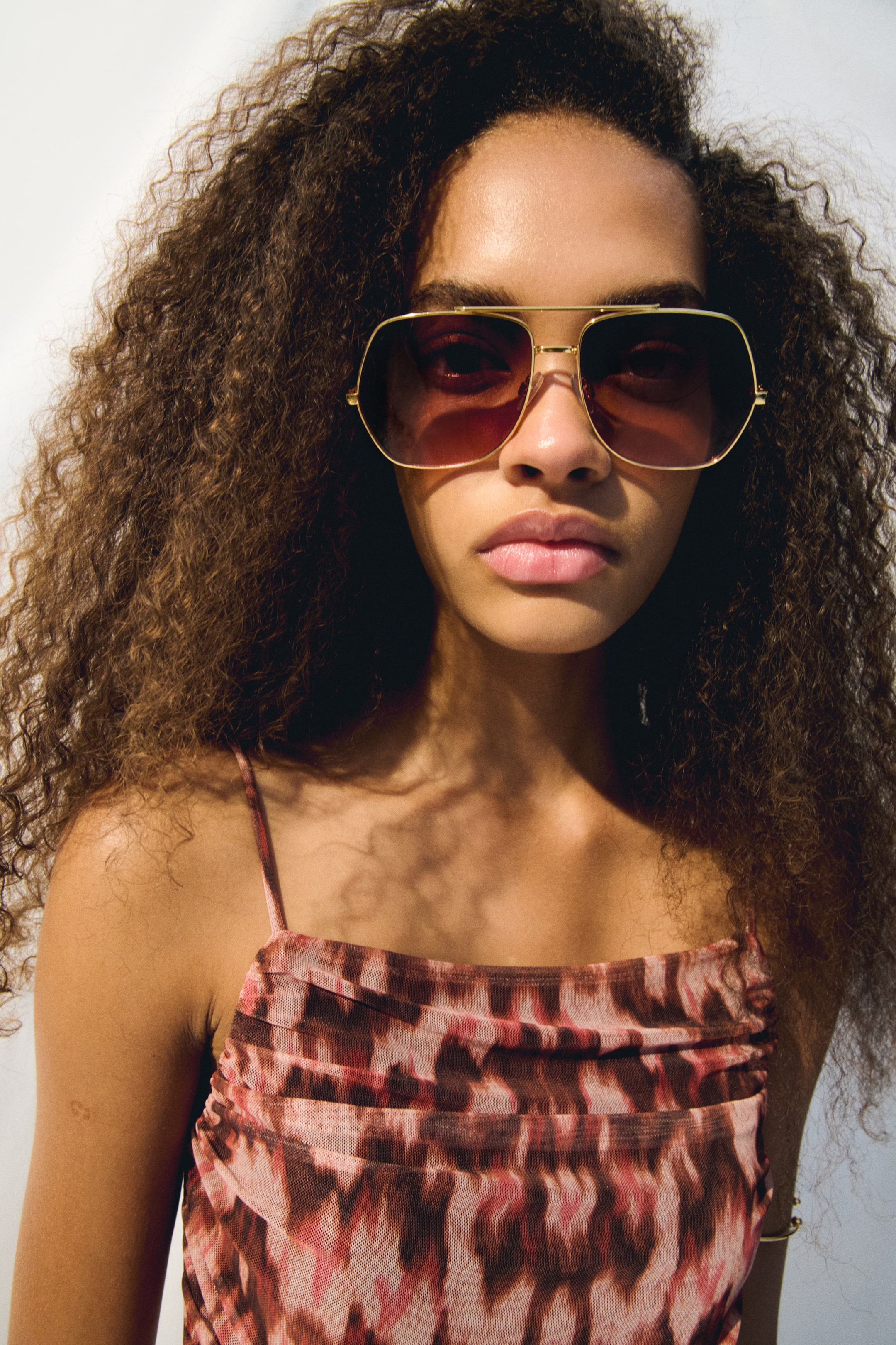 Sluneční brýle pilotky s kovovými obroučkami. Mají nastavitelná nosní sedla a zabarvená plastová skla, která chrání před UV zářením.