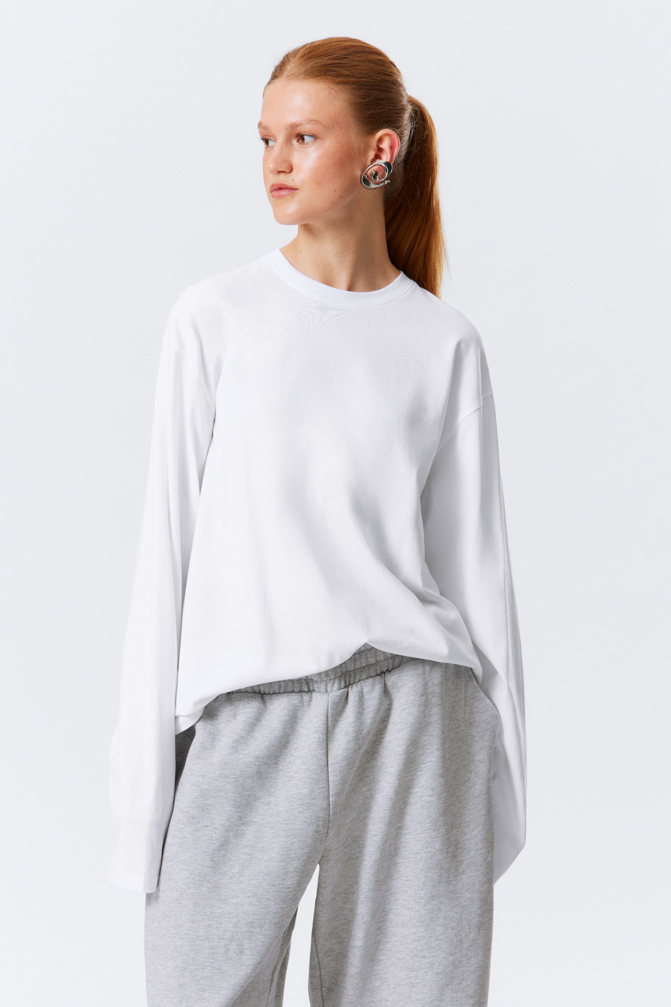 A long-sleeved t-shirt crafted from soft cotton jersey, cut to a loose, boxy fit. It features a round ribbed neckline and a straight hemline.