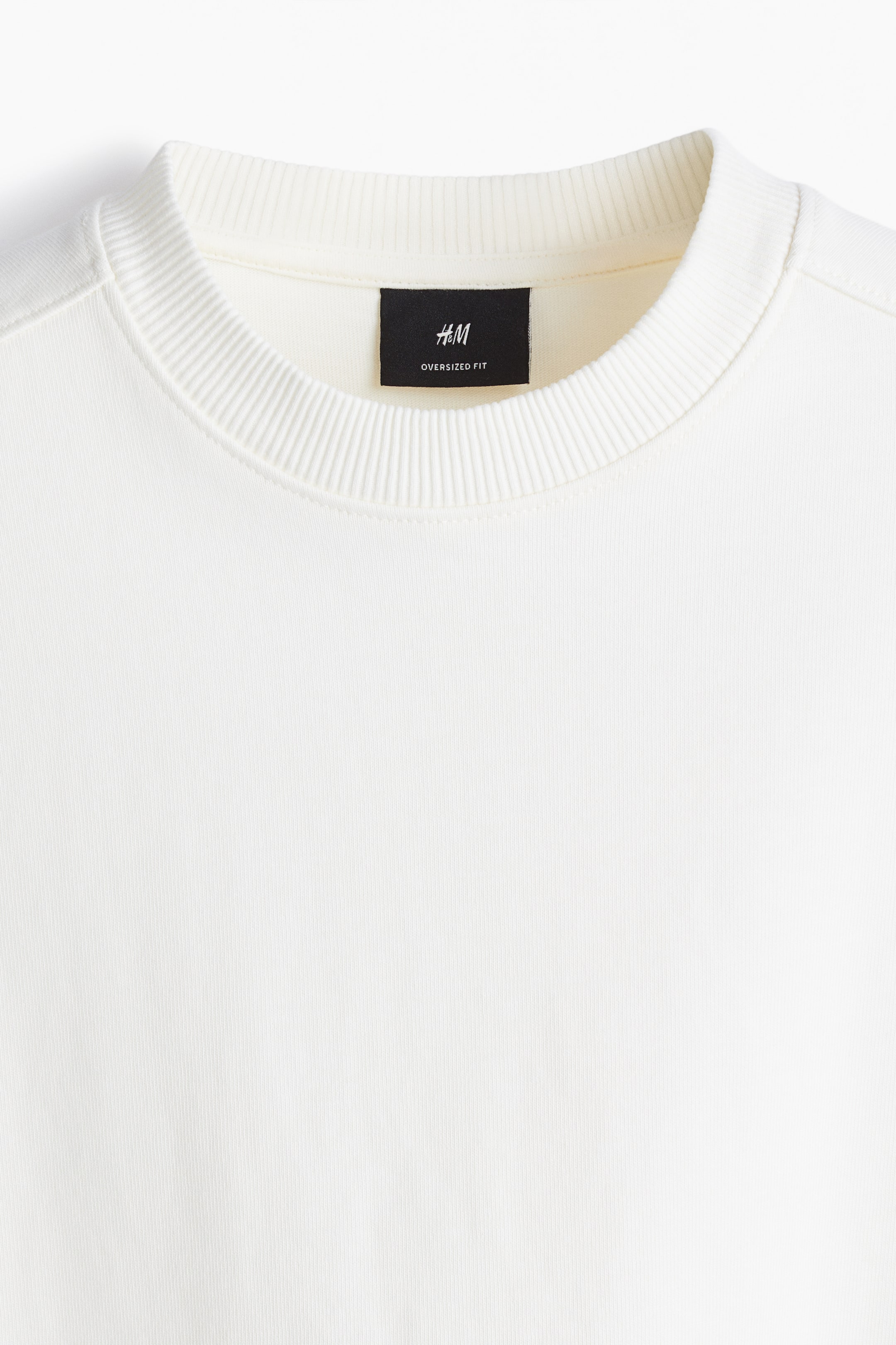 Tričko z bavlněného žerzeje silné gramáže. Hranatý střih. Má kulatý výstřih s žebrovaným lemem, zadní sedlo, spuštěná ramena a rolovaný nezačištěný dolní lem. Objemný střih vytváří plandavou, extra volnou siluetu.
