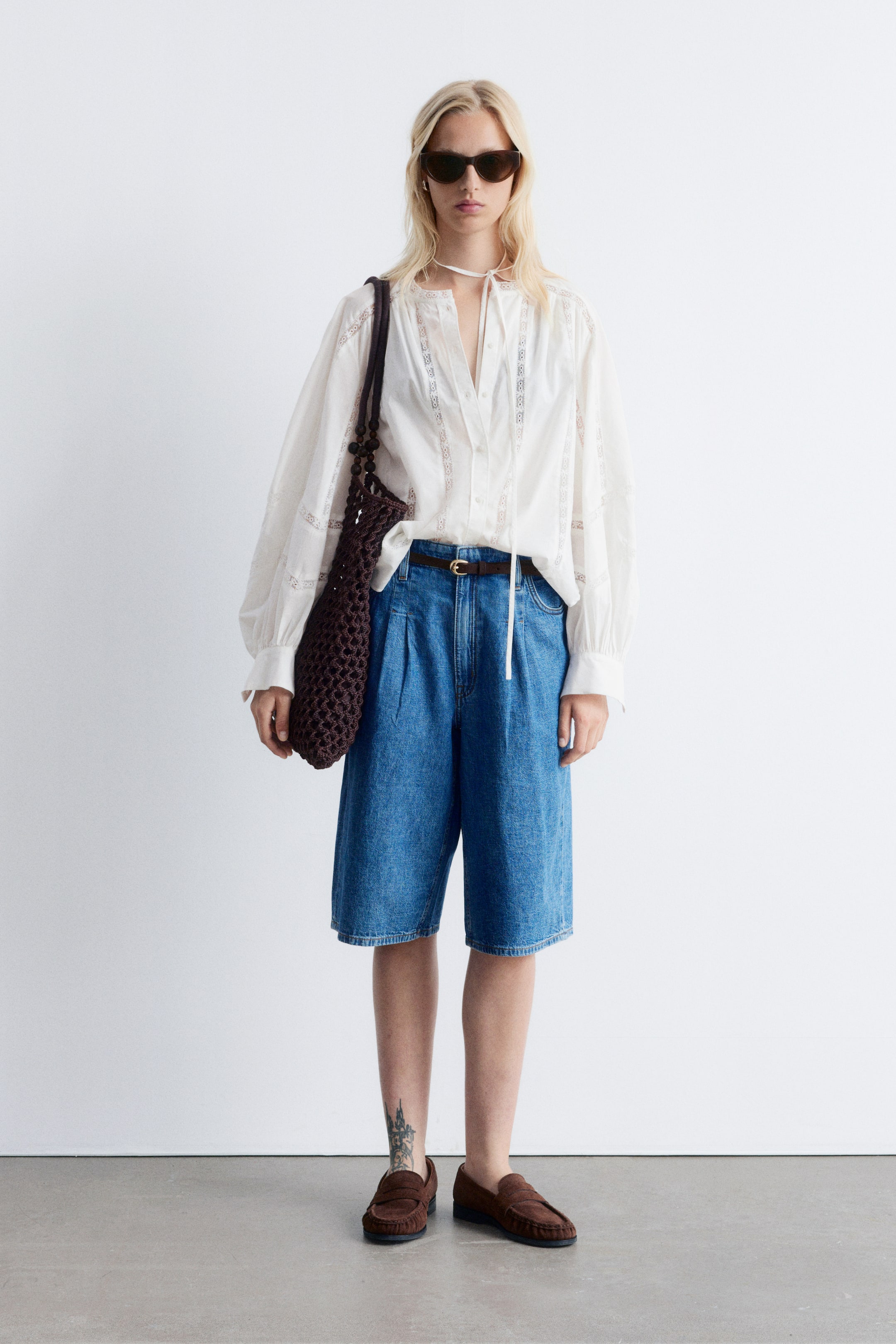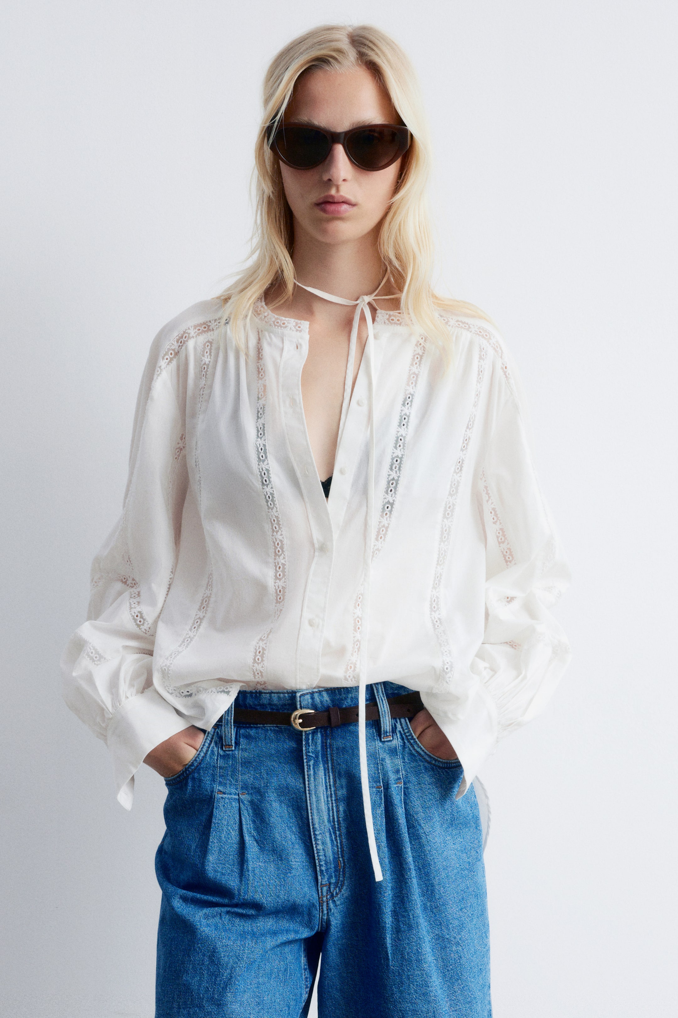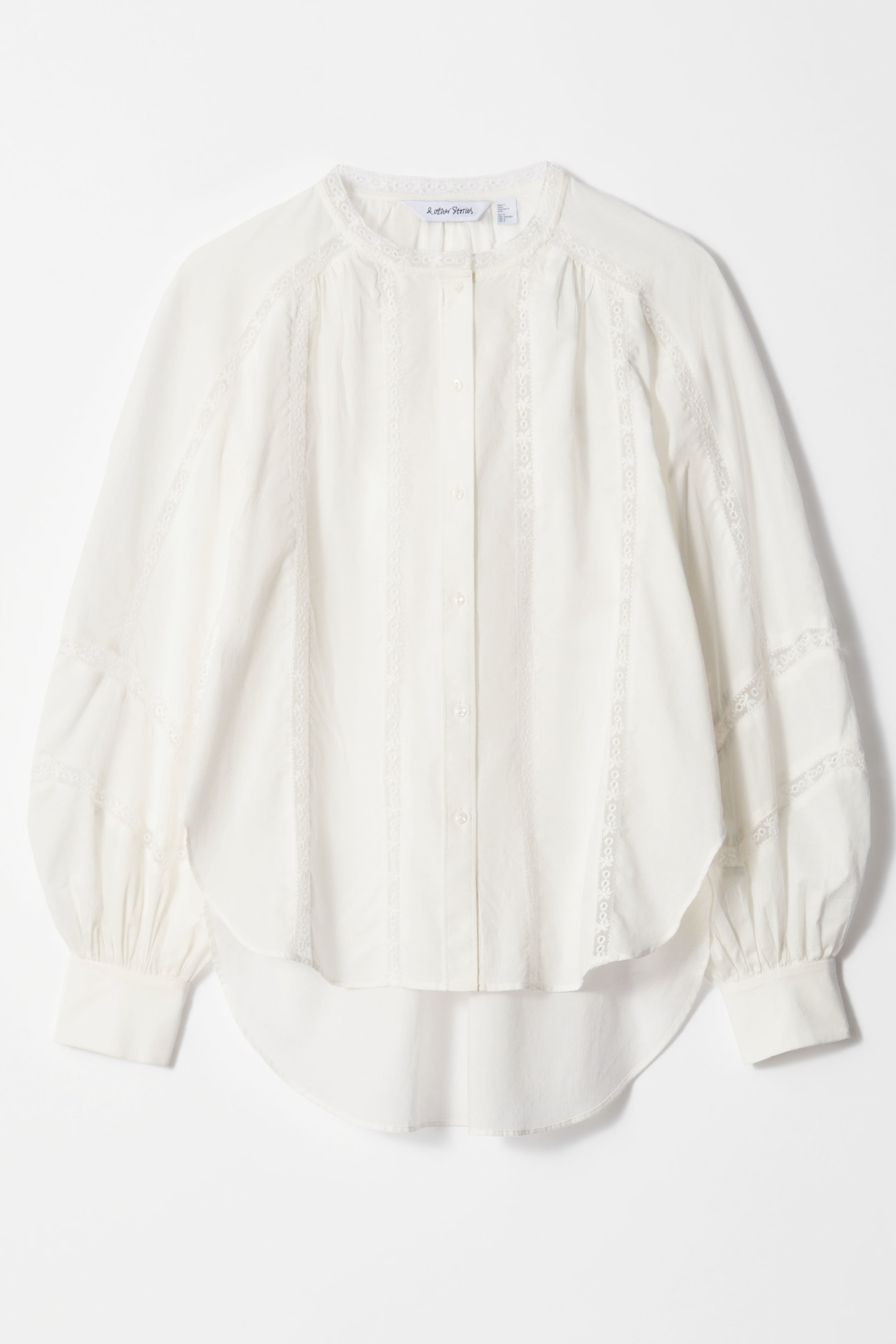 Tato halenka je vyrobena z lehké a vzdušné bavlněné tkaniny. Má volný střih, stojáček, objemné balónové rukávy s manžetami na knoflíky a jemné krajkové detaily po celé délce. Přední část je zdobena knoflíky. Zastrčte ji do džínových šortek v teplých dnech, nebo ji noste volně pro ležérní, vzdušný vzhled. Délka halenky:74,5 cm / 29,3" (velikost S)