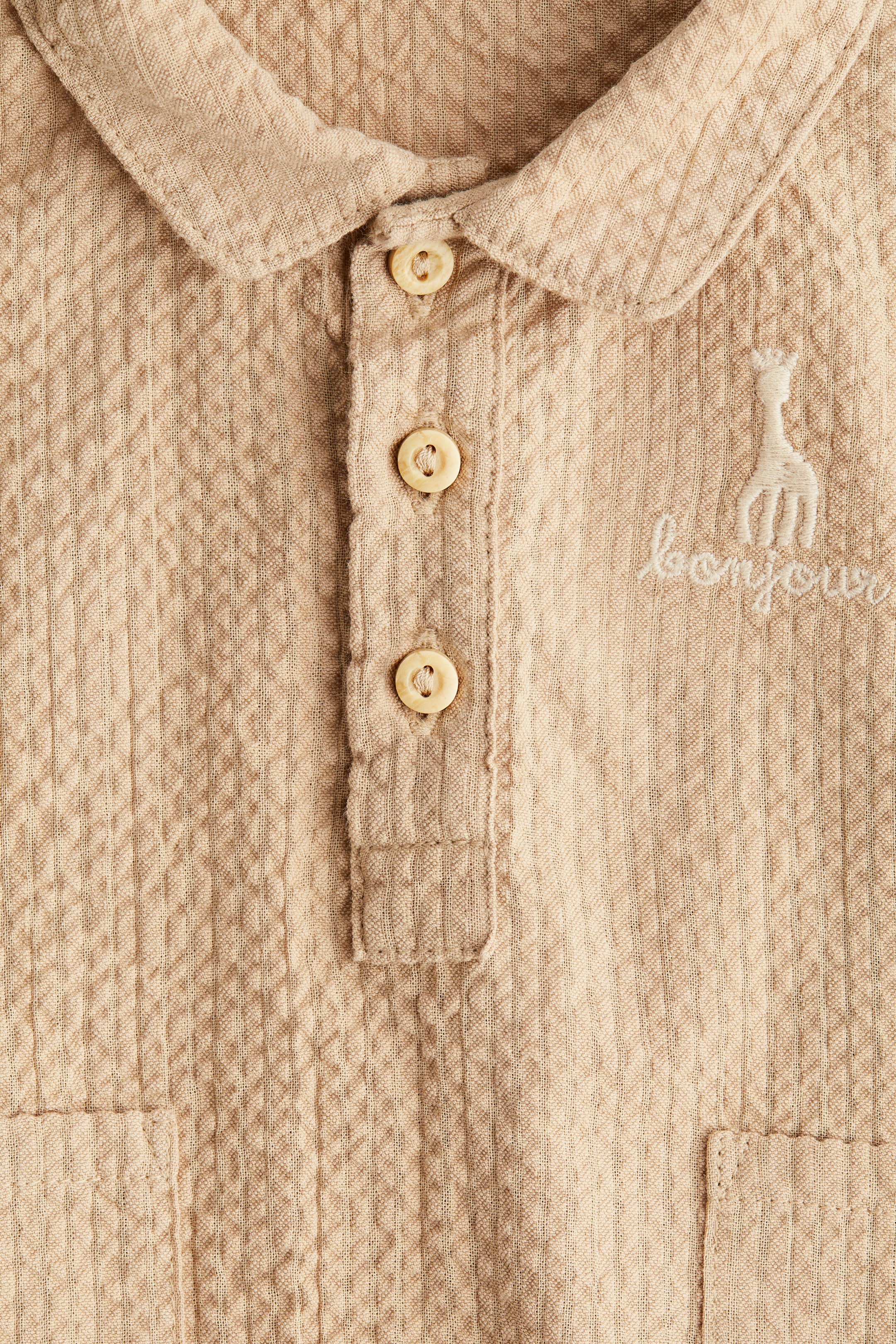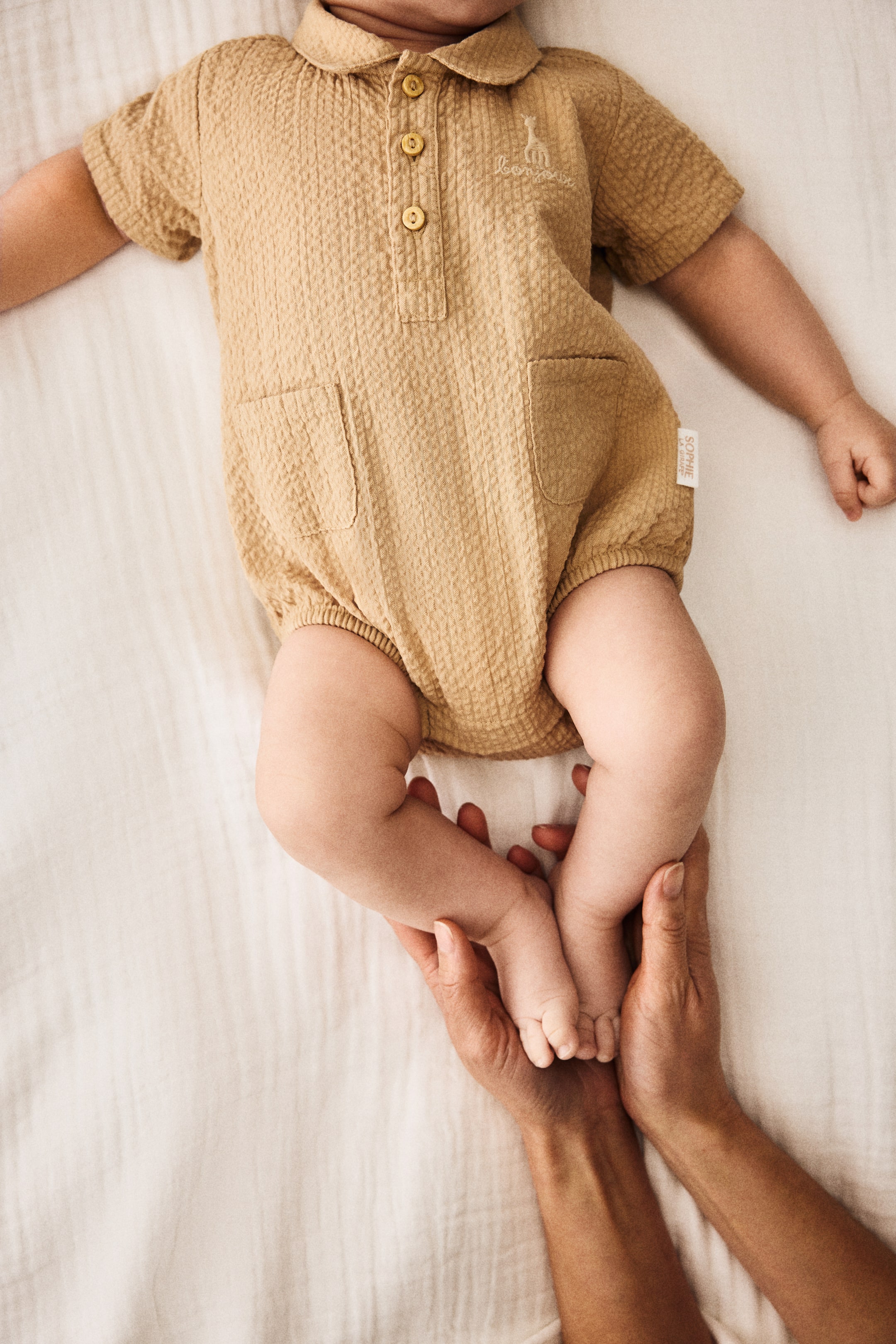 H&M x Sophie la girafe. Overal z měkké bavlněné tkaniny seersucker s drobným předním vyšívaným detailem. Má klasický límeček, horní knoflíkovou légu a krátké rukávy. Přední našité kapsy. Otvory na nohy jsou lemované úzkou měkkou gumičkou. Skryté druky v rozkroku usnadňují přebalování.