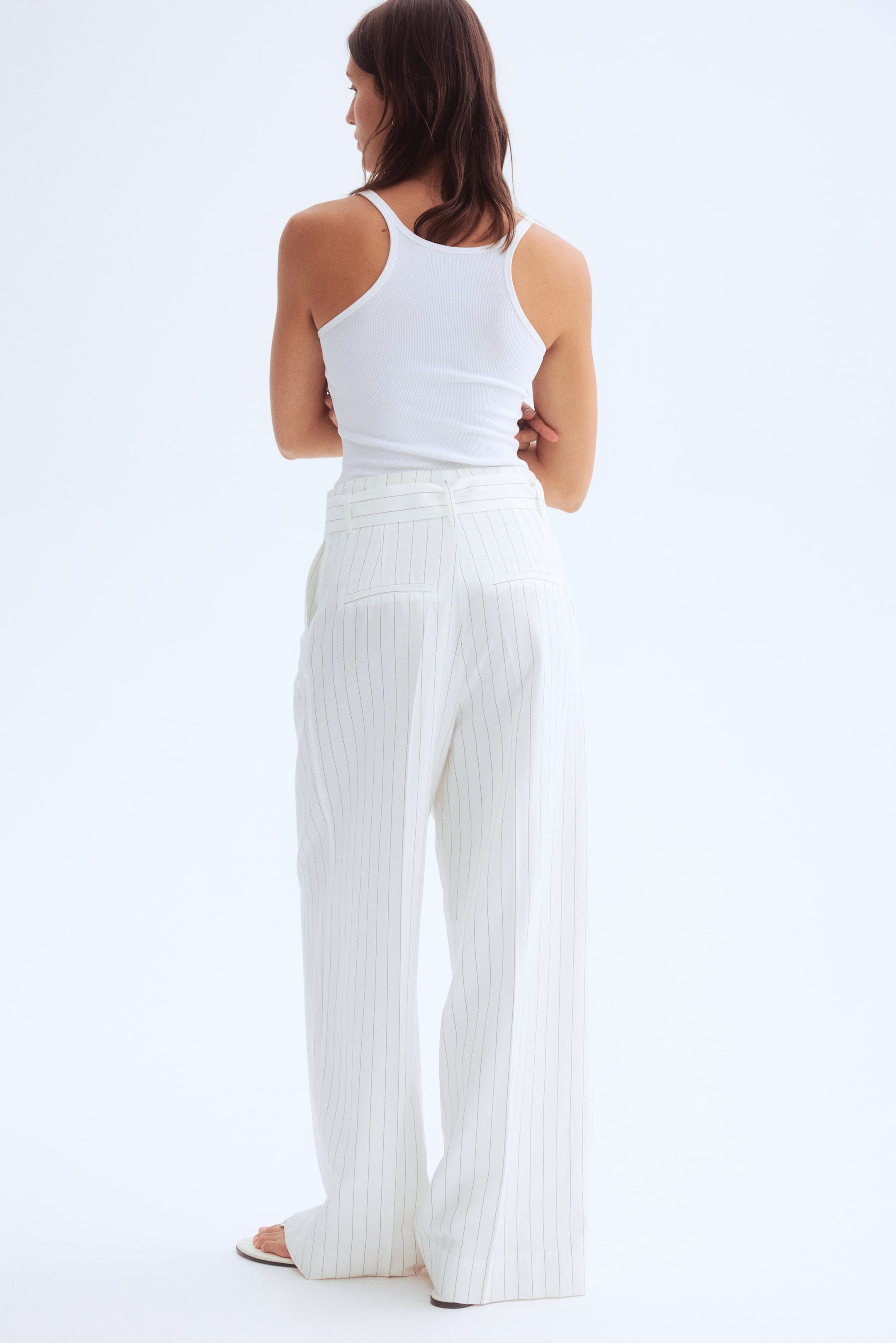 Elegantní kalhoty z tkaniny vyrobené z lněné směsi. Mají vysoký pas se snímatelným páskem opatřeným obdélníkovou přezkou. Poklopec na zip se skrytým zapínáním na háček. Šikmé boční kapsy, falešné zadní výpustkové kapsy a široké nohavice s předními sklady a předními i zadními puky.