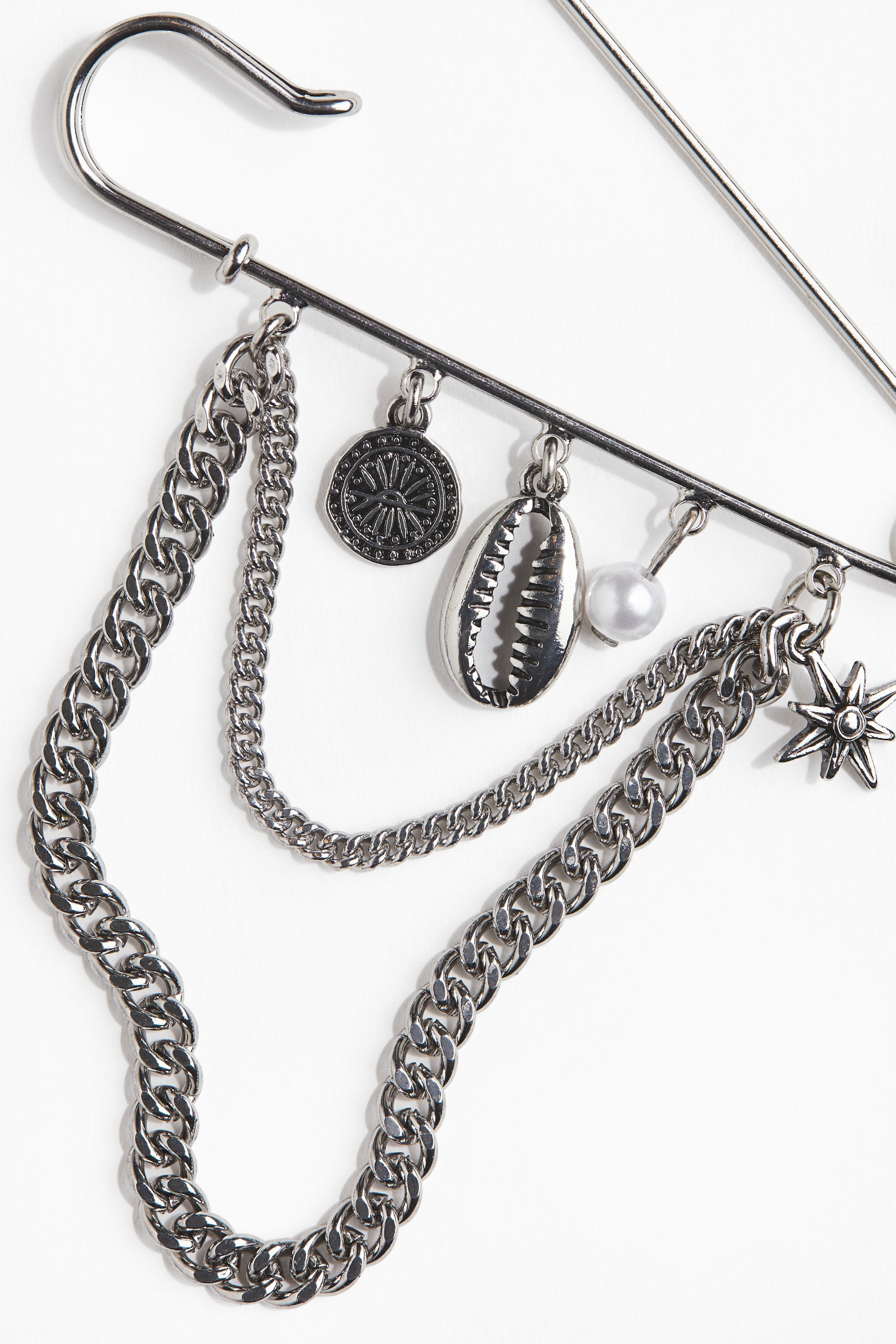 Kovová brož ve tvaru velkého zavíracího špendlíku zdobená přívěsky a řetízky v různém provedení.