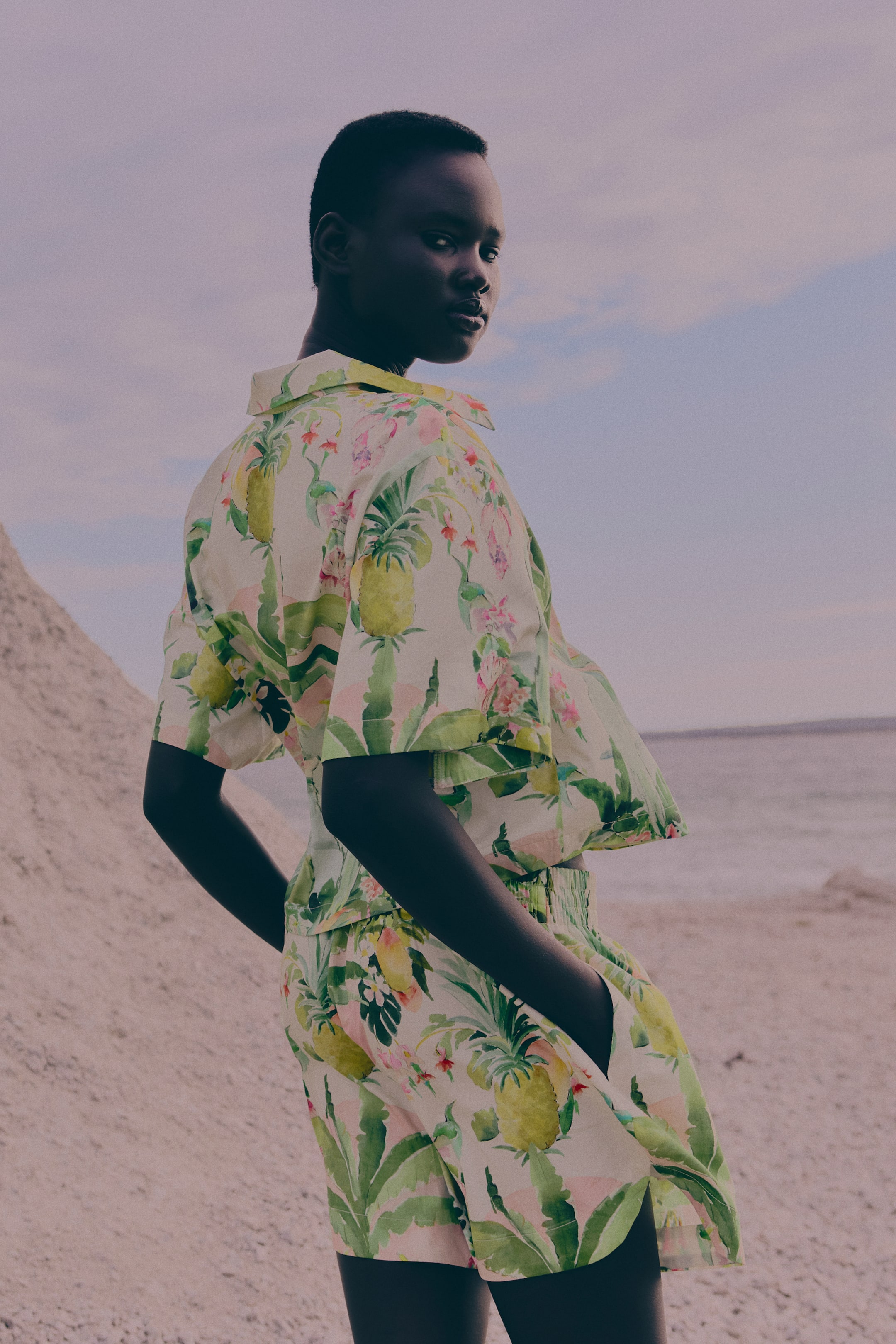Šortky z vzorované bavlněné tkaniny. Mají vysoký pas s pružným žabkováním, falešný poklopec, nenápadné postranní kapsy a kulaté lemy nohaviček.
