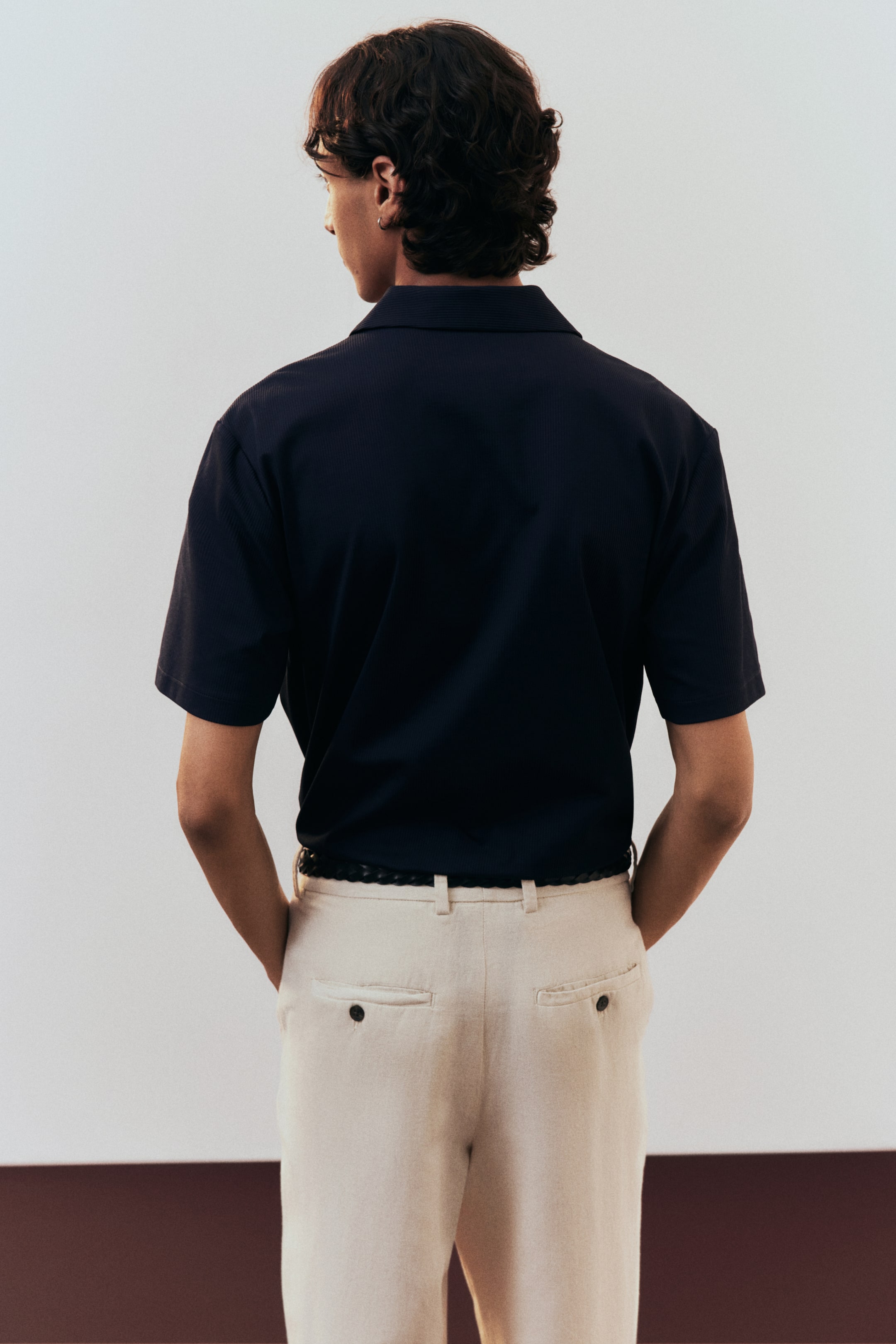Košile z žebrovaného žerzeje vyrobeného z bavlněné směsi. Má krátké rukávy, límeček s rozhalenkou typu resort, hladkou knoflíkovou légu a rovný dolní lem. Díky klasickému střihu se oděv pohodlně nosí a vytváří klasickou siluetu.
