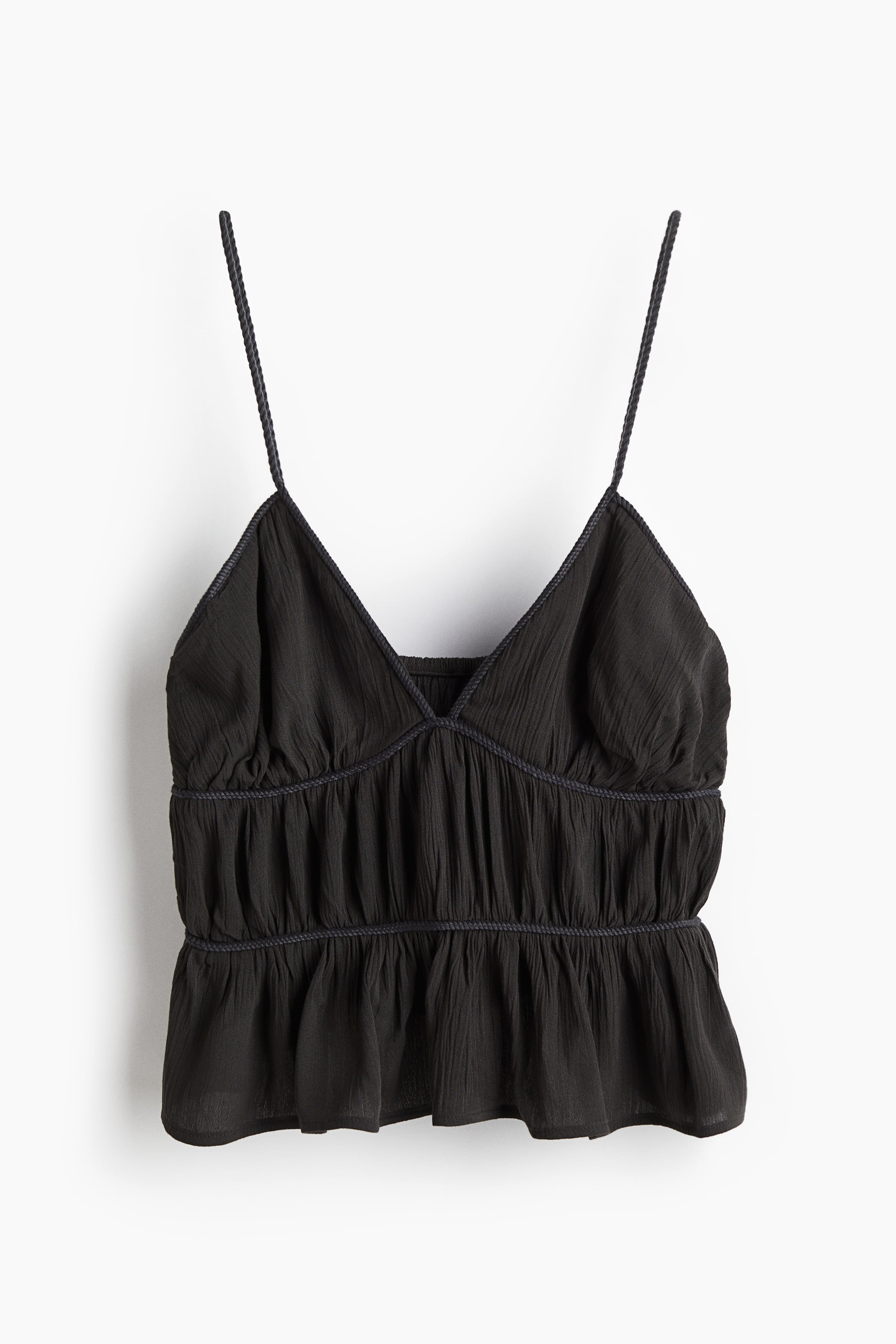 Přiléhavý top z mačkané viskózové tkaniny s úzkými splétanými předními lemy. Má výstřih do véčka, splétaná špagetová ramínka a přední nabírání. Hluboce vykrojený zadní díl s dvěma dolními řadami krytých gumiček. Dole je top lemovaný rozšířeným volánem. Přes prsa podšívka.