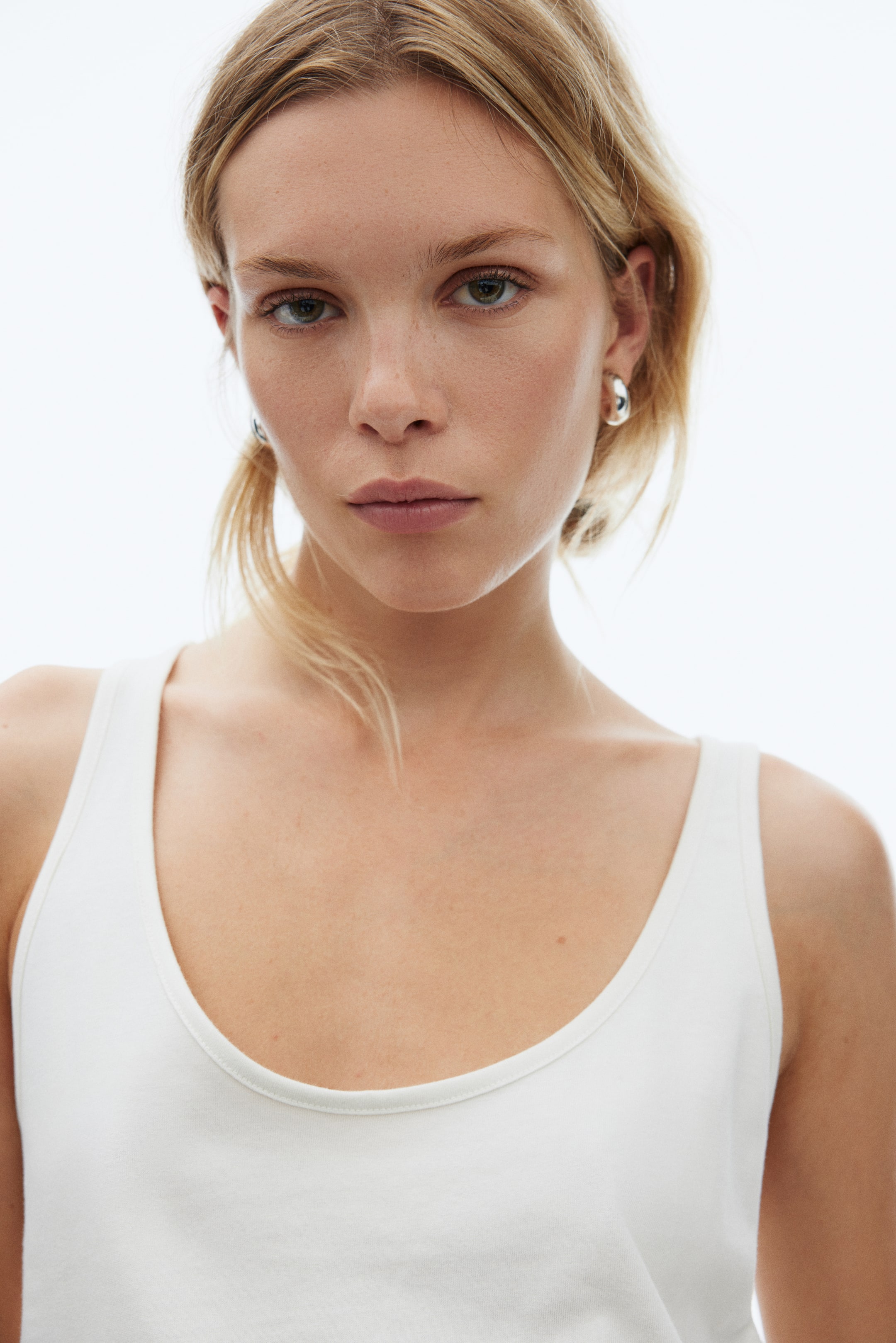 Tílko z měkkého bavlněného žerzeje. Volný střih. Má hluboký kulatý výstřih a rovný dolní lem.
