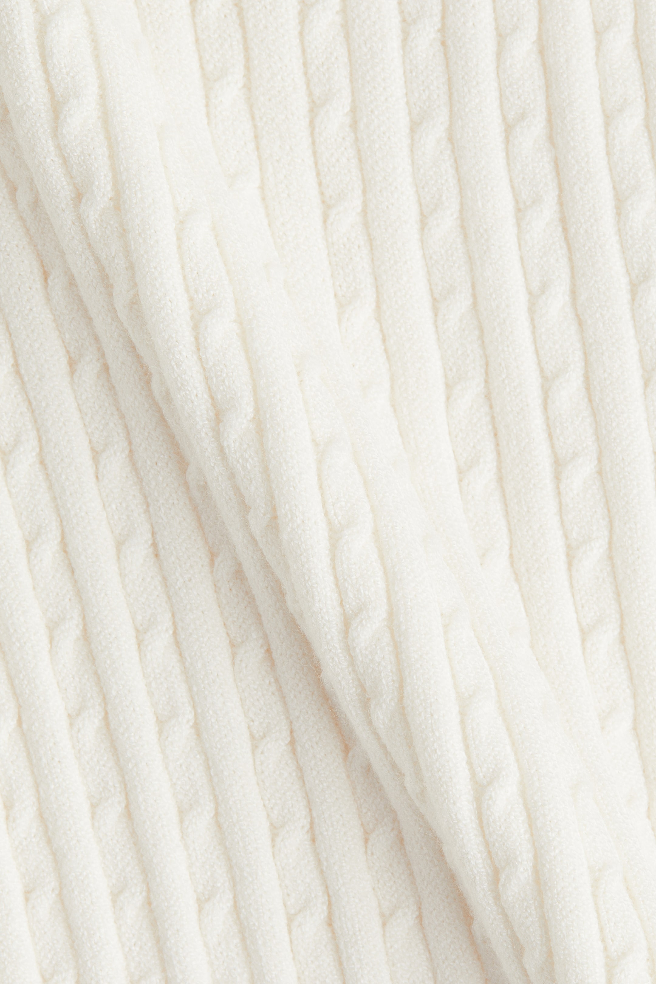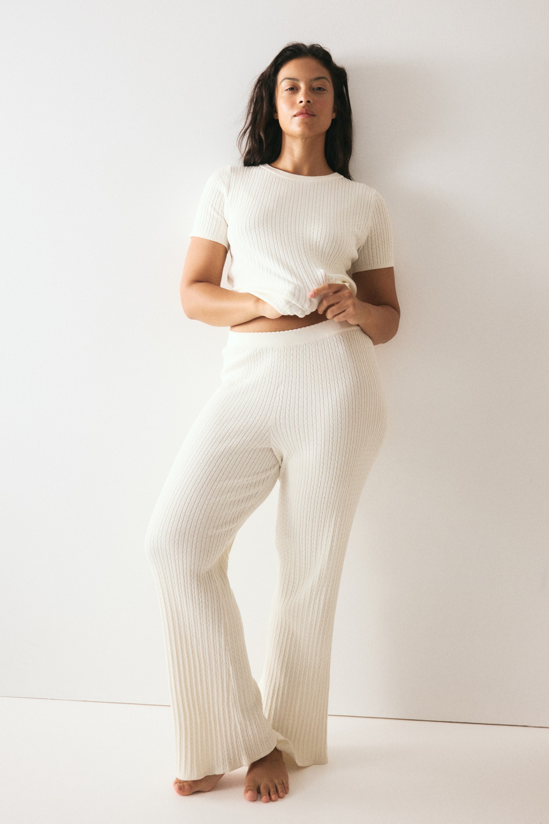 Kalhoty z měkkého copánkového úpletu. Mají pružný pas s vroubkovaným lemem a rozšířené konce nohavic.