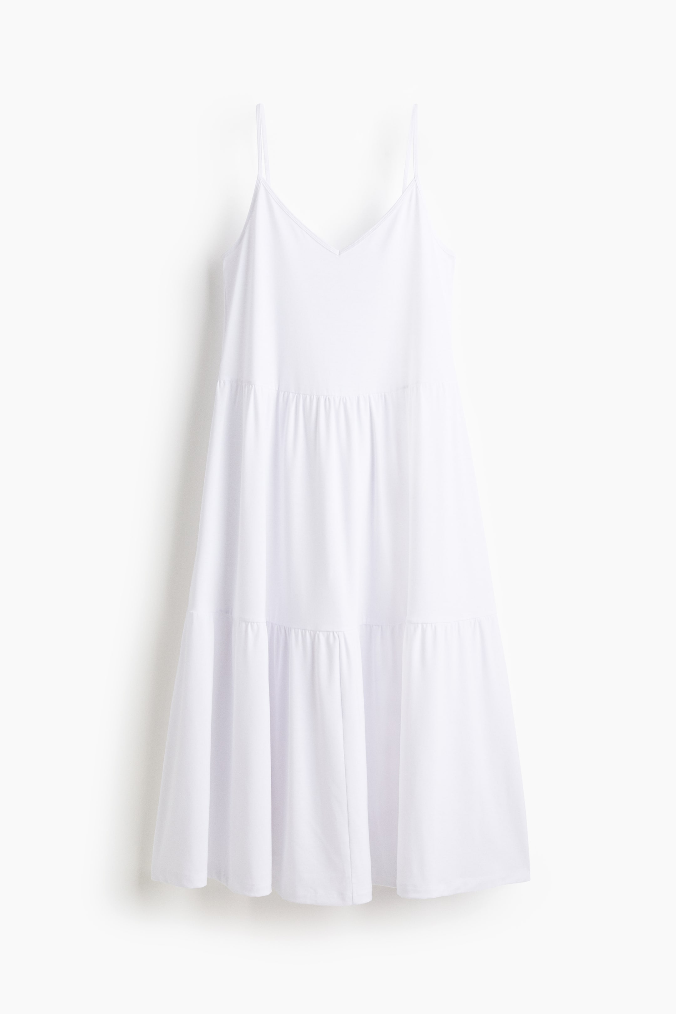 Žerzejové maxišaty s výstřihem do véčka. Mají špagetová ramínka a nabírané stupňovité díly, které jim dodávají objem.
