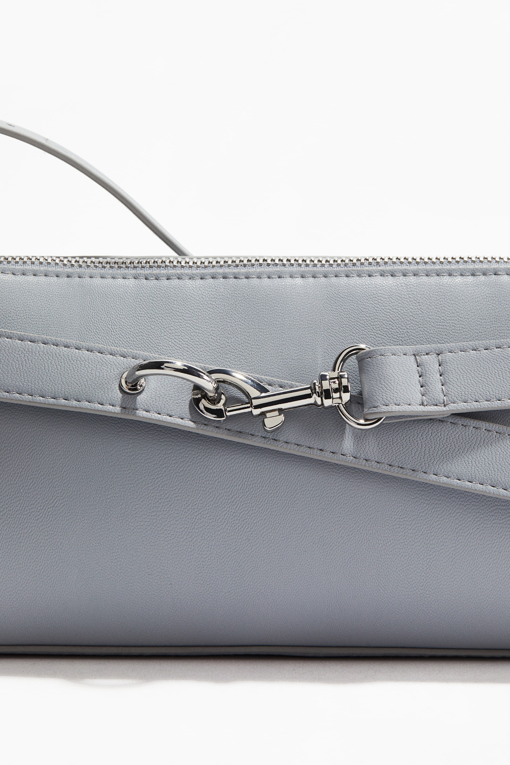 Obdélníková kabelka z potažené látky. Má nastavitelný pásek přes rameno, horní zip a ozdobný přední pásek s karabinkou. S podšívkou.