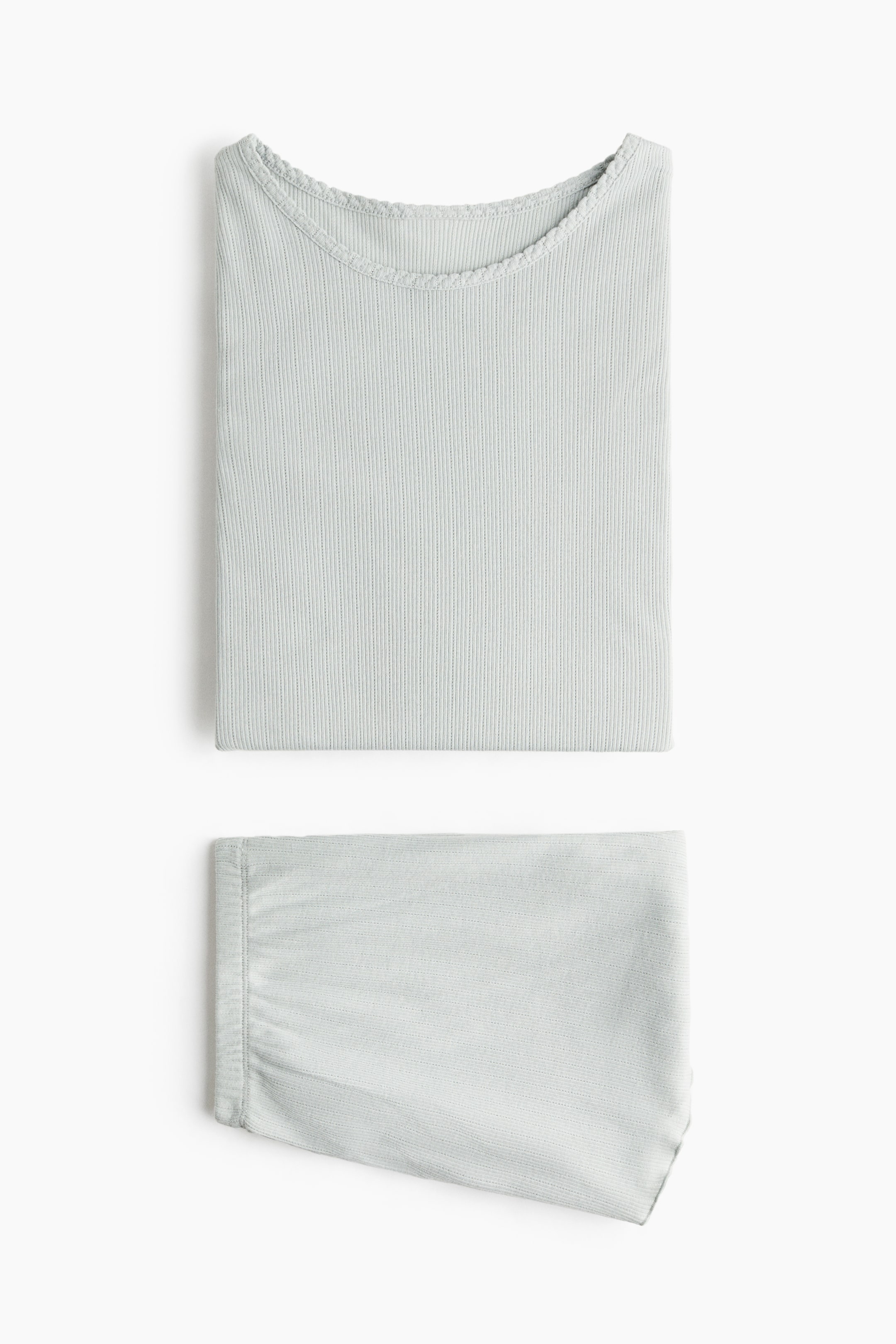 Pyžamo z měkkého ažurového žerzeje. Vršek má kulatý, lehce vroubkovaný výstřih a dlouhé rukávy. Dolní okraj i rukávy jsou začištěné overlockem. Šortky mají krytou gumu v pase a overlockové lemy nohavic.