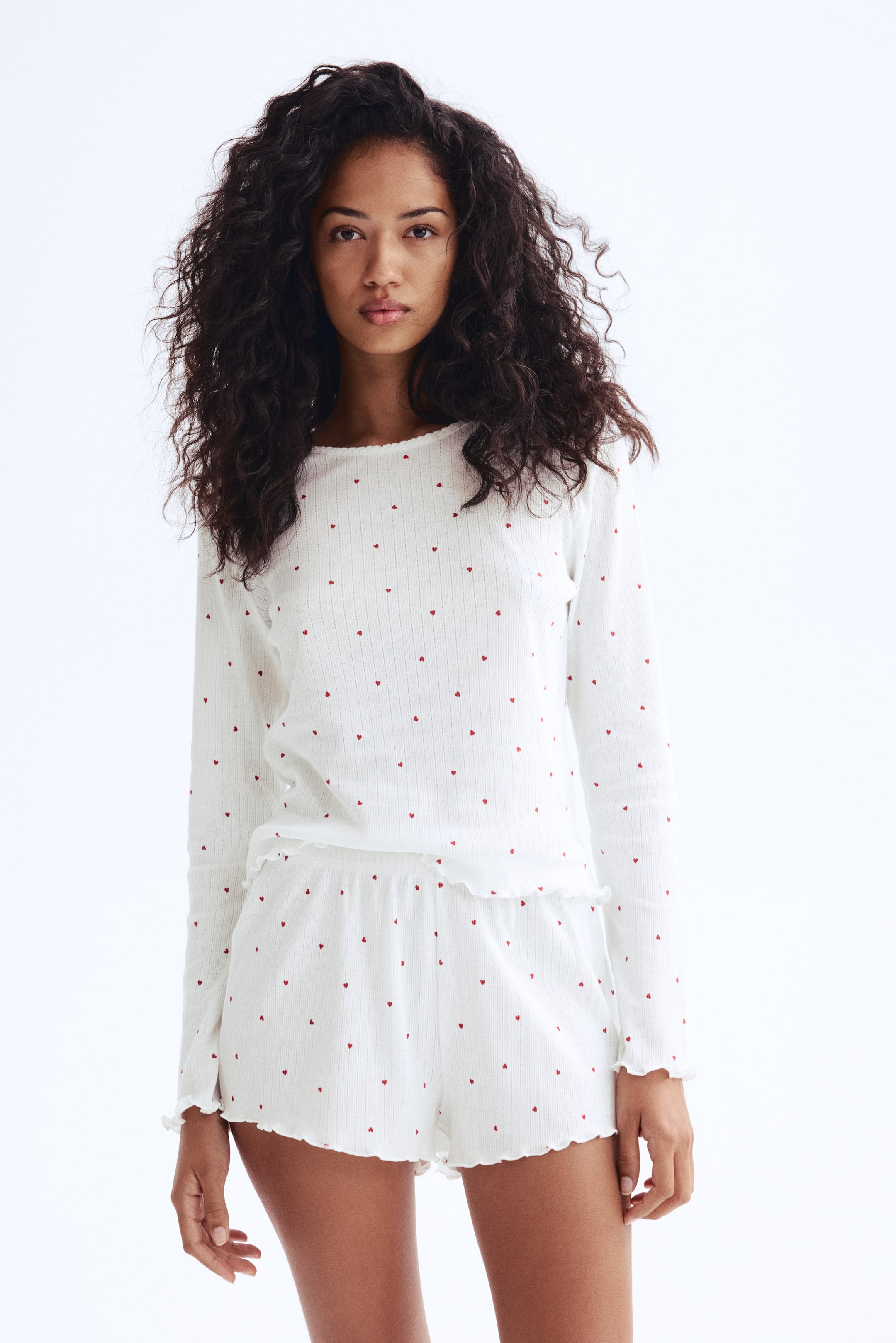 Pyžamo z měkkého ažurového žerzeje. Vršek má kulatý, lehce vroubkovaný výstřih a dlouhé rukávy. Dolní okraj i rukávy jsou začištěné overlockem. Šortky mají krytou gumu v pase a overlockové lemy nohavic.