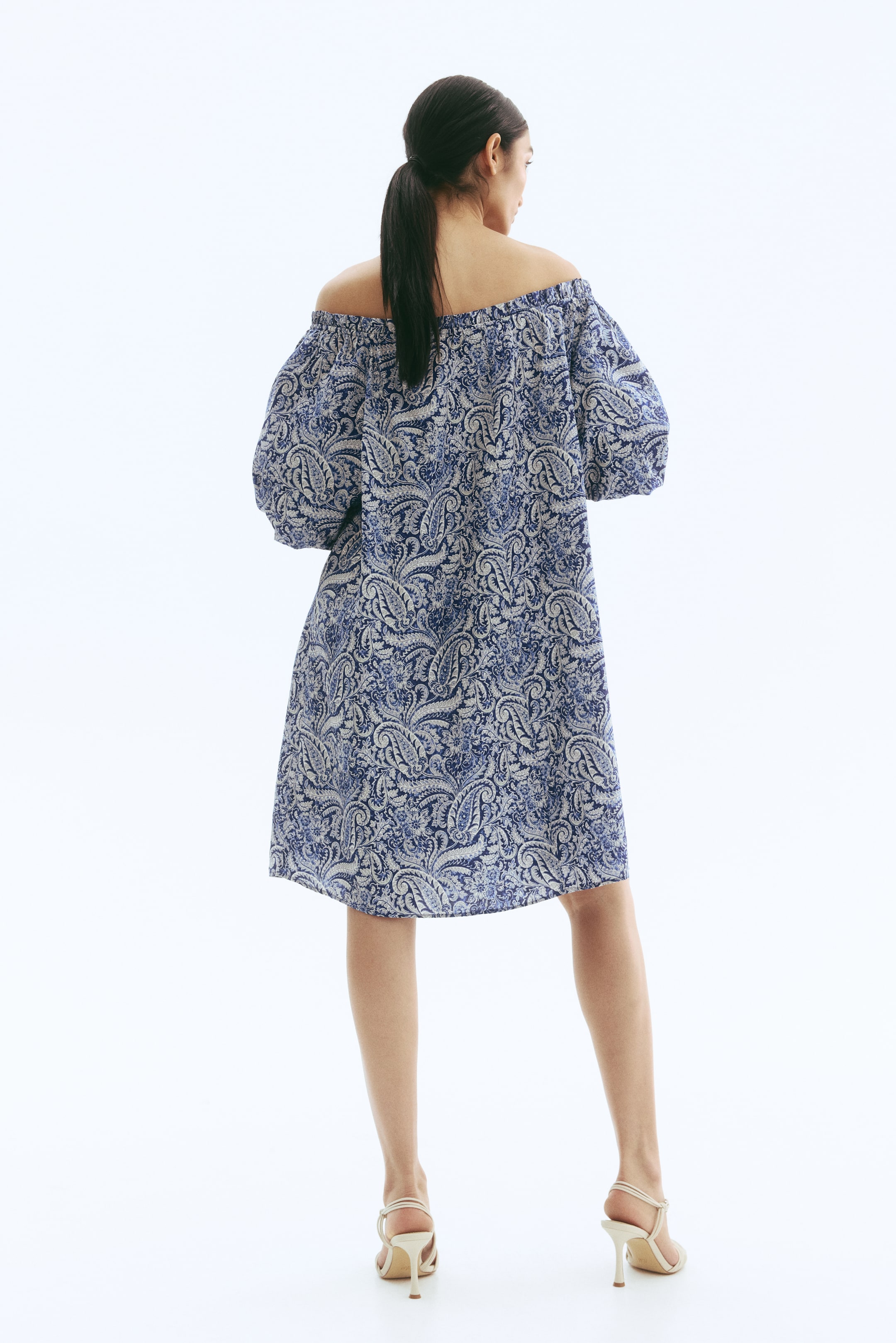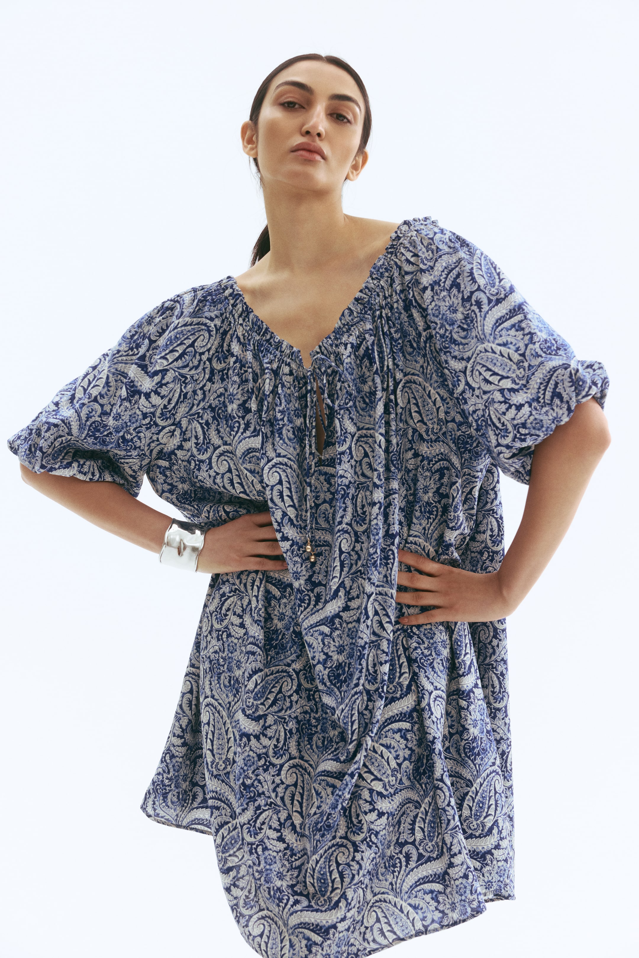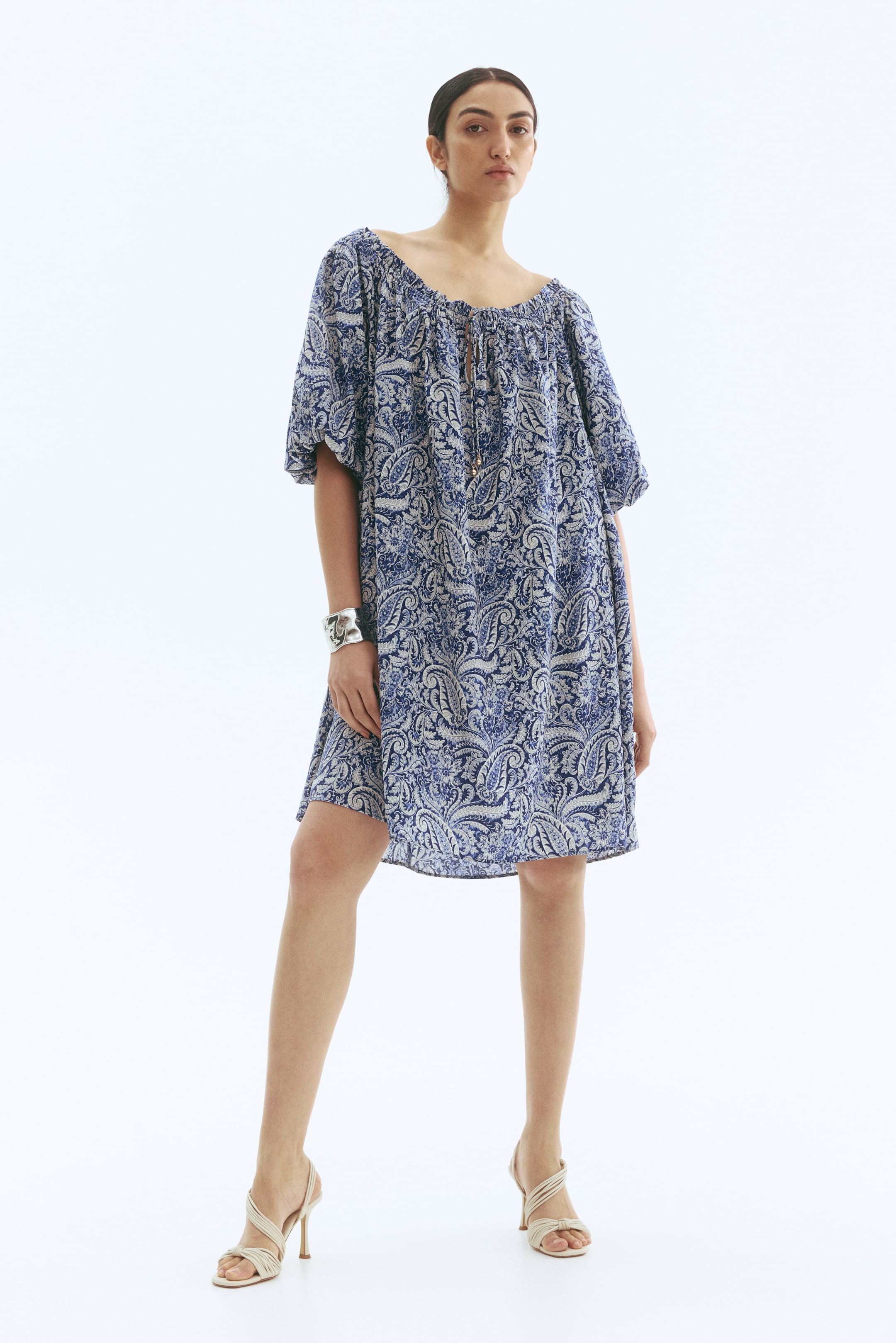 Krátké šaty áčkového střihu z tkaniny. Mají hluboký, široký výstřih s malým volánkem a úzkou krytou gumou. Přední průstřih do véčka se špagetovými vázačkami zakončenými korálky. Krátké balonové rukávy s podšívkou.