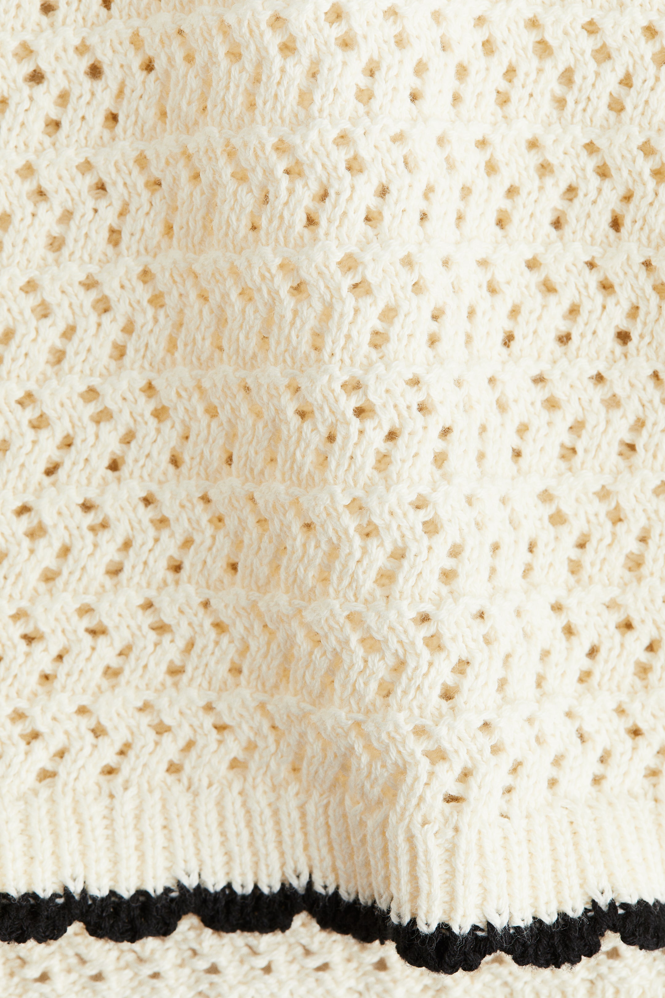 Svetr z měkkého dírkovaného bavlněného úpletu s žebrovanými vroubkovanými lemy. Má kulatý výstřih, spuštěná ramena a zdobené přední aplikace.