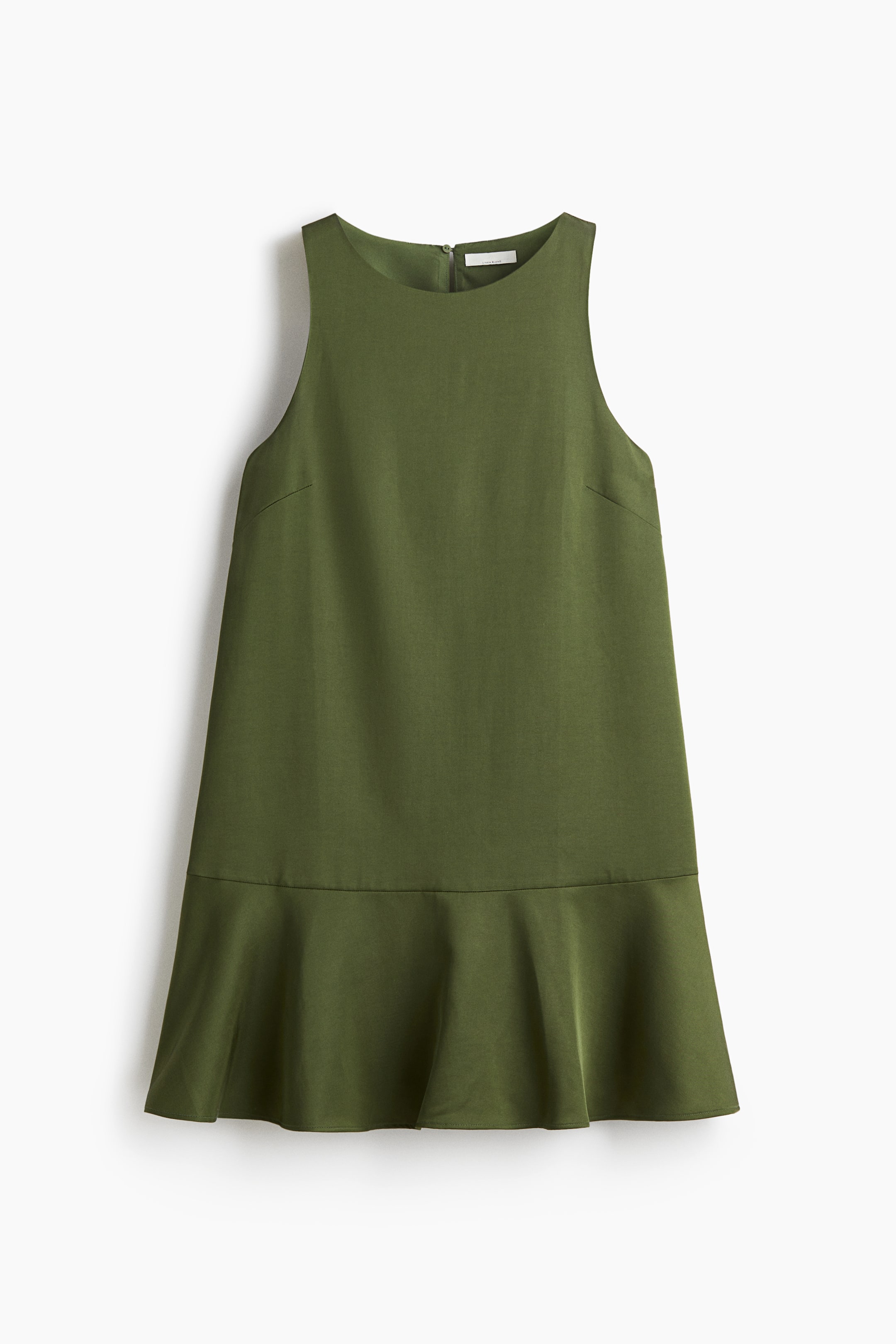 Krátké šaty z tkaniny vyrobené z lněné směsi. Áčkový střih bez rukávů. Mají kulatý výstřih, zadní kapkový průstřih se skrytým knoflíkem a kolový dolní lem, který jim dodává objem. S podšívkou.