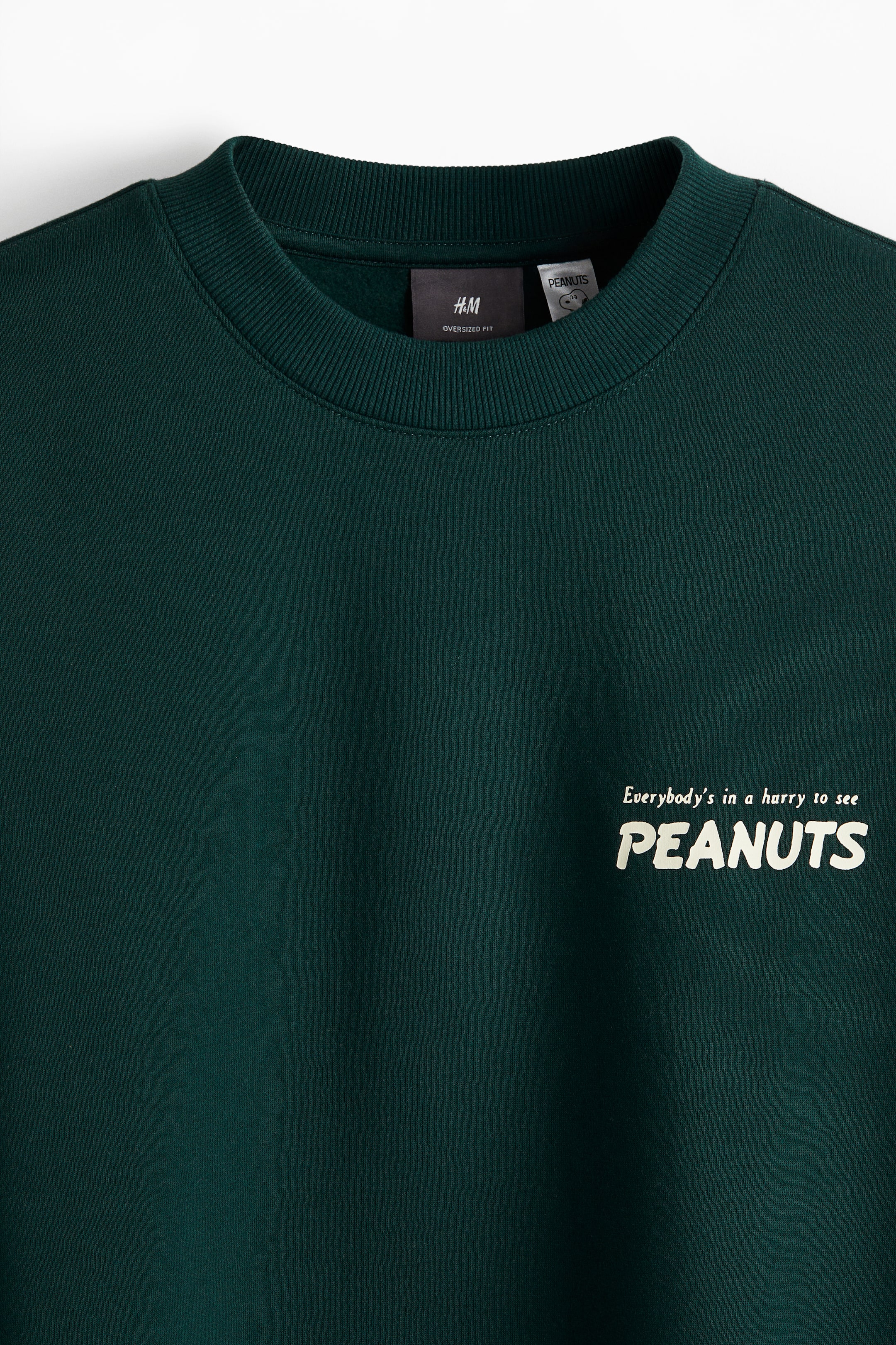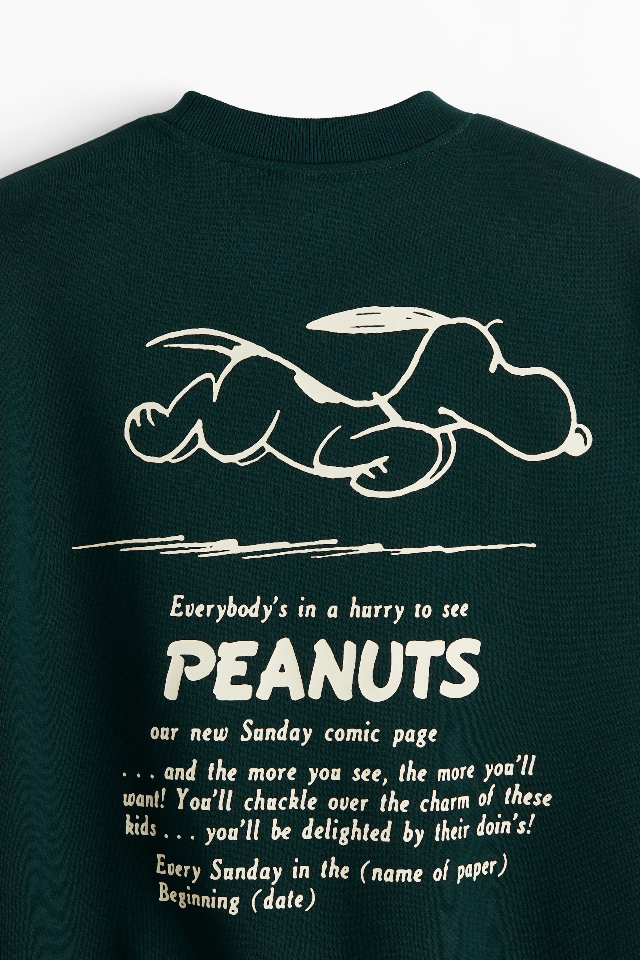 Mikina z teplákoviny vyrobené z bavlněné směsi střední gramáže s tištěnými motivy. Vnitřní strana je měkce česaná. Má kulatý výstřih s žebrovaným lemem a žebrované lemy rukávů a dolního okraje. Objemný střih vytváří plandavou, nápadně volnou siluetu.