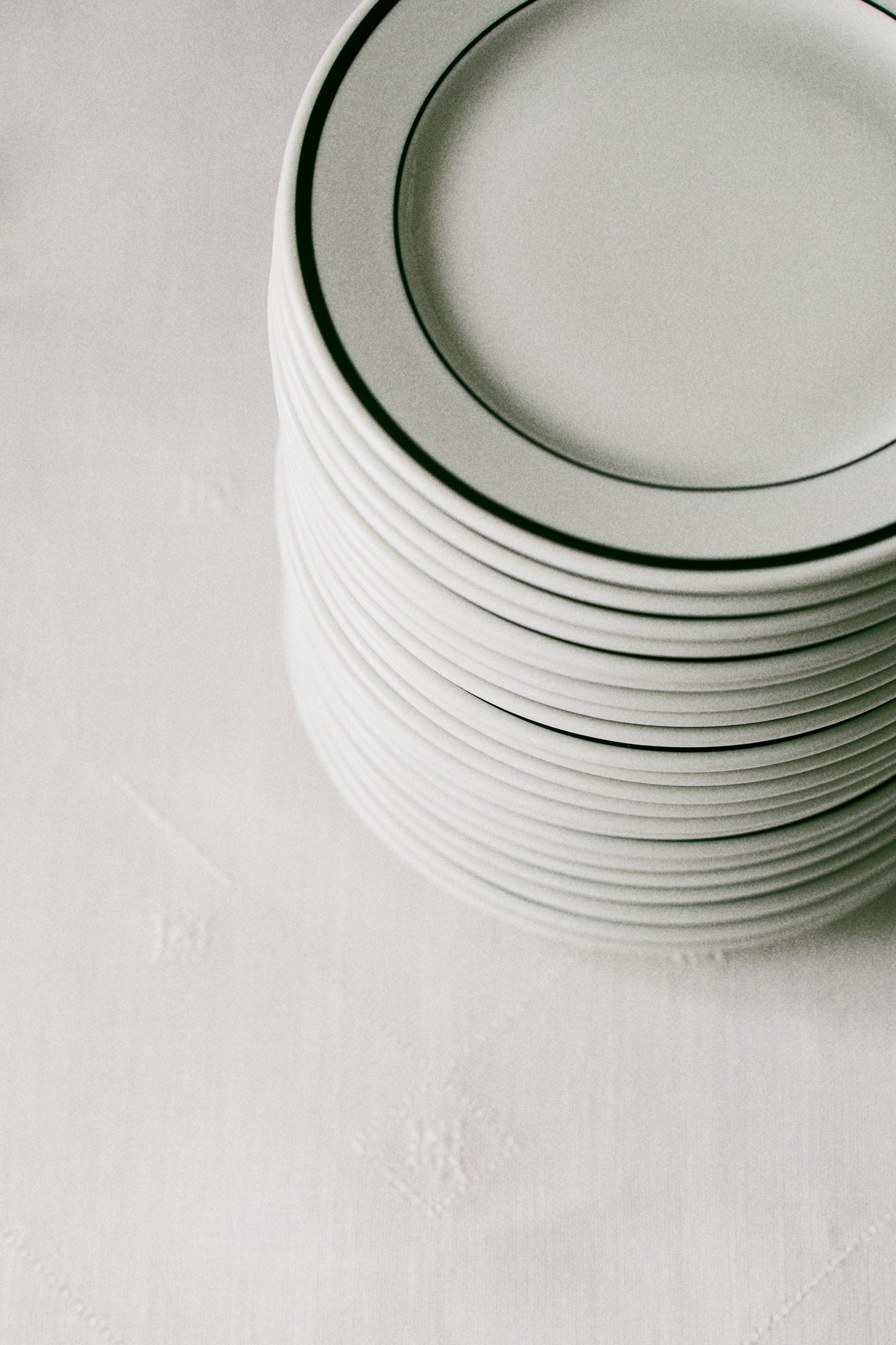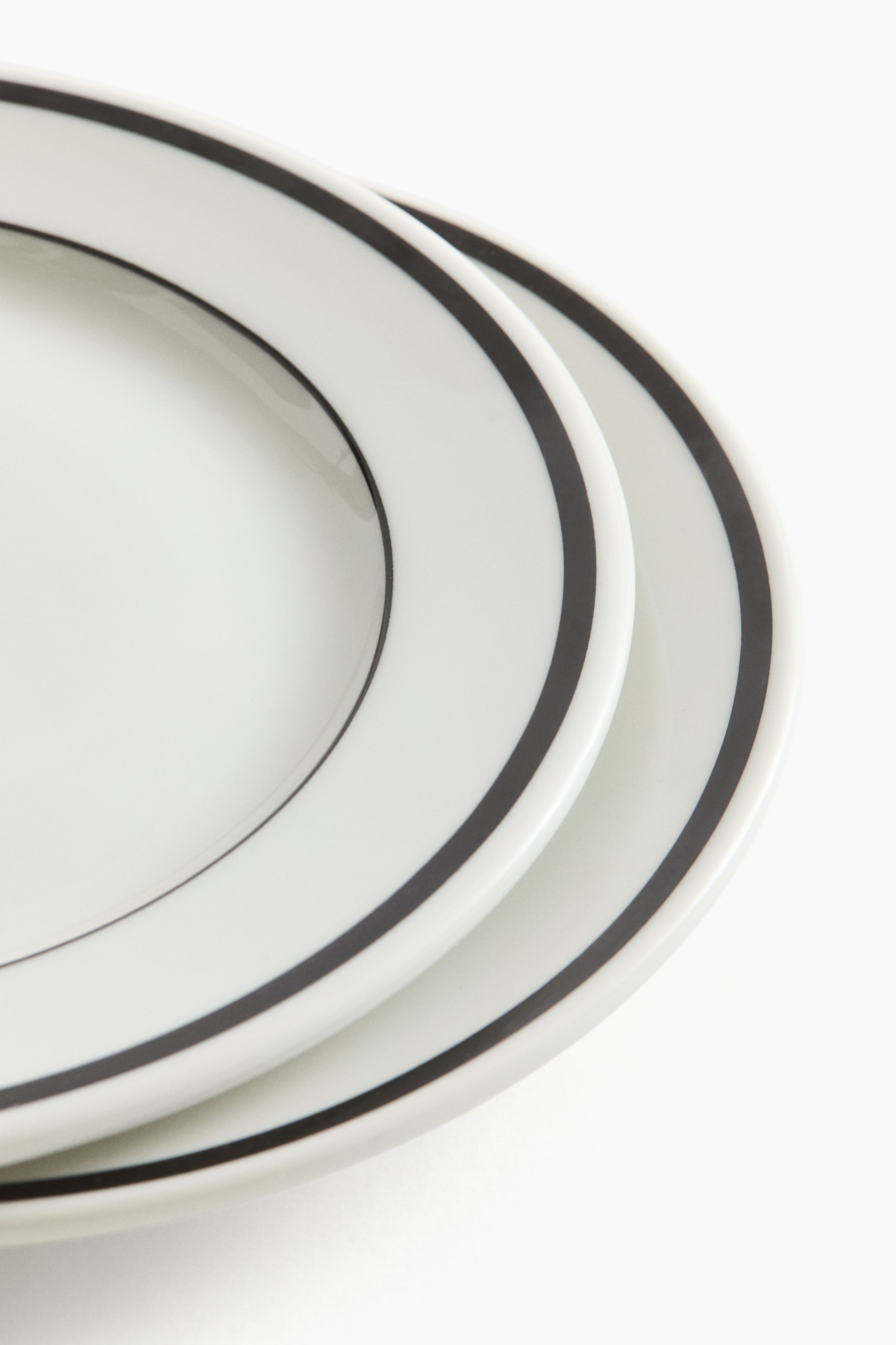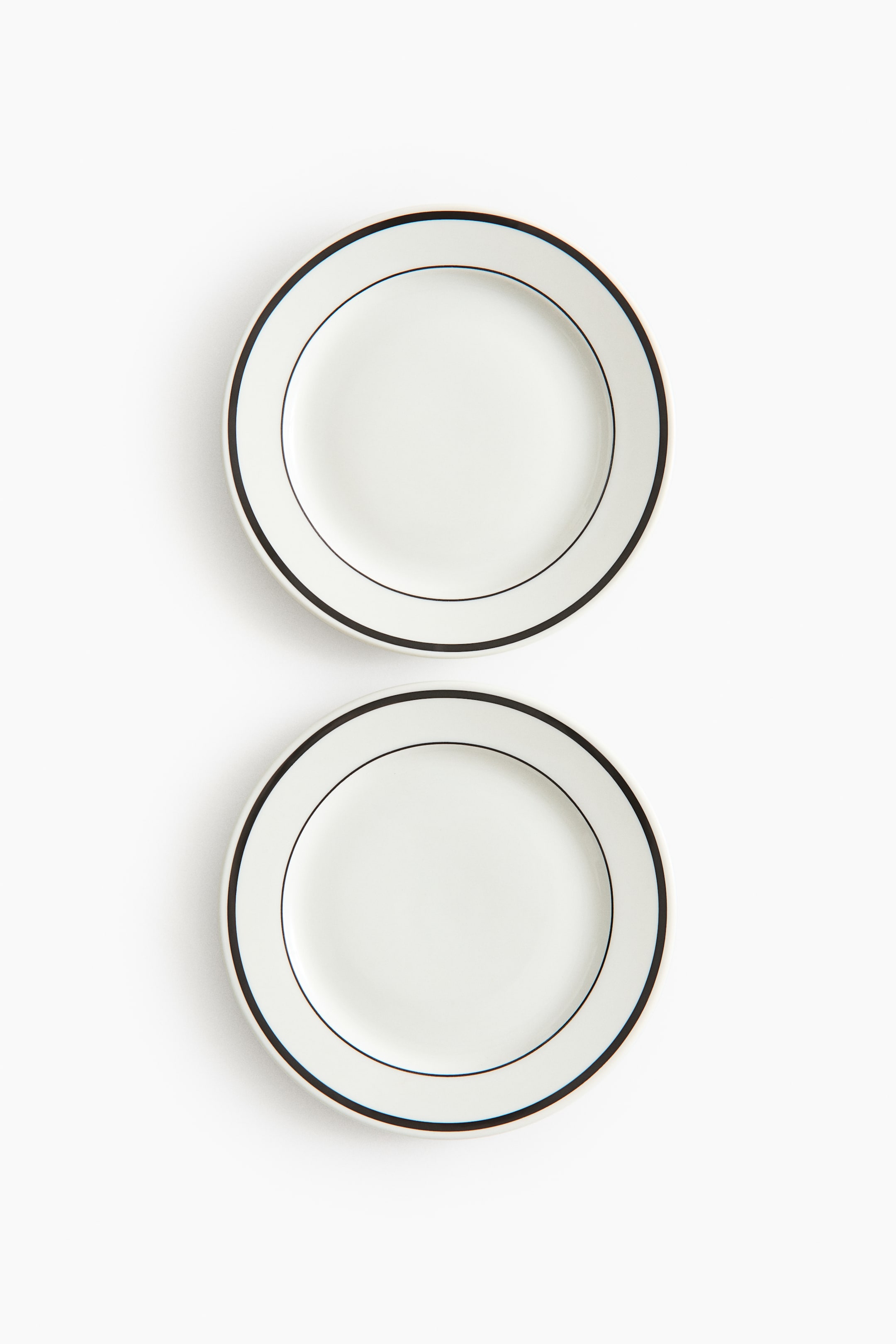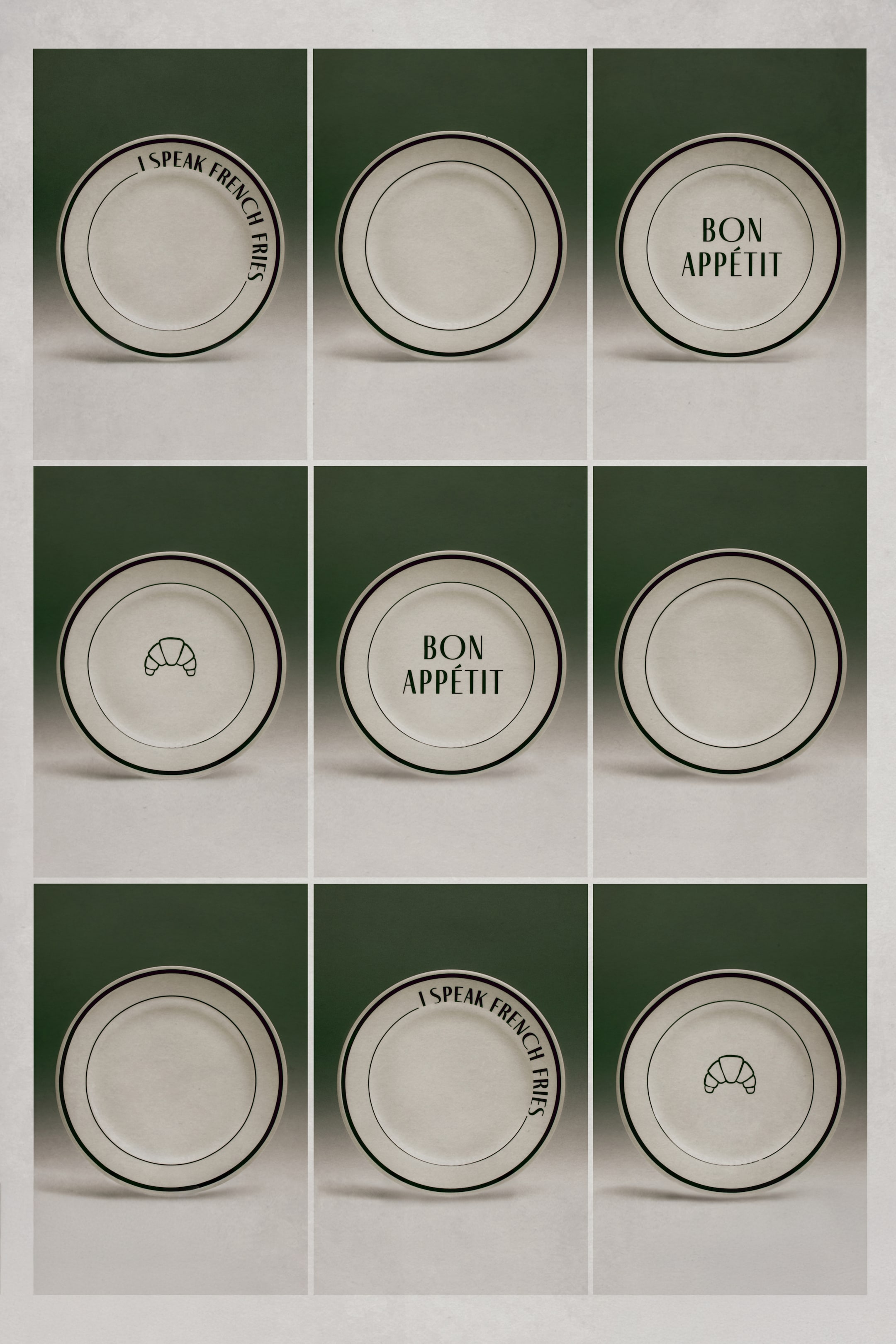 Dva střední porcelánové talíře s klasickým malovaným okrajem, inspirované útulnými francouzskými pouličními bistry.