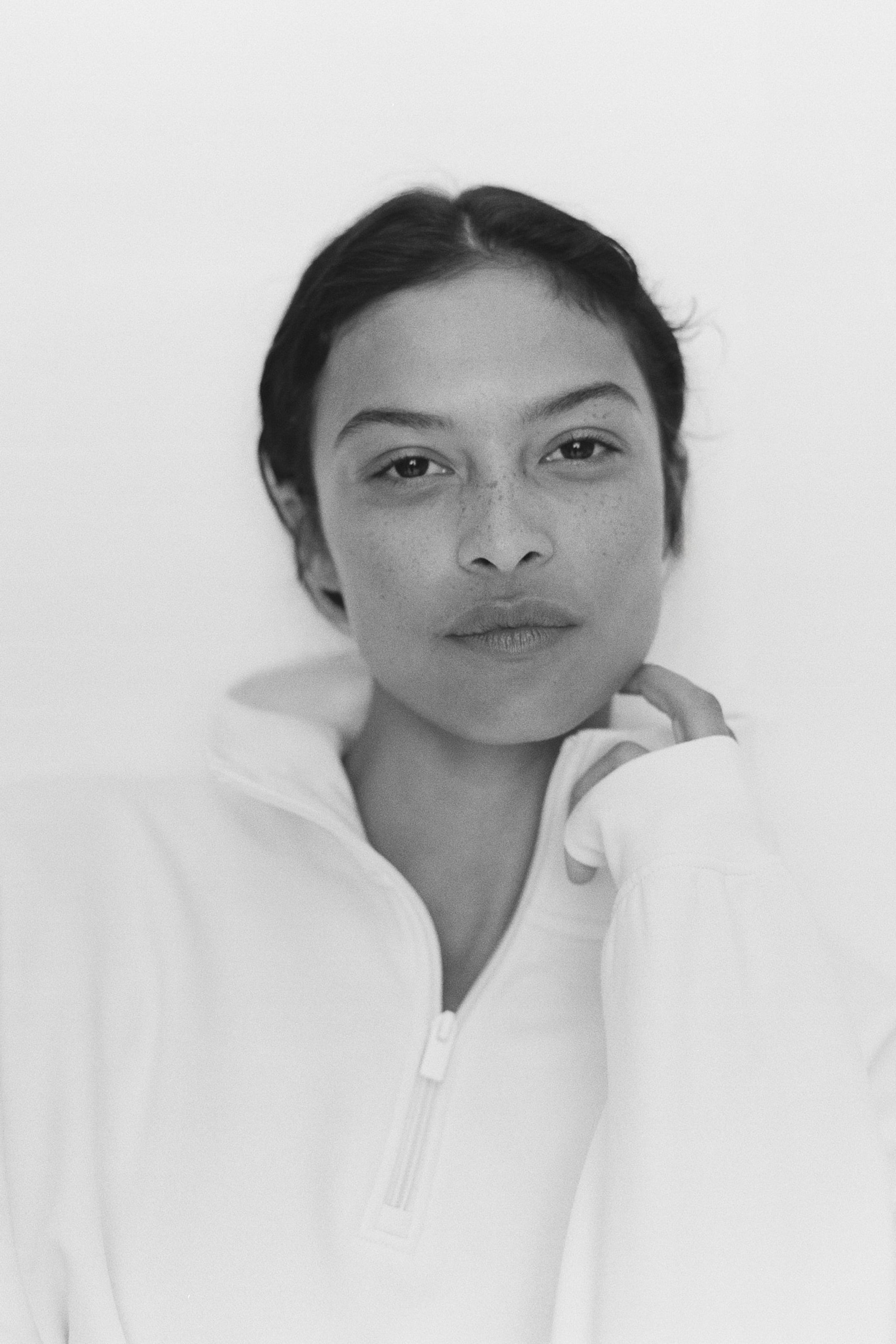 Objemná mikina z teplákoviny s měkce česaným rubem. Má stojáček, horní zip, spuštěná ramena a žebrované lemy rukávů a dolního okraje.