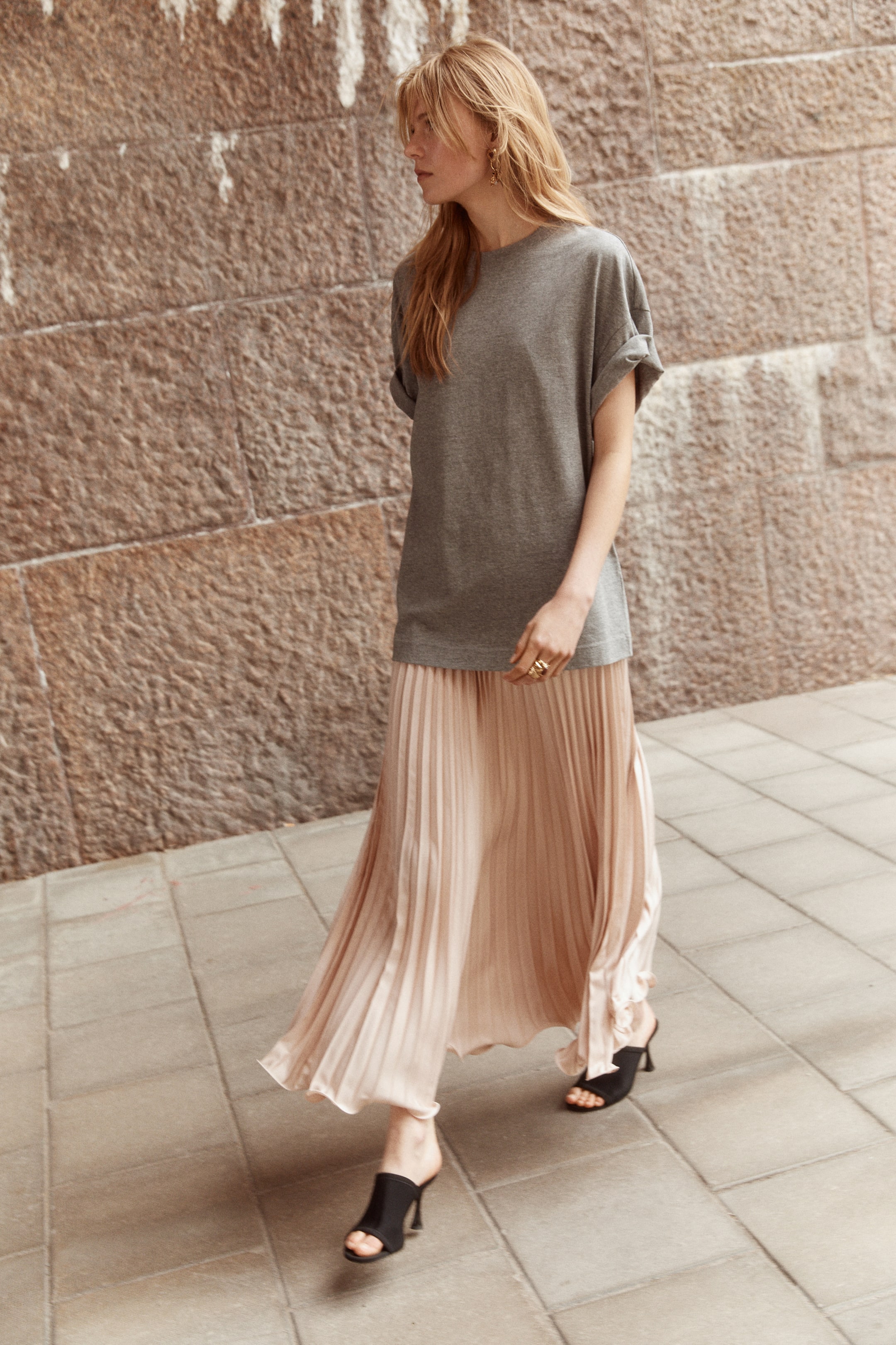 Maxisukně z plisované tkaniny. Volný střih. Má vysoký pas s pružným lemem a overlockový dolní lem. S podšívkou.