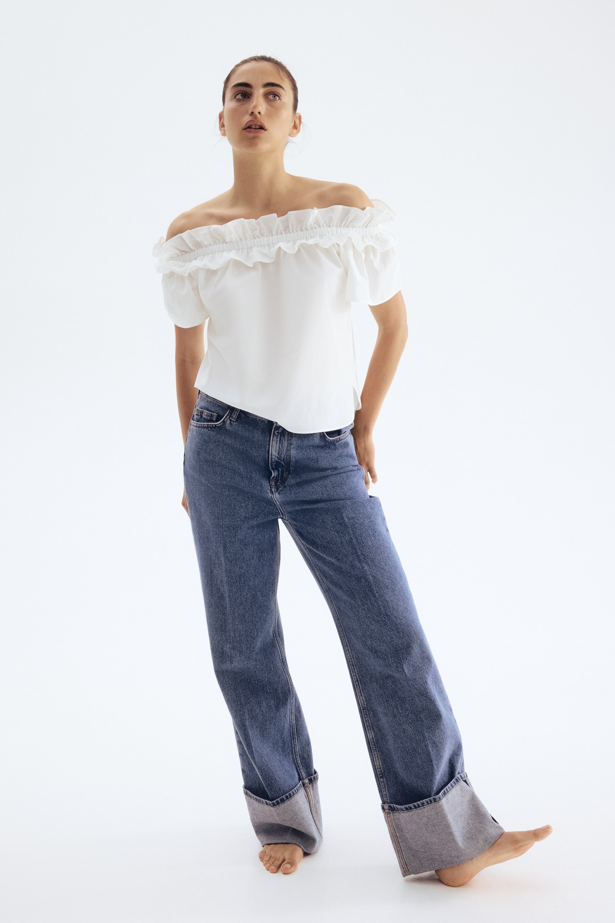 Halenka z tužšího bavlněného popelínu. Volný střih odhalující ramena. Krátké rukávy. Nahoře má pružný volánkový lem.