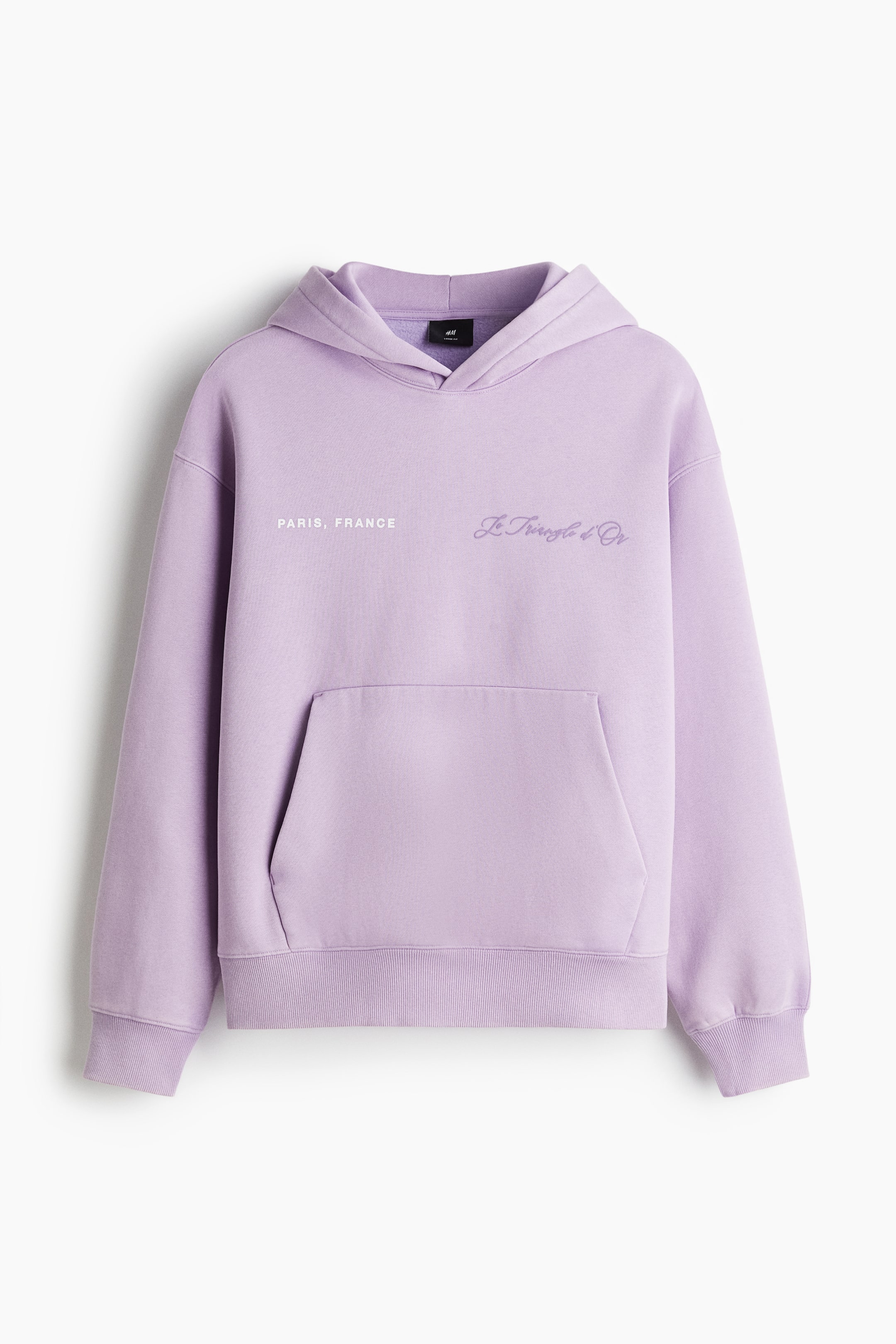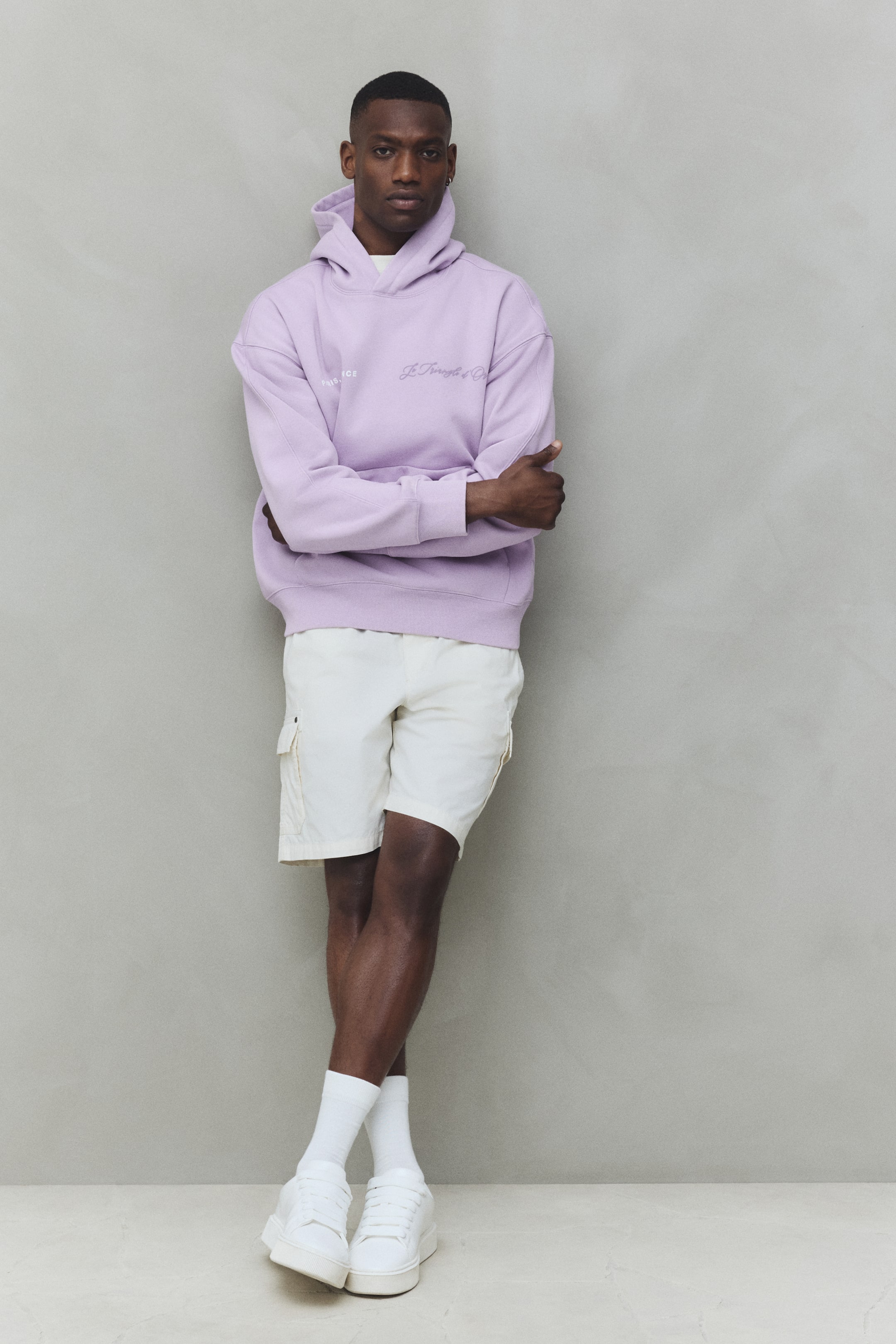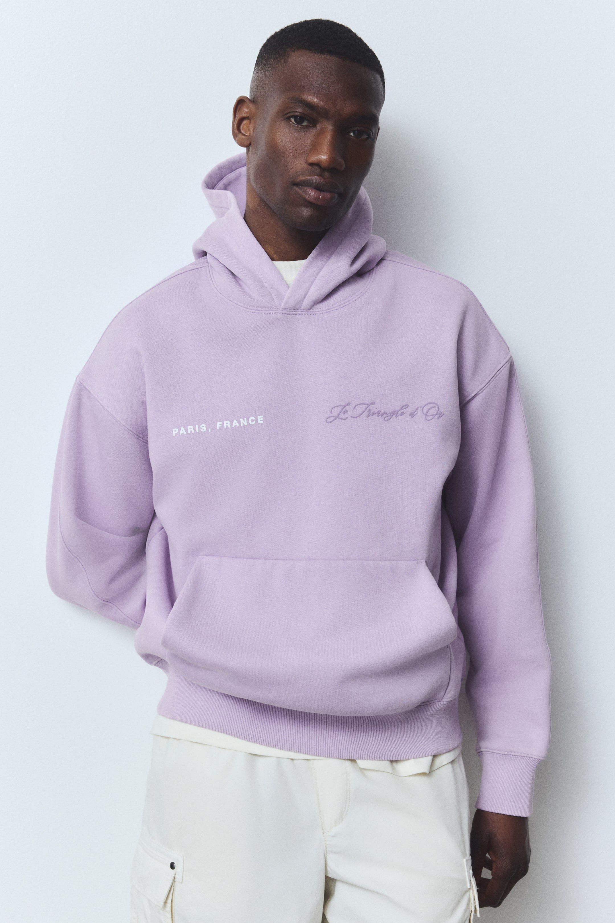 Mikina z teplákoviny vysoké gramáže, vyrobené z bavlněné směsi, s měkce česaným rubem. Má kapuci, spuštěná ramena, klokaní kapsu a široké žebrované lemy rukávů a dolního okraje. Volný střih vytváří velkorysou, ale nepříliš objemnou siluetu.
