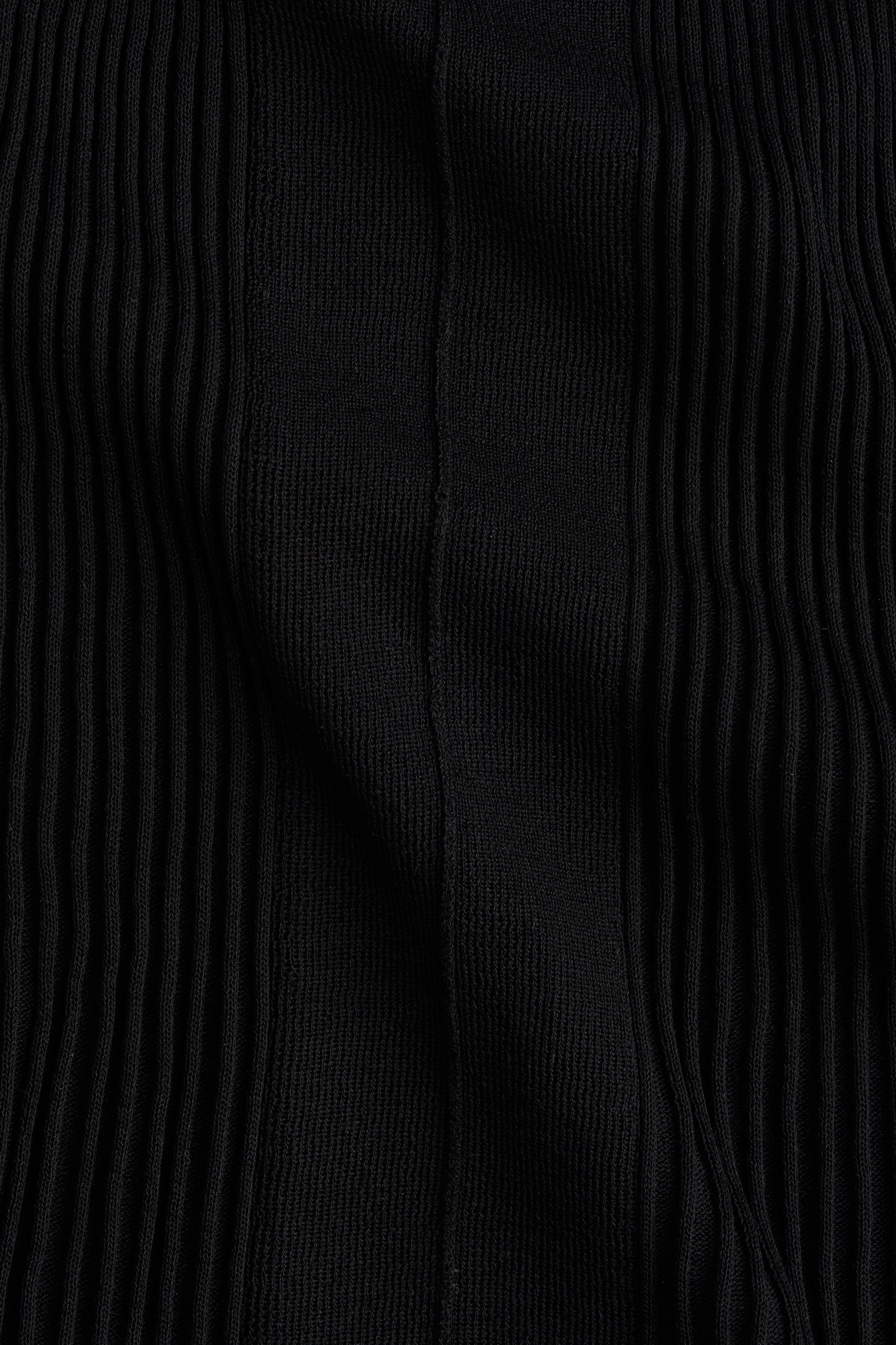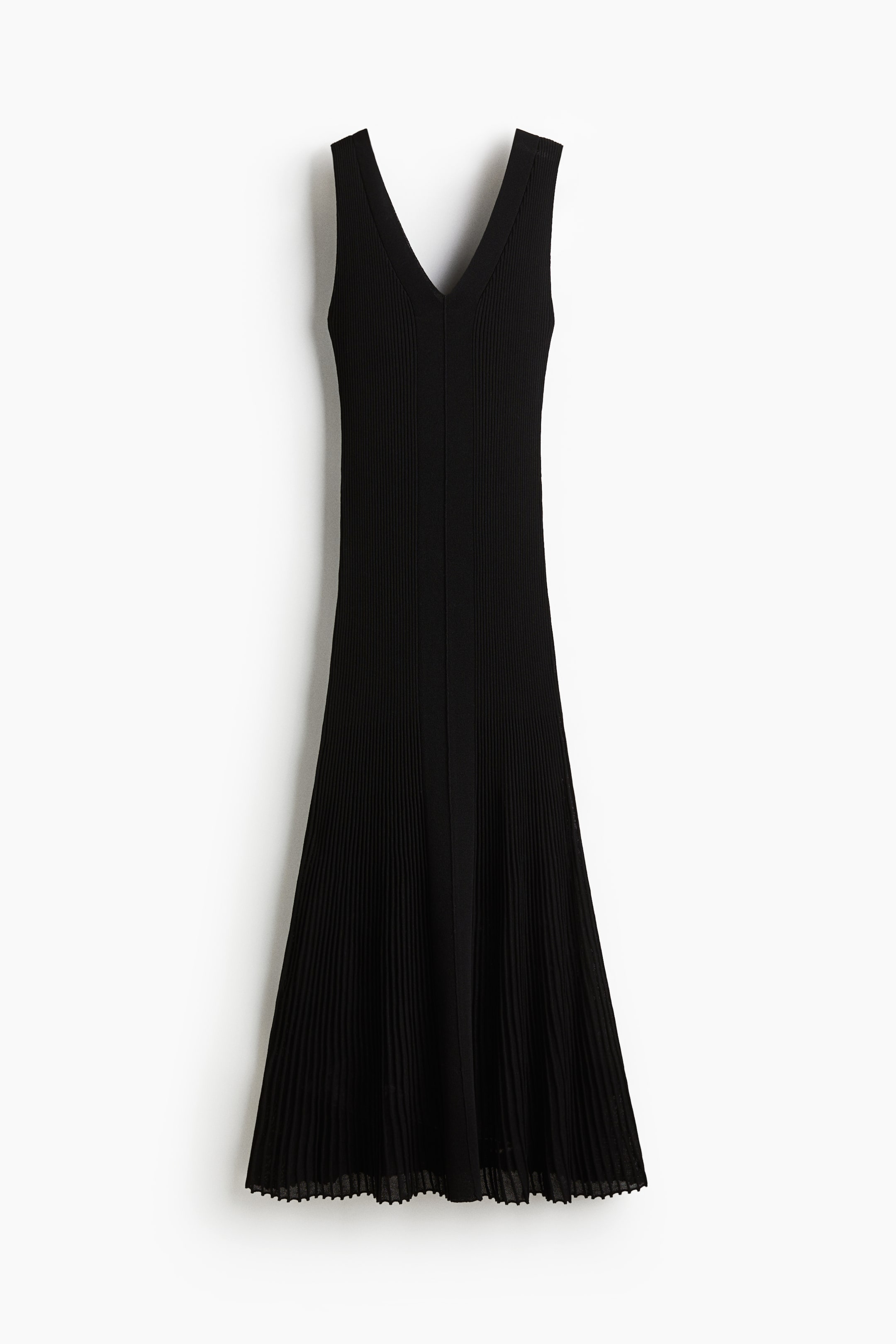 Přiléhavé šaty z žebrovaného úpletu. Jsou dlouhé ke kotníkům. Dolní lem je prostornější, a tak vytvářejí rozšířenou siluetu. Mají špagetová ramínka a hluboký přední i zadní výstřih do véčka.