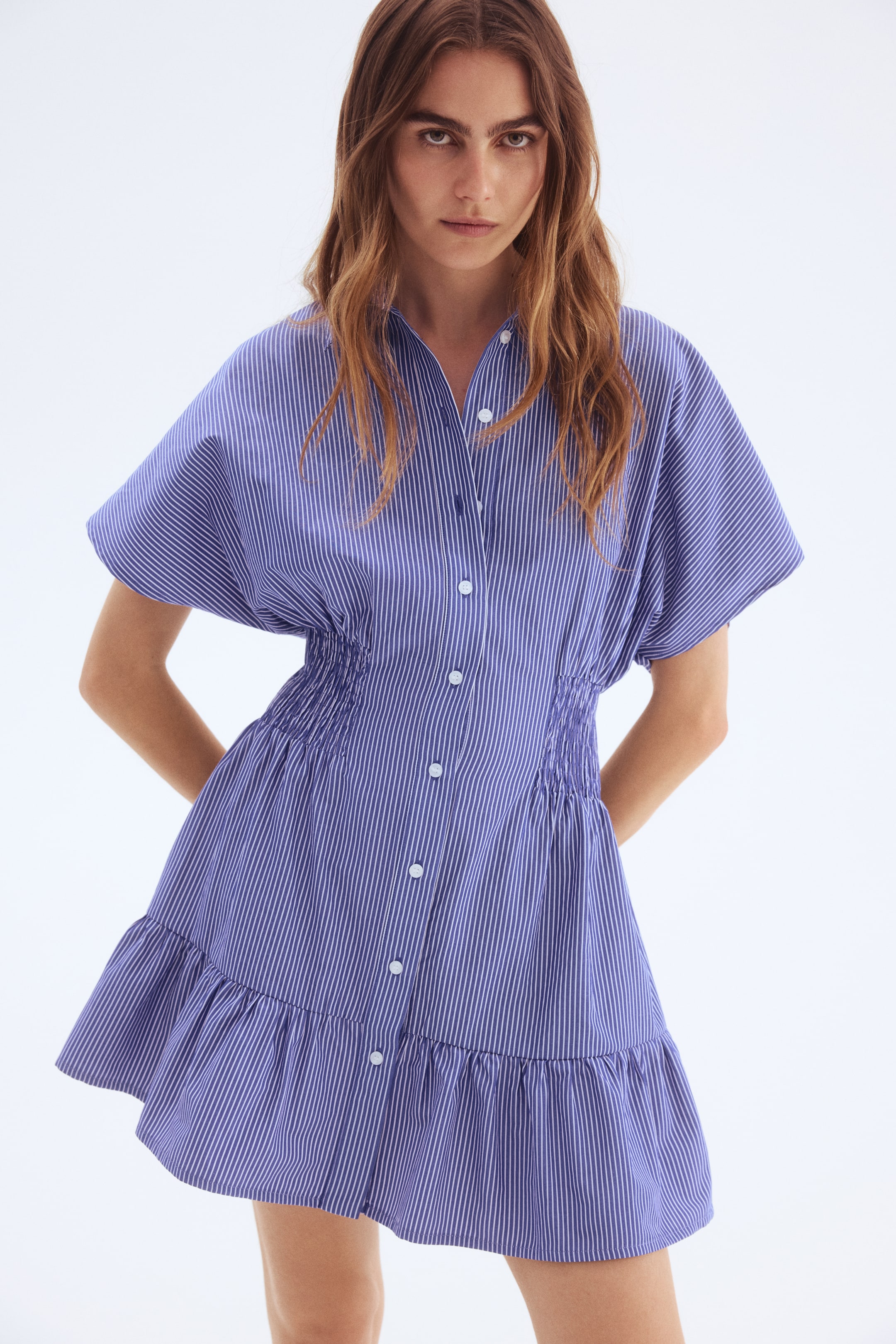 Krátké šaty z tužšího popelínu vyrobeného z bavlněné směsi. Mají límeček, přední zapínání na knoflíky, motýlkové rukávy a nabíraný dolní volán. Projmutý pas s širokým žabkováním vytváří výraznou siluetu. Bez podšívky.