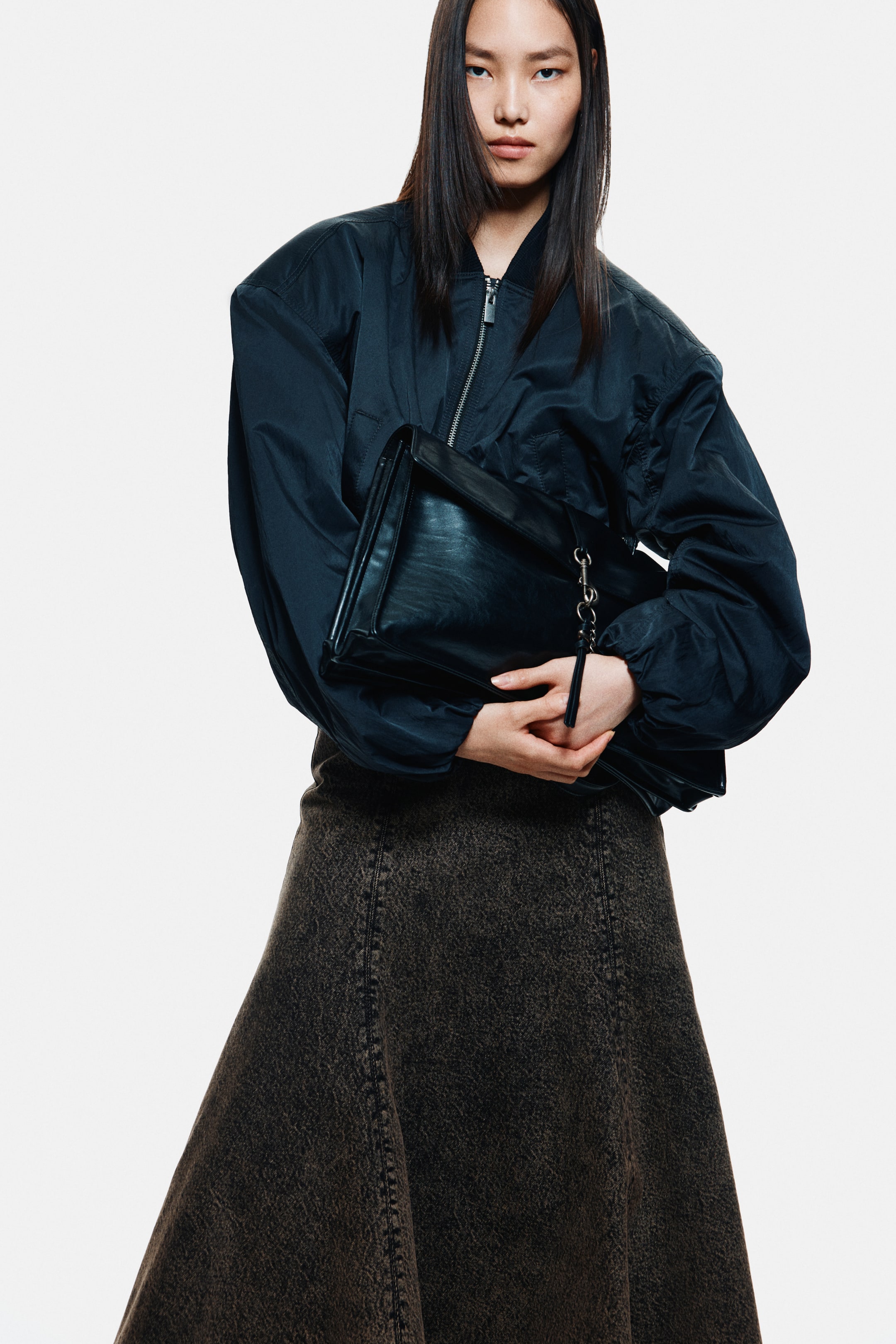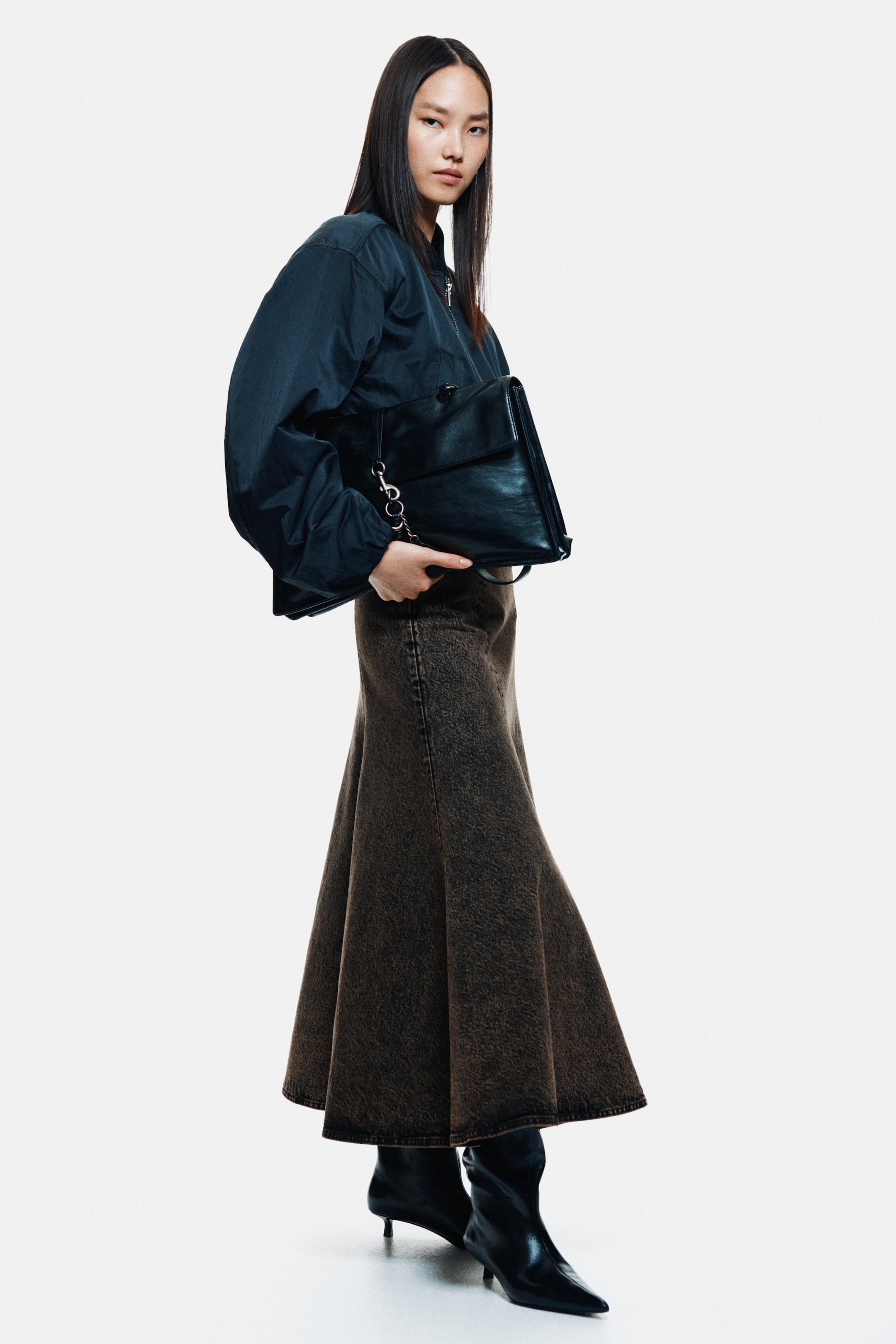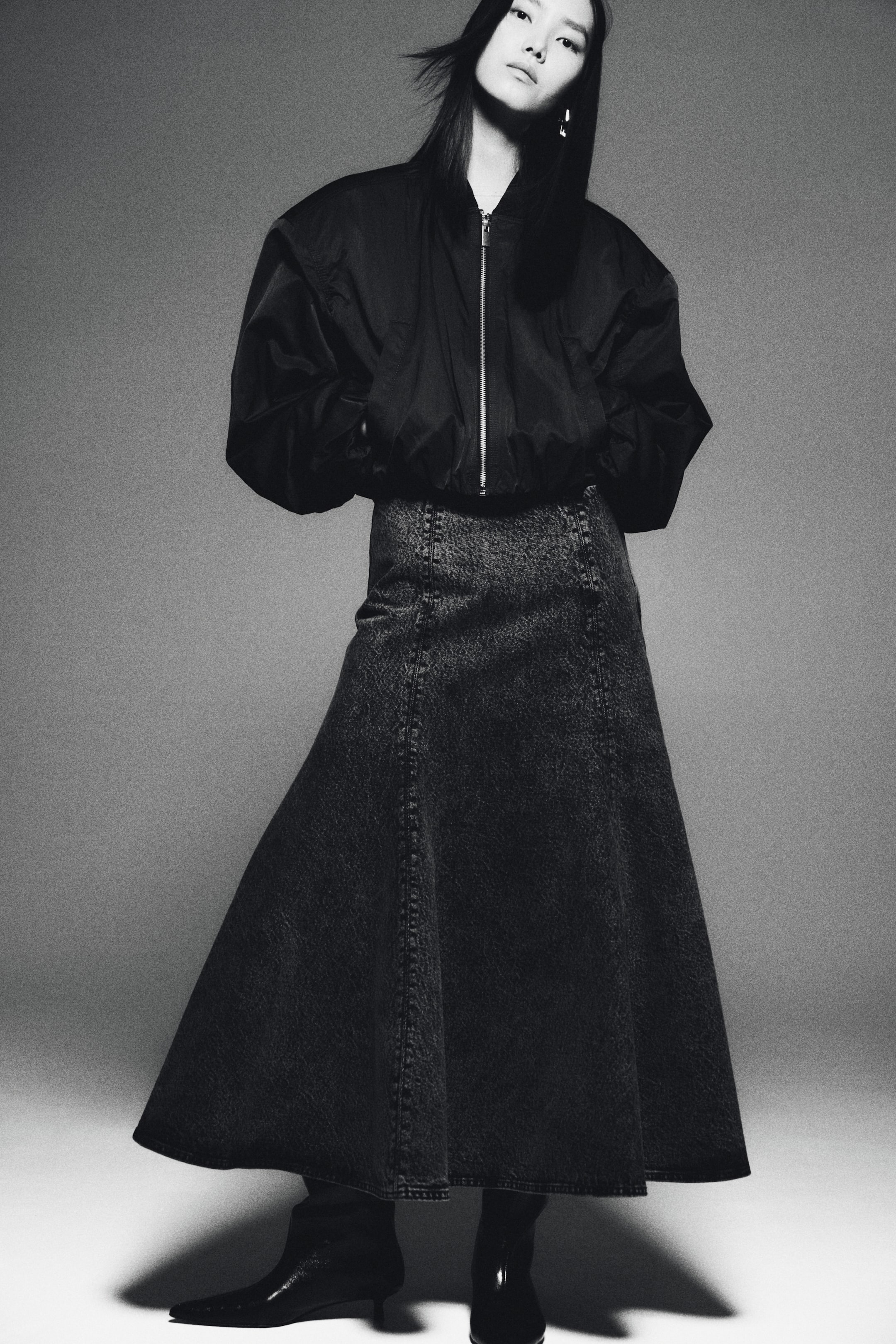 Sukně z pevného bavlněného denimu. Má rozšiřující se tvar a je dlouhá po kotníky. Klasický pas se skrytým bočním zipem.