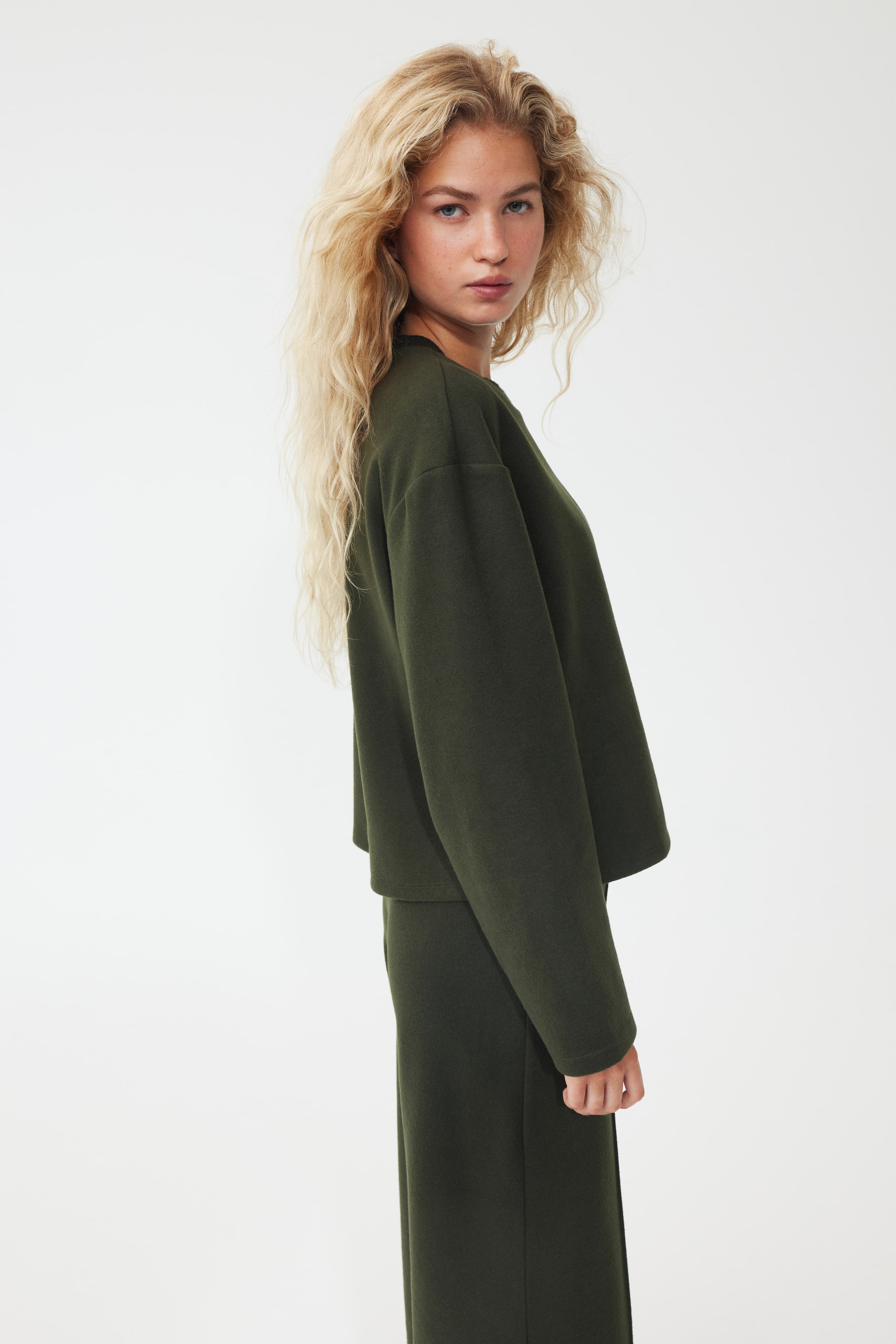 Krátká, objemná žerzejová mikina s měkce česaným povrchem. Má kulatý výstřih s žebrovaným lemem a spuštěná ramena.