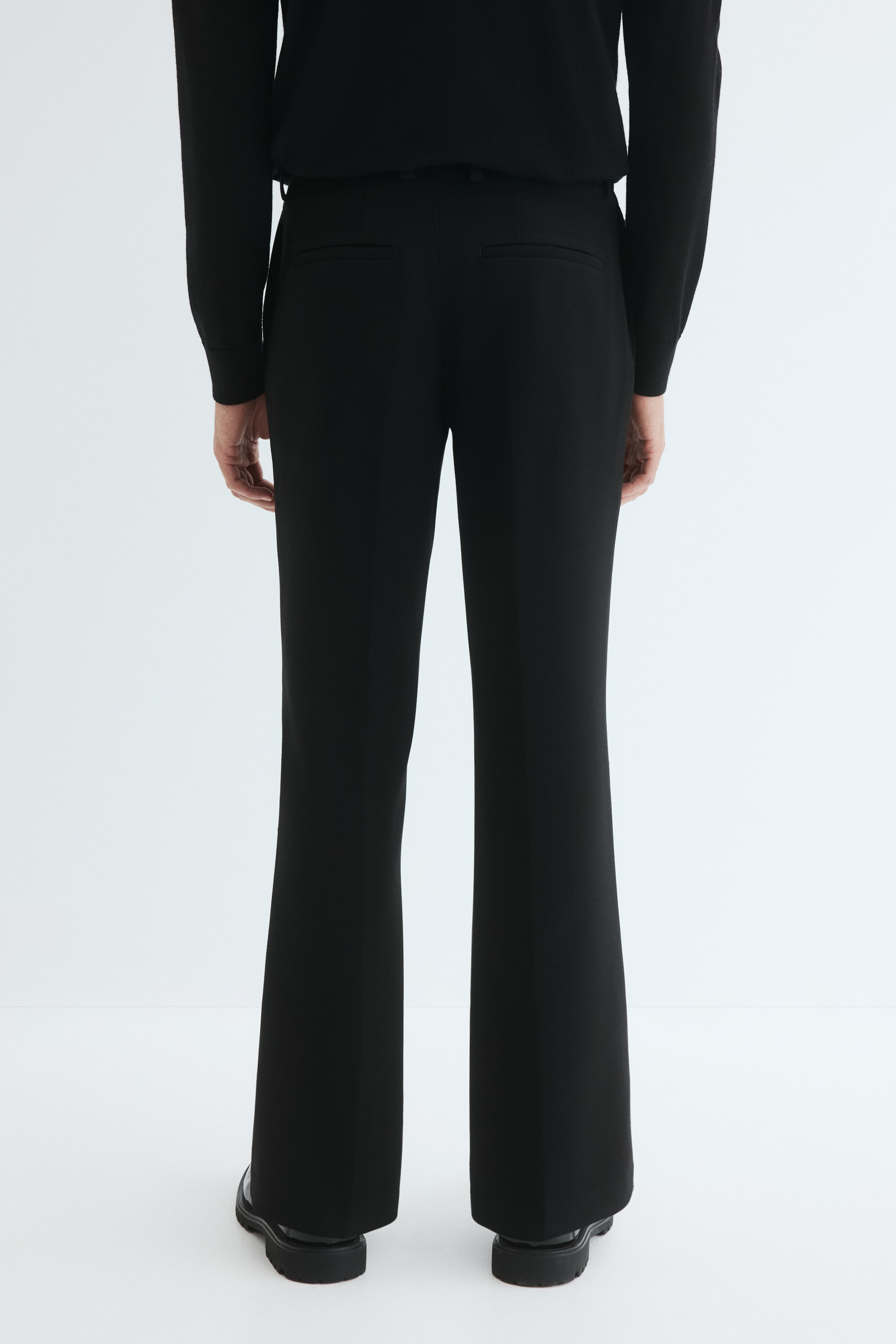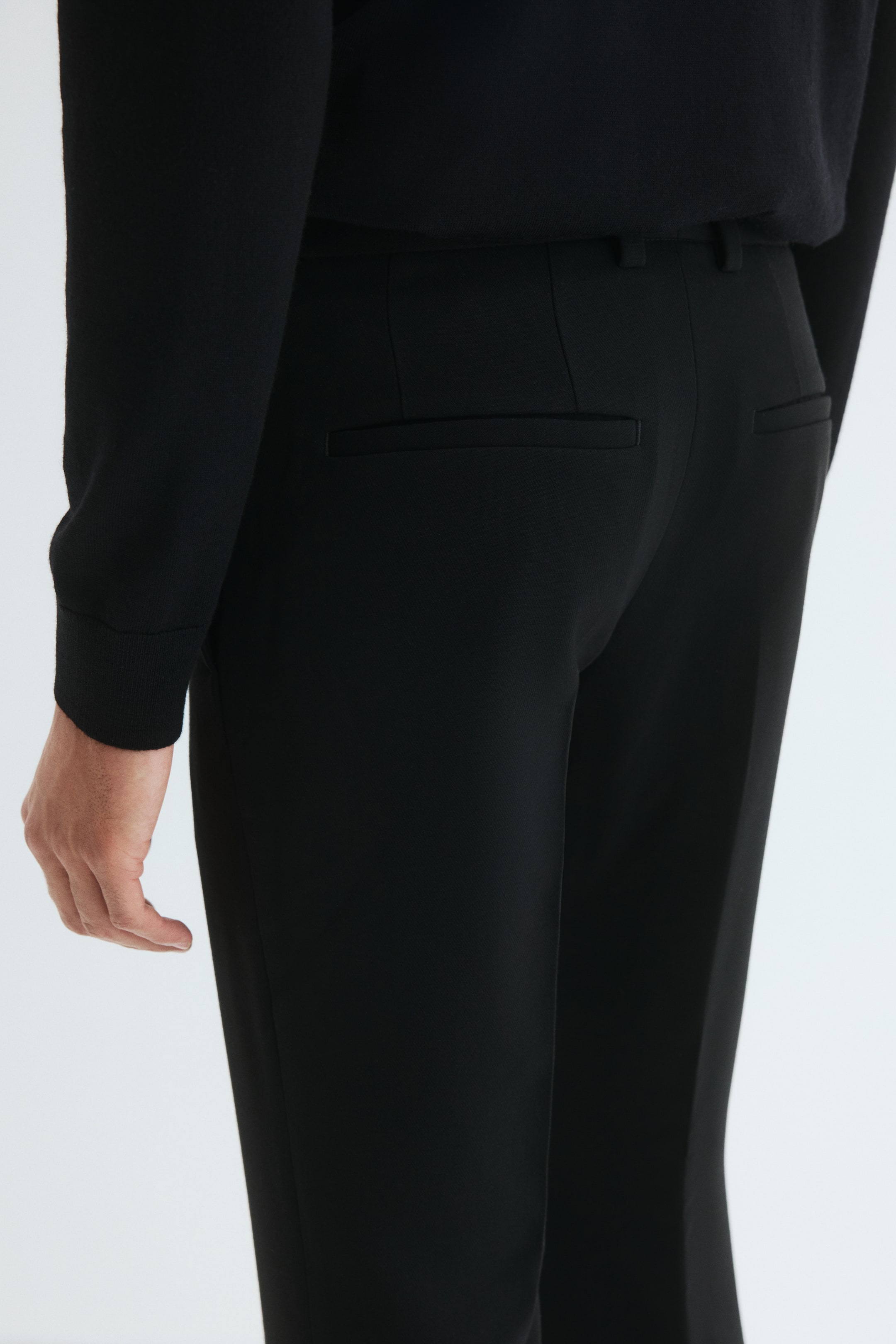 Elegantní kalhoty z měkké tkaniny. Mají poklopec na zip a prodlouženou pasovku se skrytým knoflíkem a zapínáním na háček. Postranní kapsy a zadní výpustkové kapsy. Nohavice s puky se dole mírně rozšiřují. Díky tradičnímu střihu se oděv pohodlně nosí a vytváří klasickou siluetu.