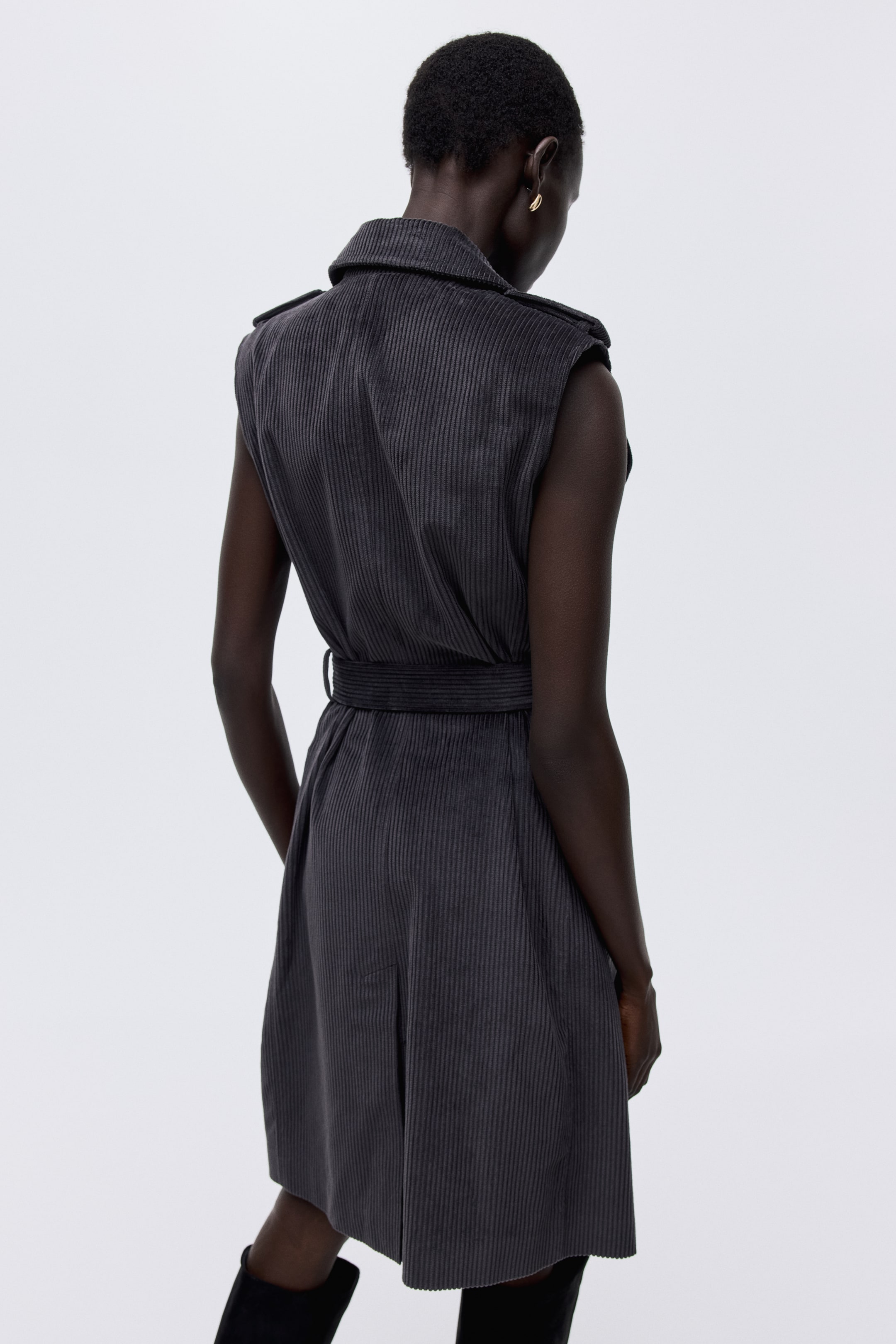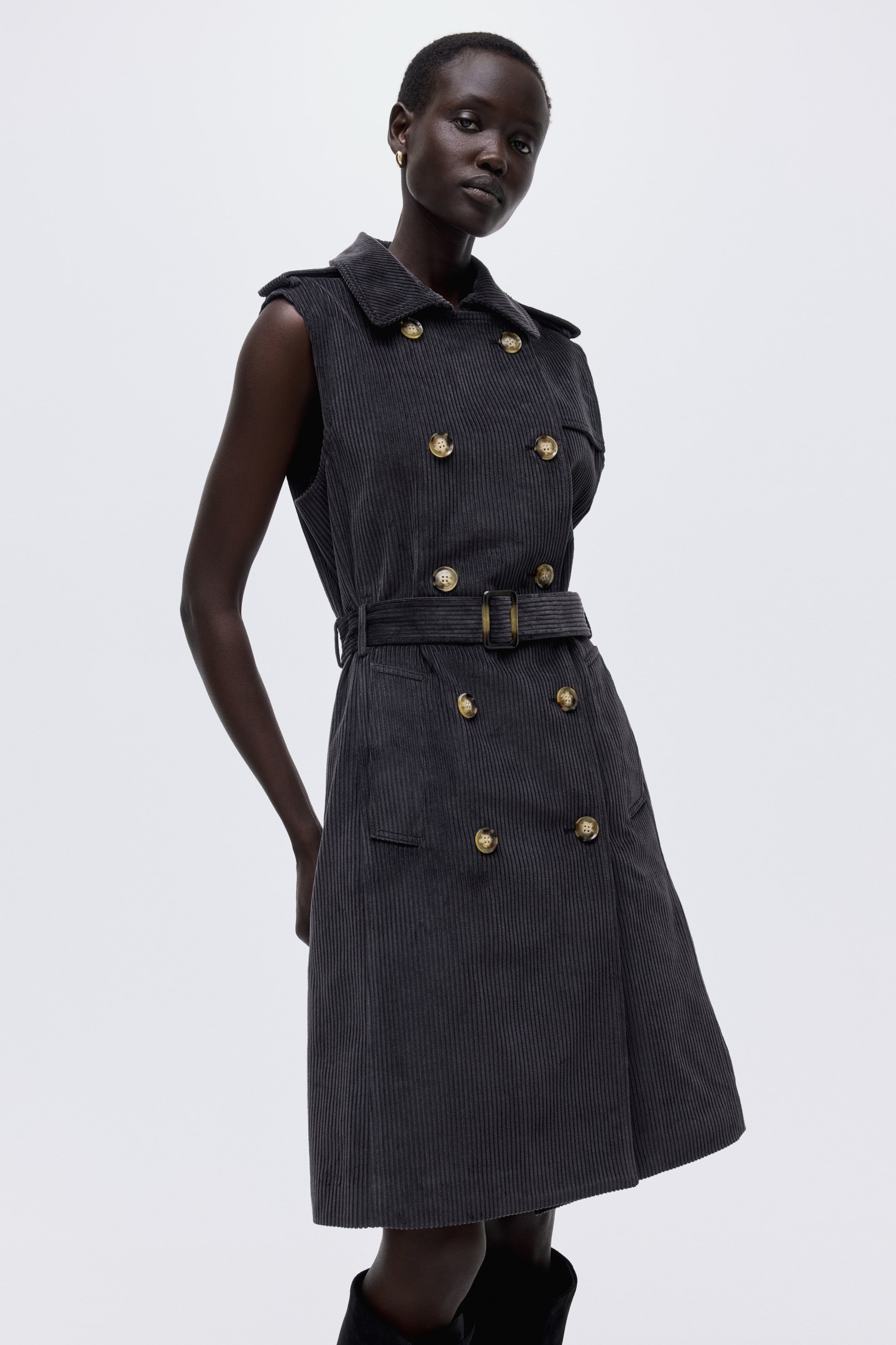 Dvouřadový trenčkot z bavlněného manšestru, dlouhý po kolena. Střih bez rukávů. Má límec, nárameníky s knoflíkem, přední zapínání na knoflíky, boční výpustkové kapsy a snímatelný pásek s plastovou sponou. S podšívkou.