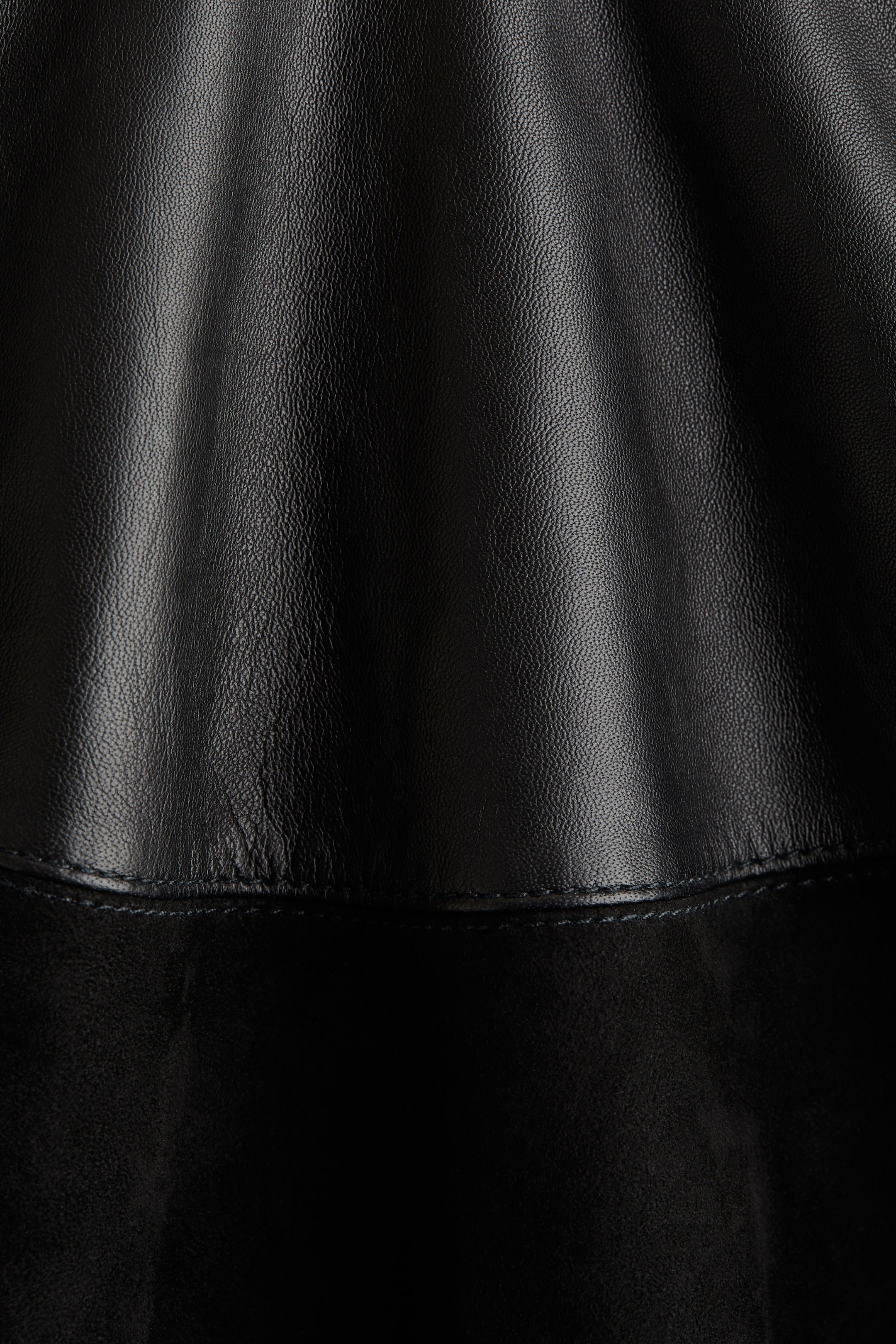 Kolová minisukně vyrobená z měkké kůže, s dolním semišovým dílem. Má klasický pas s úzkou lemovkou a skrytý boční zip se zapínáním na háček. Bez podšívky.