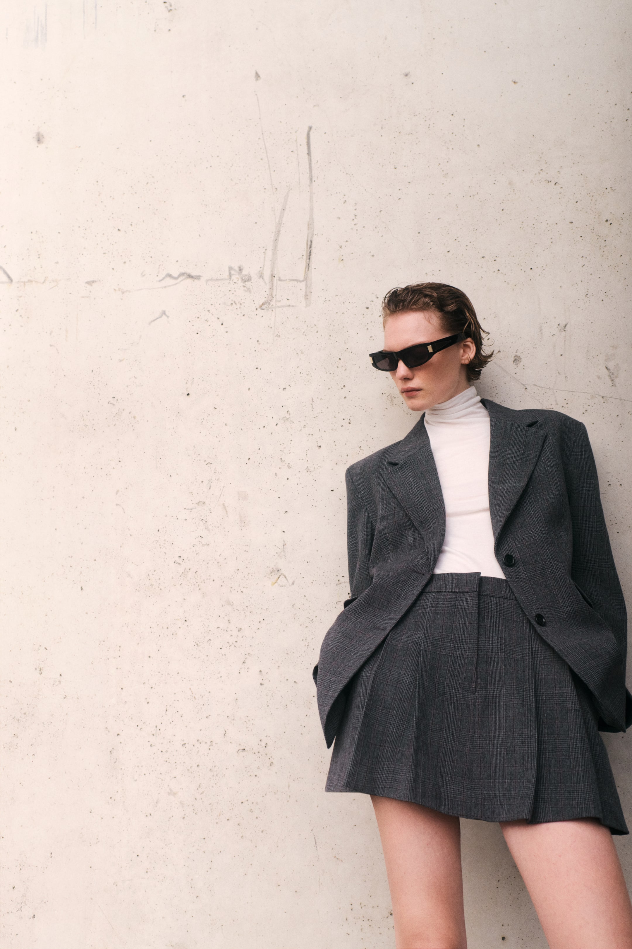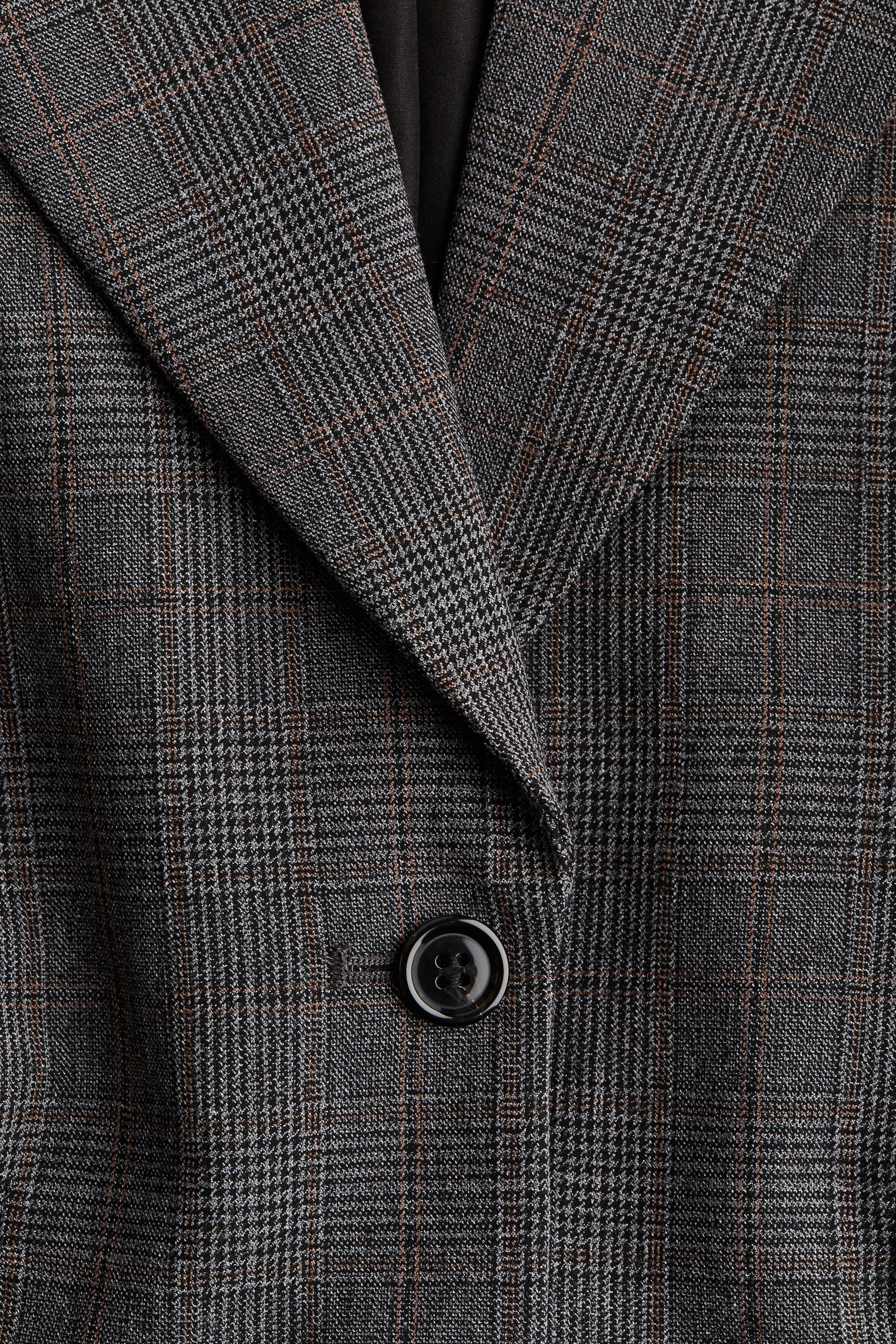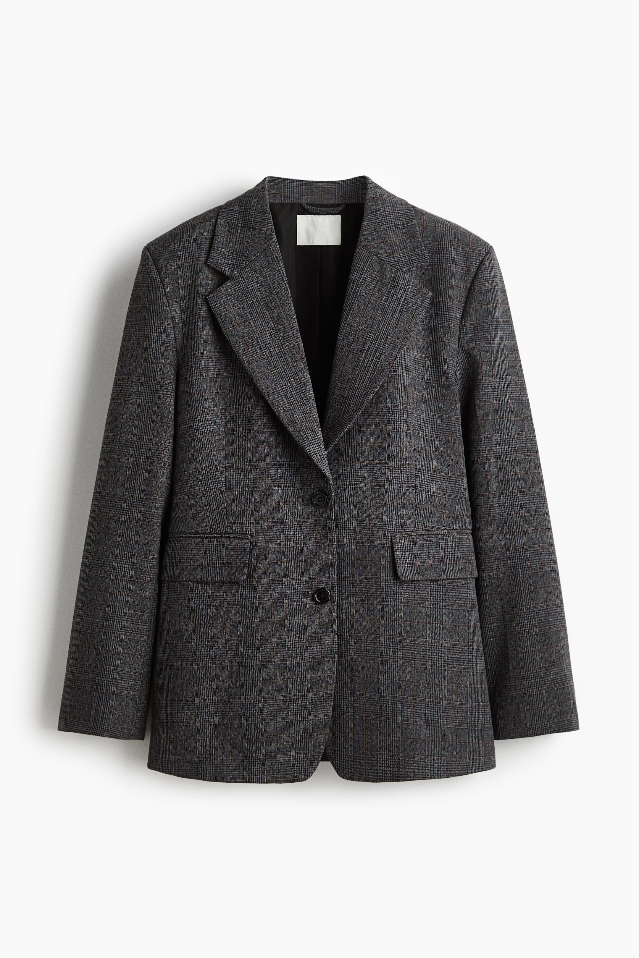 Jednořadové sako z tkaniny. Má fazonové klopy, přední zapínání na dva knoflíky, přední výpustkové kapsy s patkou, ramenní vycpávky a zadní rozparek. S podšívkou.