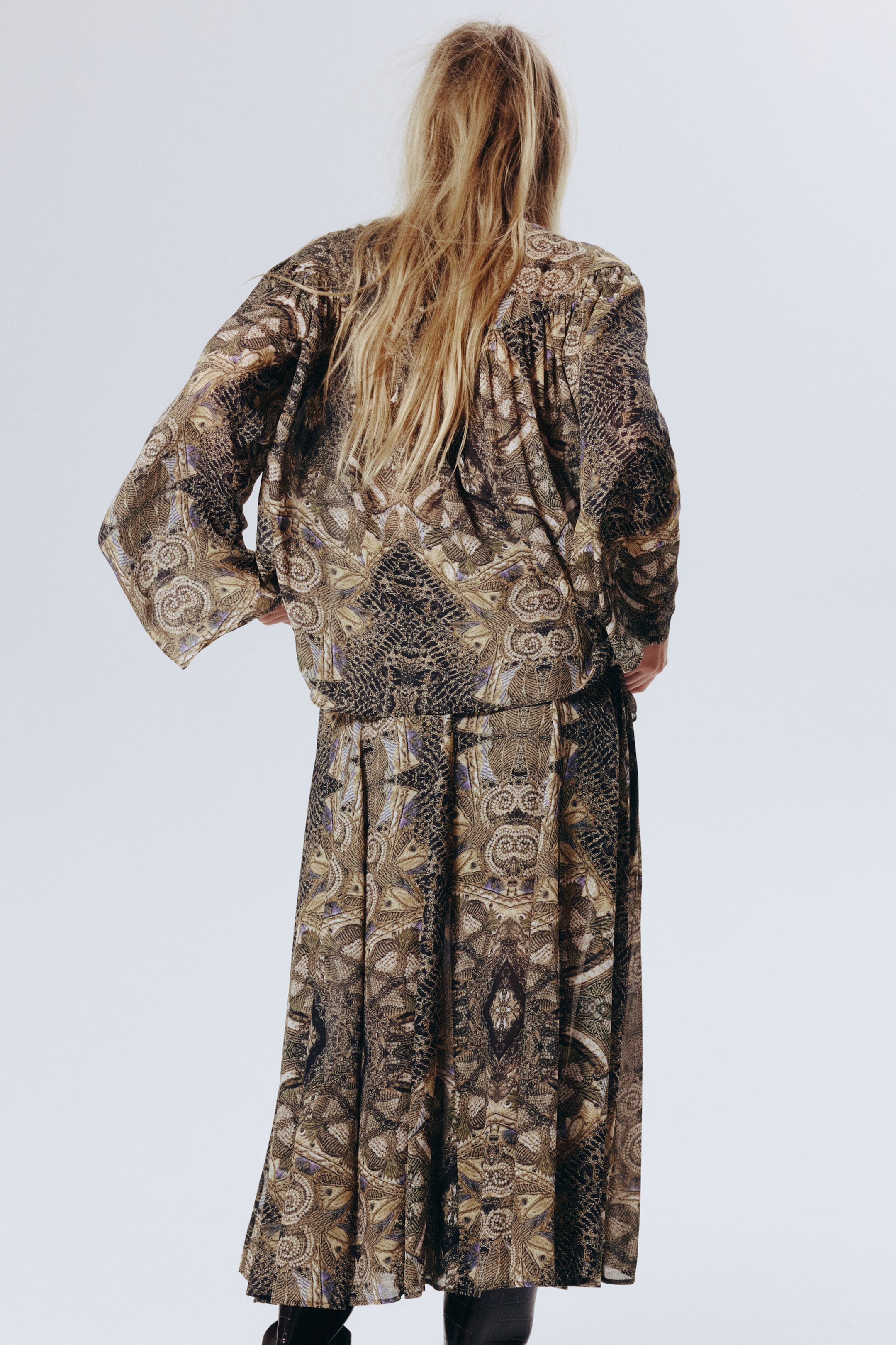 Sukně z krepové tkaniny, dlouhá ke kotníkům. Má vysoký pas, skrytý boční zip se zapínáním na háček a klínové vsadky, které jí dodávají šířku a dokážou ji rozevlát. S podšívkou.